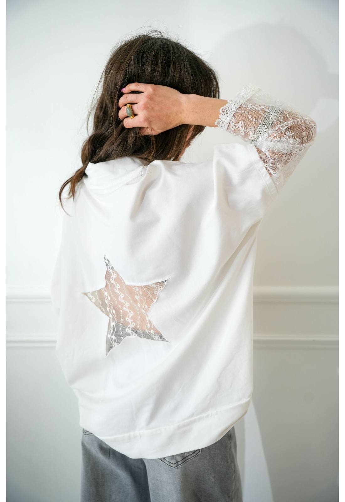 Spitze an den Ärmeln und am Rücken.