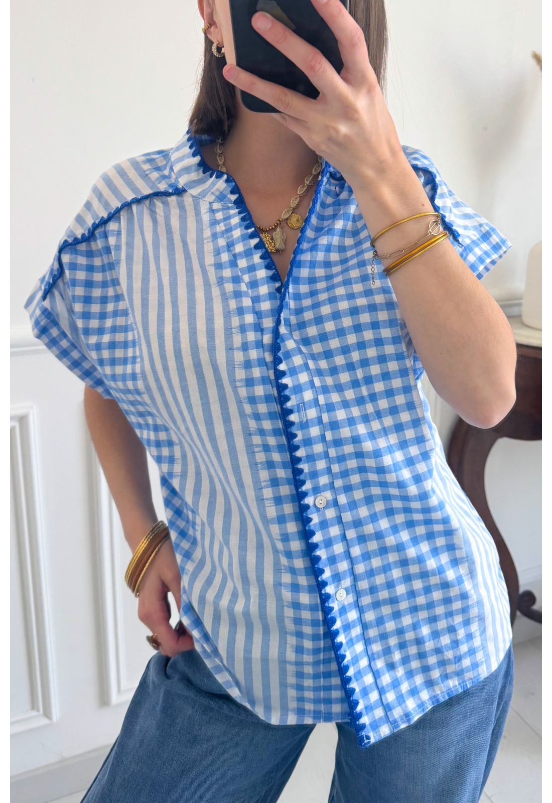 Blau-weiß karierte Bluse.