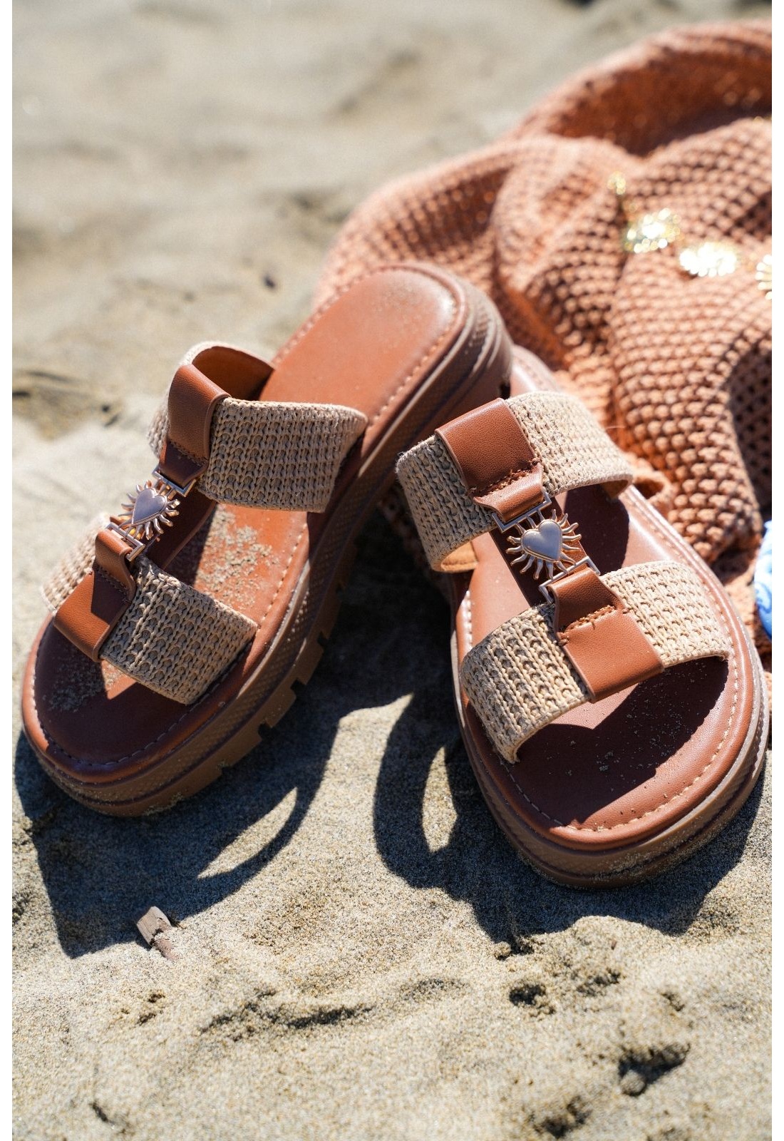 Sandalen mit goldenen Sonnenstrahlen.