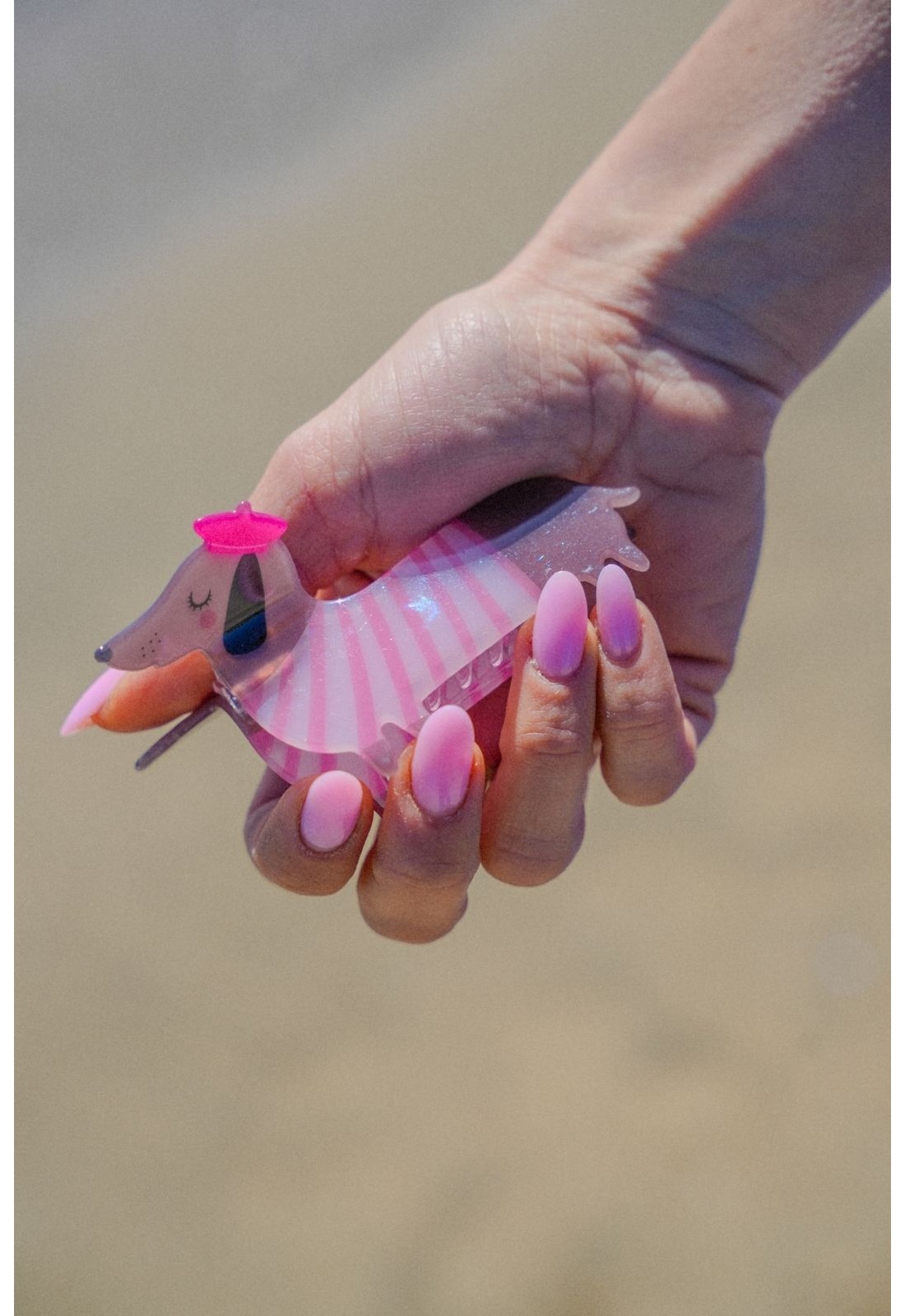 Haarspange. Mit Zeichnung eines rosa gestreiften Hundes mit rosa Baskenmütze.