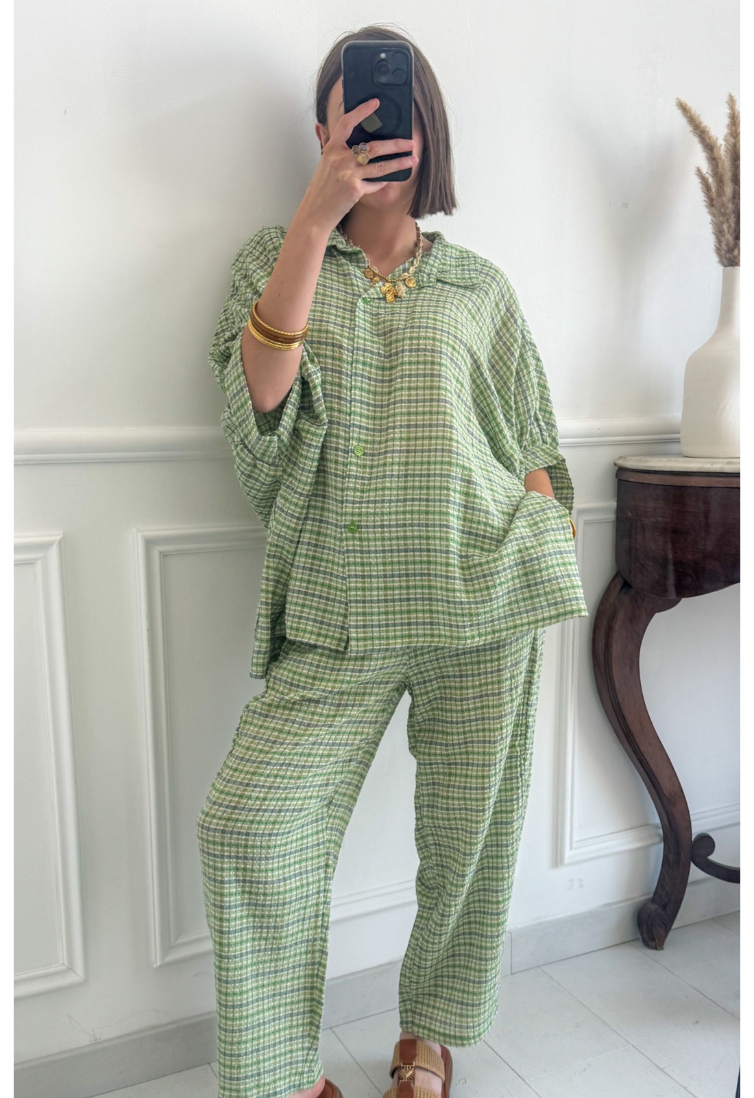 Damenhosen. Grüne und weiße Kacheln. Weiter Schnitt. 2 Taschen. Flüssiges Material. Elastischer Bund. Zusammensetzung: 70 % Baumwolle – 30 % Viskose Hergestellt in Italien. Das Model trägt Einheitsgröße und ist 160 cm groß.