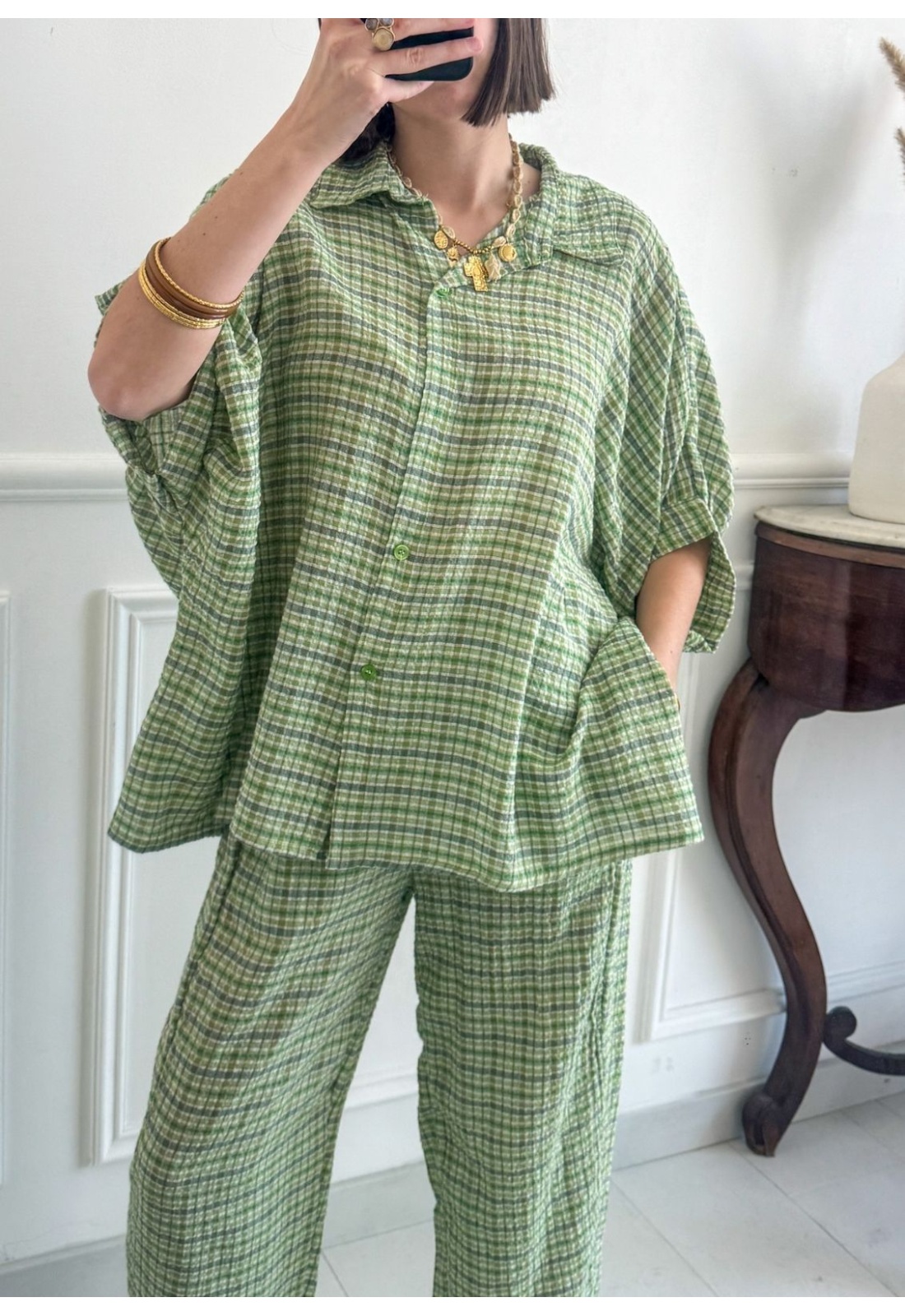 Damenhosen. Grüne und weiße Kacheln. Weiter Schnitt. 2 Taschen. Flüssiges Material. Elastischer Bund. Zusammensetzung: 70 % Baumwolle – 30 % Viskose Hergestellt in Italien. Das Model trägt Einheitsgröße und ist 160 cm groß.