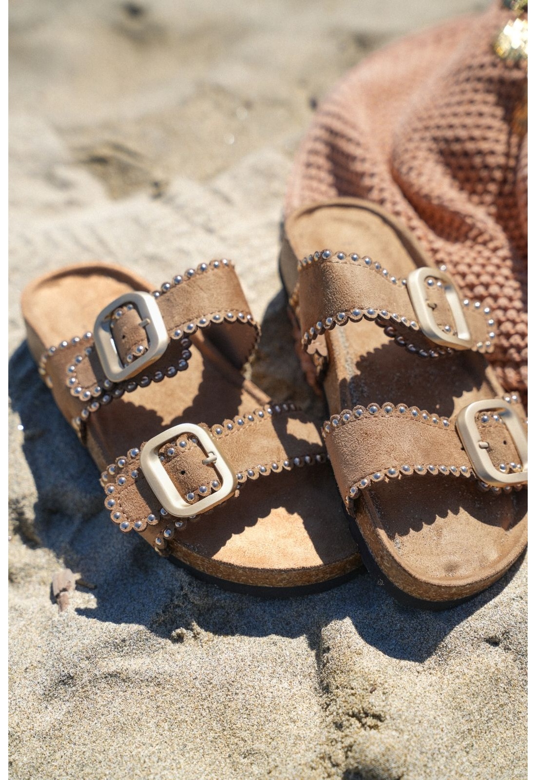 Sandalias de mujer. Material efecto ante en color topo. Sandalias con hebillas doradas para apretar el zapato. Suela plana color camel. Modelo bajo. Se recomienda tomar tu talla habitual.