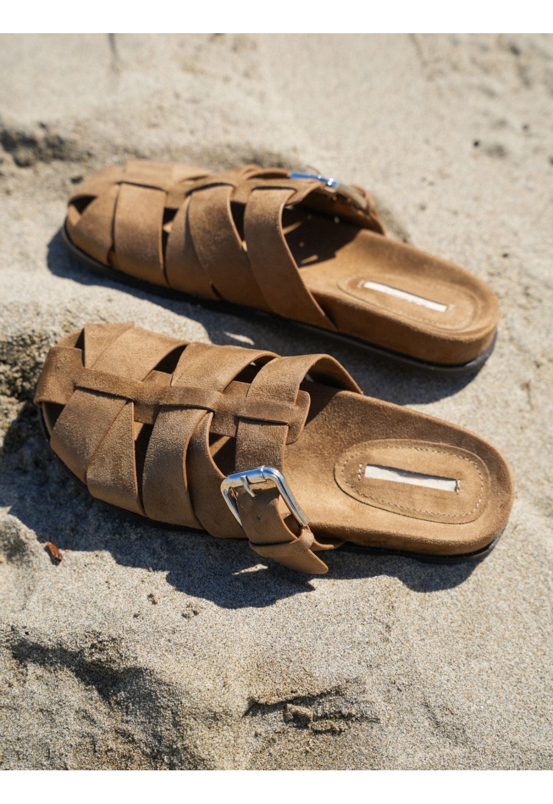 Sandalias de mujer. Material efecto ante en color beige. Sandalias efecto cruzado con hebilla plateada para ceñir el zapato. cordones color crudo. Suela plana color camel. Modelo bajo. Se recomienda tomar tu talla habitual.