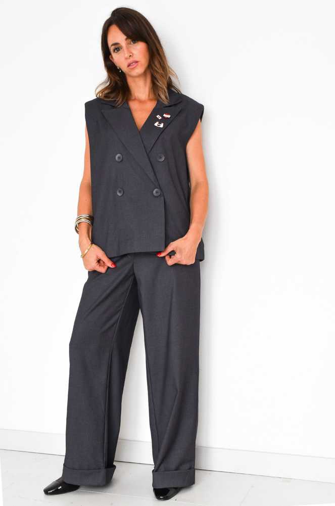 Chaqueta de mujer. De color gris carbón. Marca Banditas. Cuello de solapa. Sin mangas. Corte clásico. Composición: 64% Poliéster. 33 % viscosa. 3 % elastano. Fabricado en Italia. El modelo lleva una talla 1 y mide 160 cm.