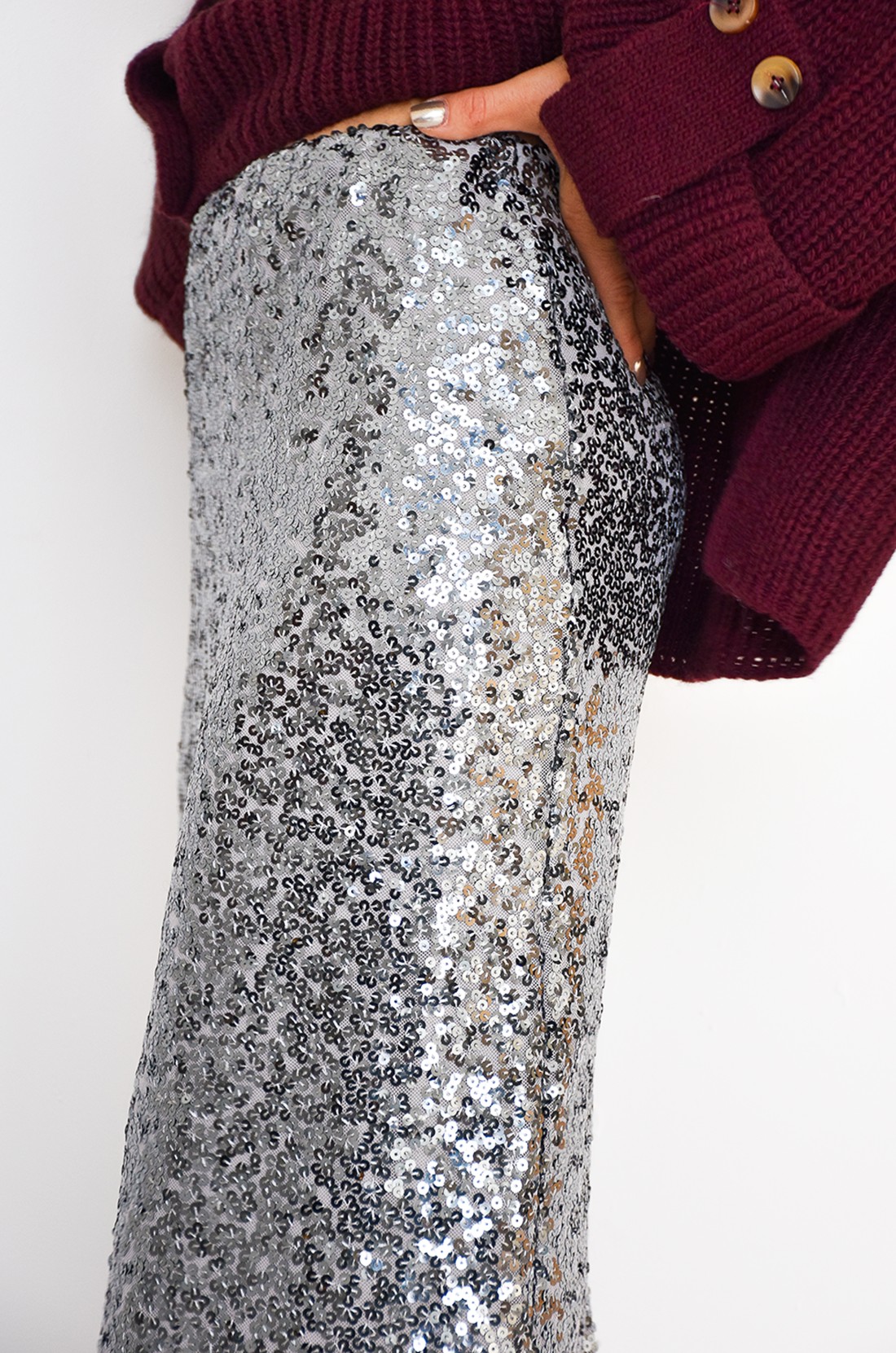 falda de mujeres. en lentejuelas. de color plateado. elástico en el tamaño. largo. Corte recto. largo revestimiento interior. Composición: 100% poliéster. fabricado en Italia. El modelo tiene un tamaño único y mide 160 cm.