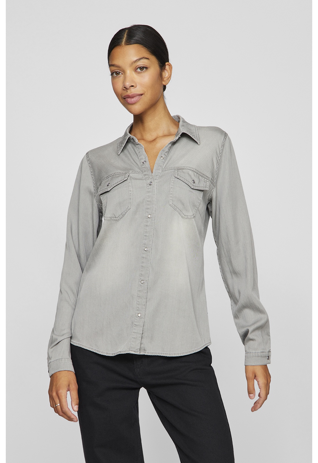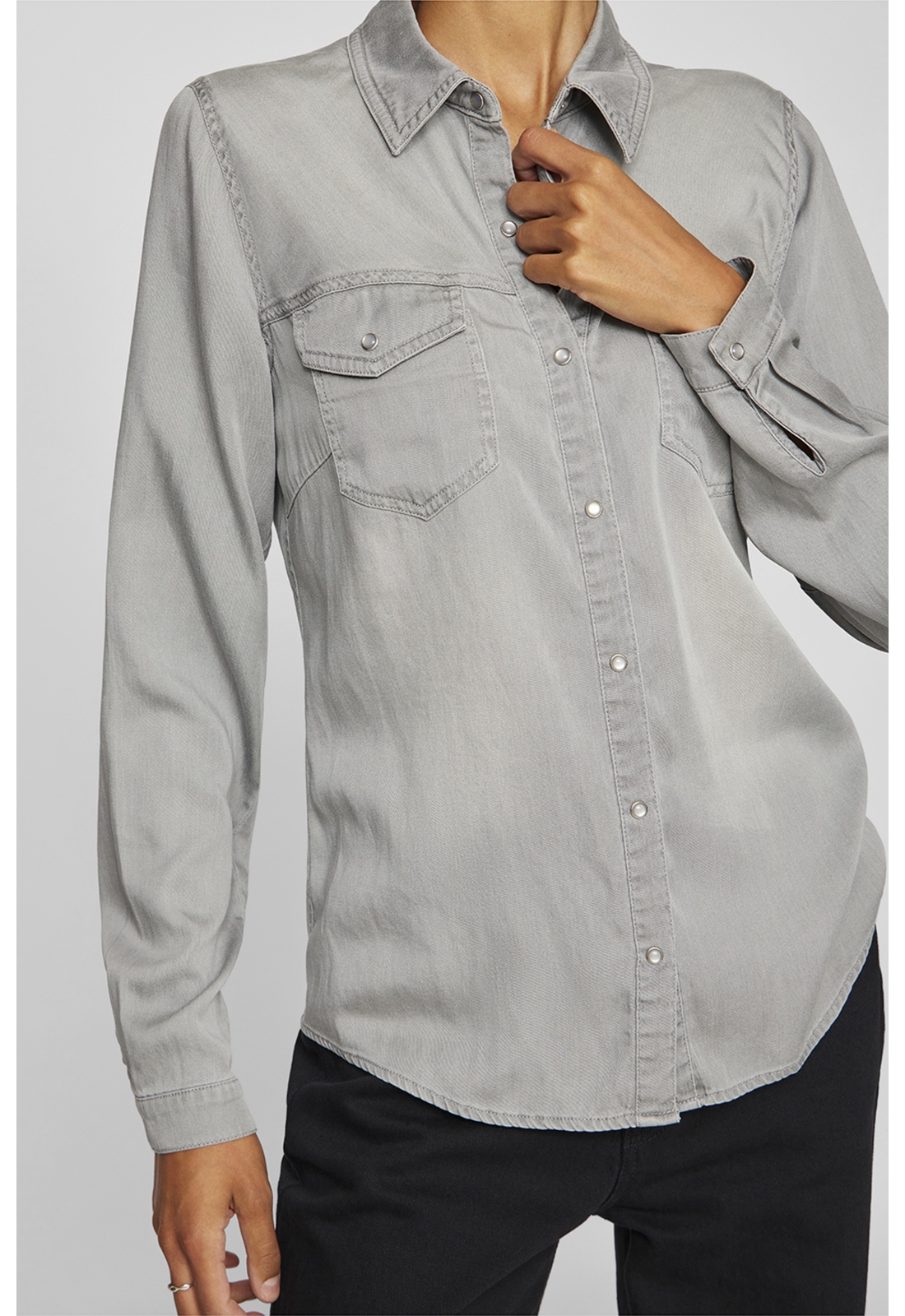 Camisa DENIM GRIS CLARO Cuello camisero Manga larga Cierre de botones Bolsillo en el pecho Corte regular fit Composición: 70% TENCEL™ Lyocell, 30% Algodón - Orgánico