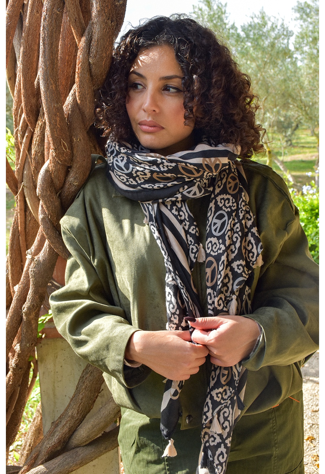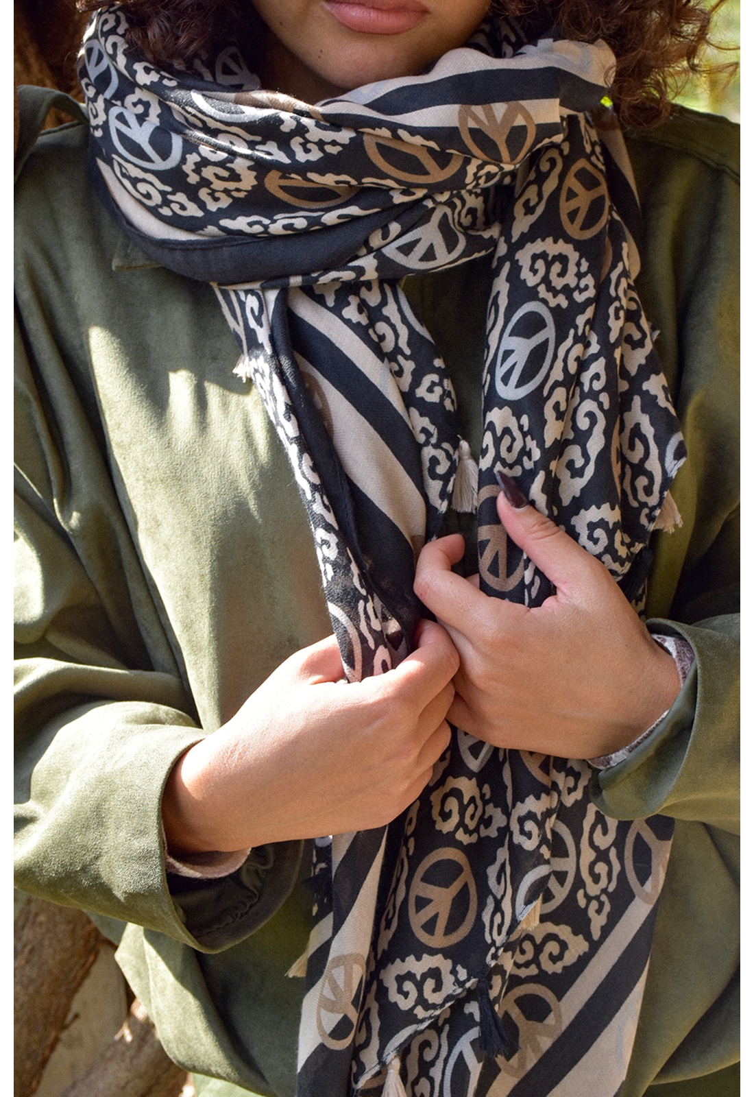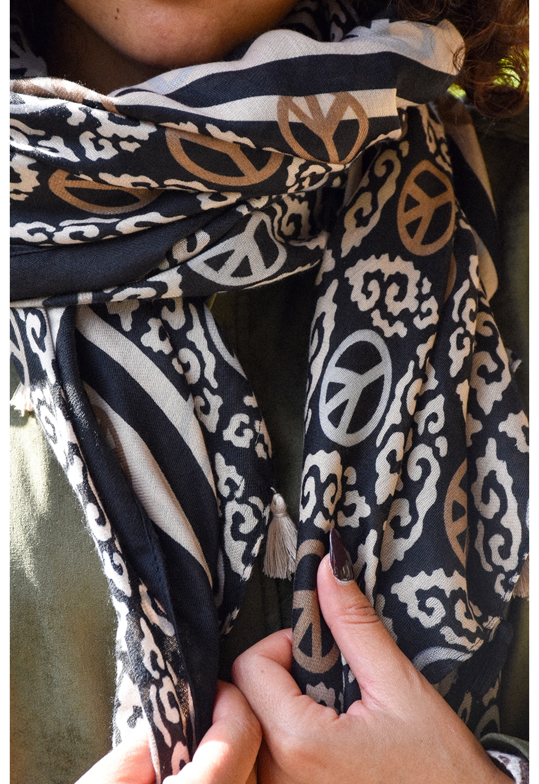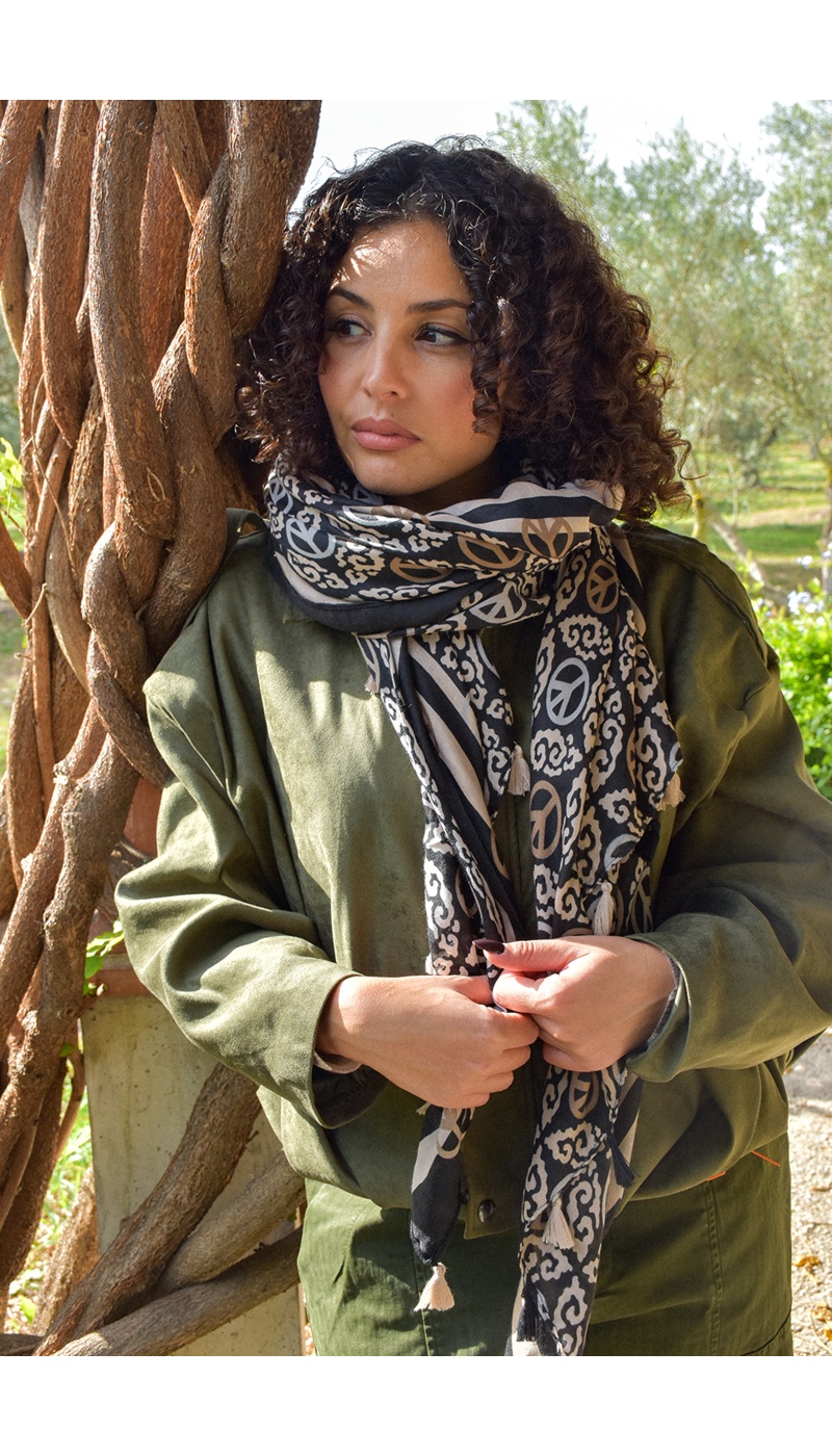 Foulard pour femmes.Grand format.De couleur écru, beige et noir.Imprimé divers peace.Avec pompon sur les côtés. Composition :100% Viscose.Dimensions :85x185cm