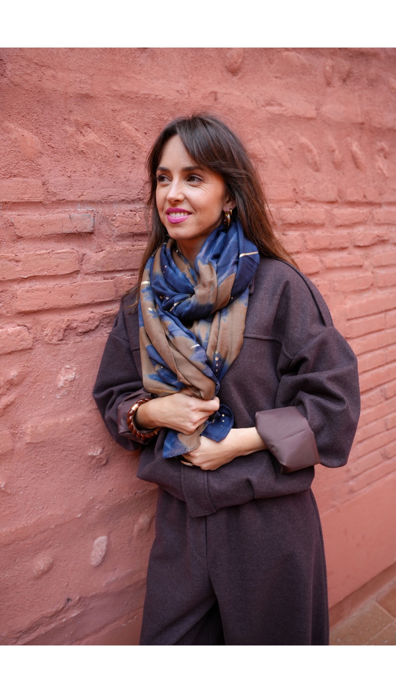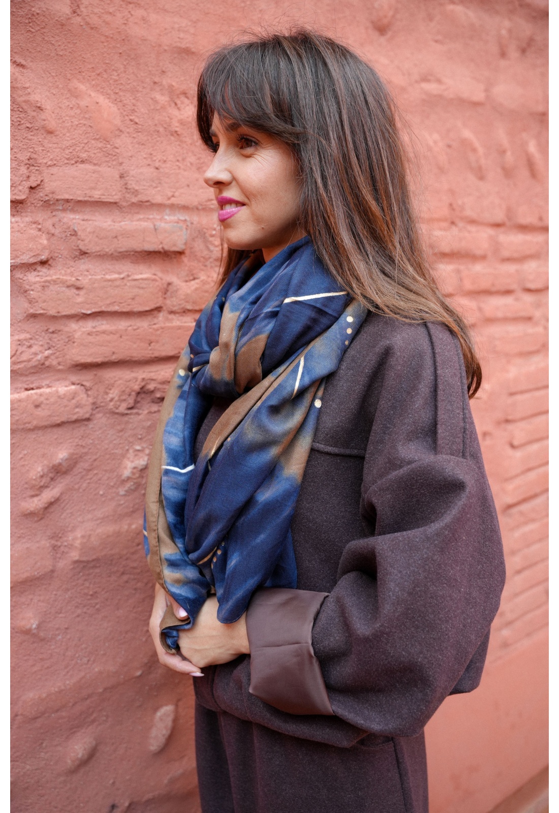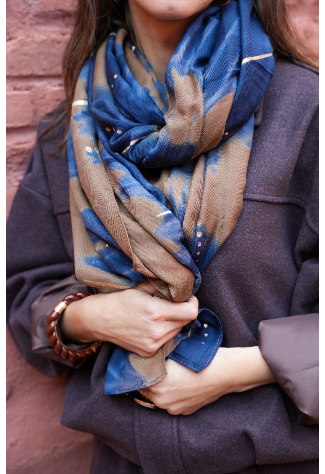 Echarpe pour femmes.De couleur camel et marine.Imprimé tie and dye.Avec détails dorés.Composition :100% Polyester.