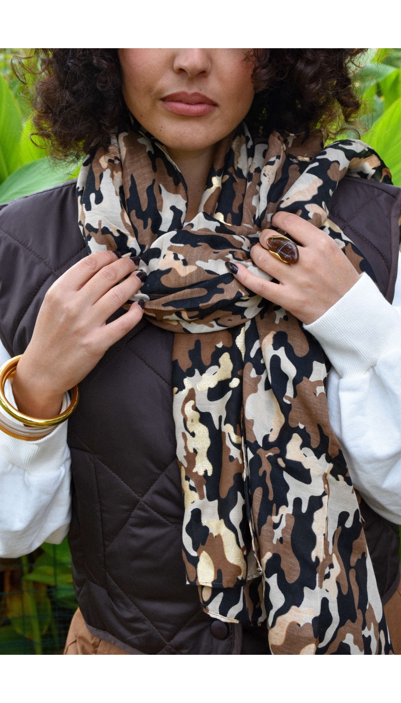 Foulard pour femmes.De couleur beige, noir et marron.Avec touches dorées.Composition :100% Polyester.