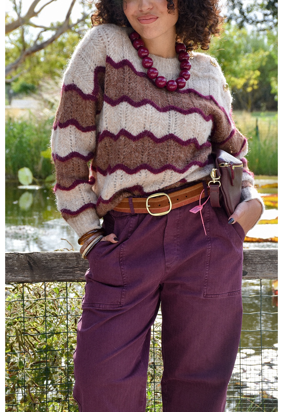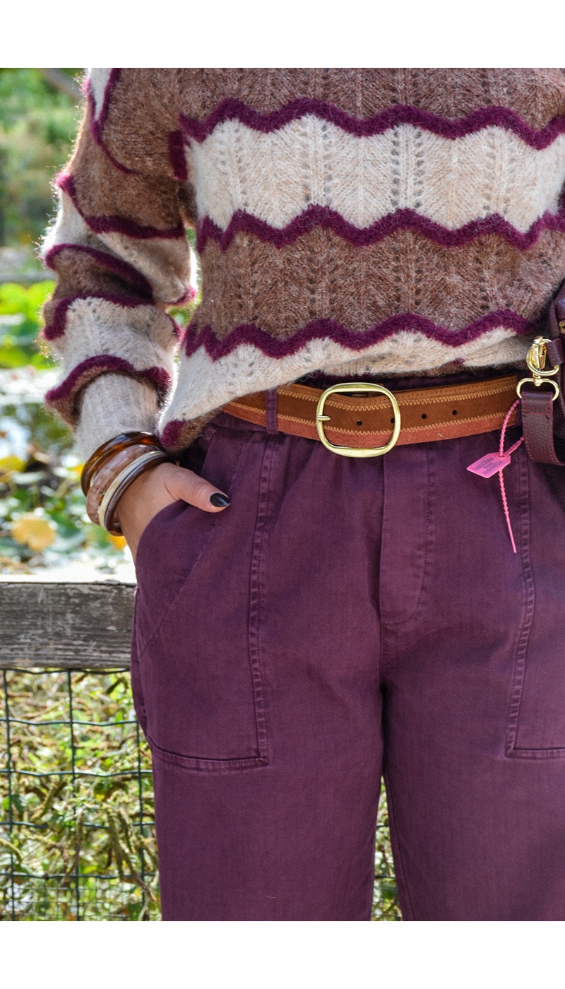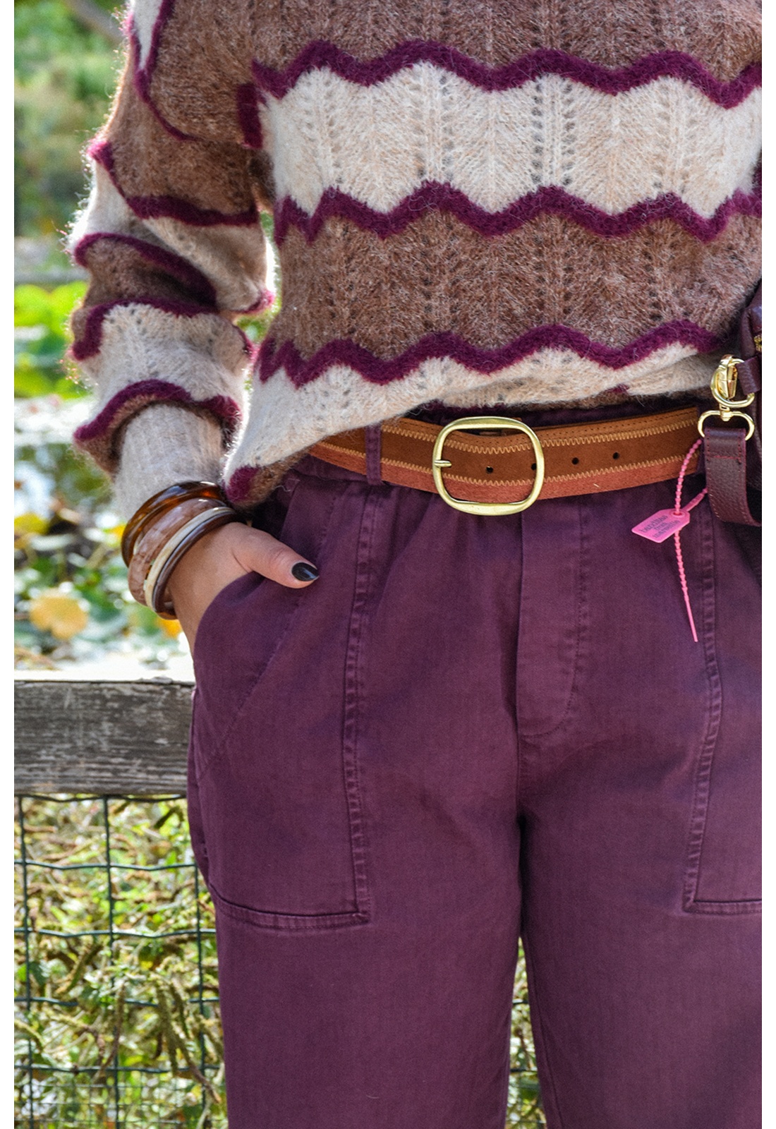 Ceinture pour femmes.De couleur camel.Avec surpiqures écrues.En daimBouclerie dorée.Ajustable sur plusieurs trous.