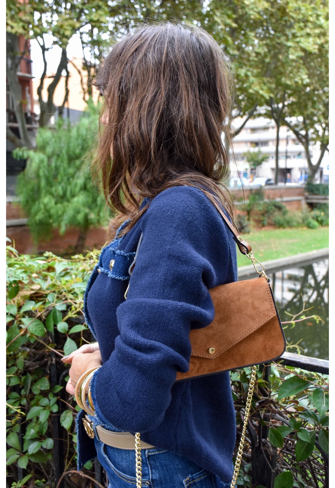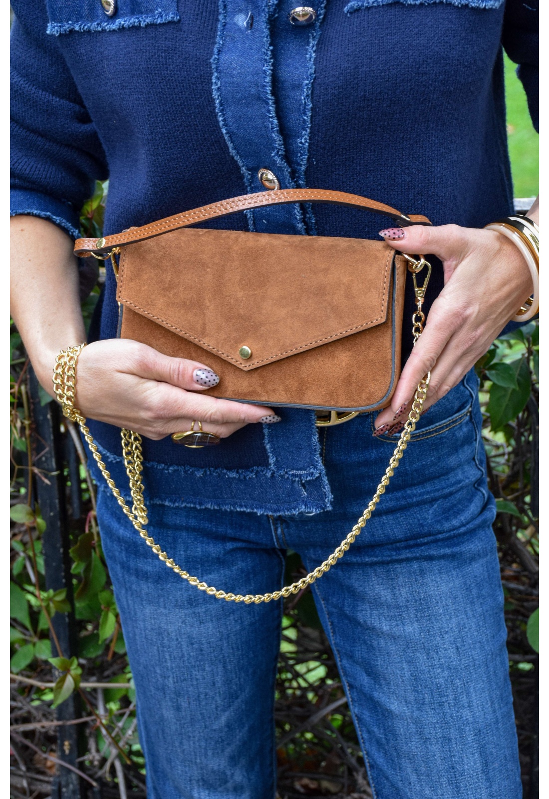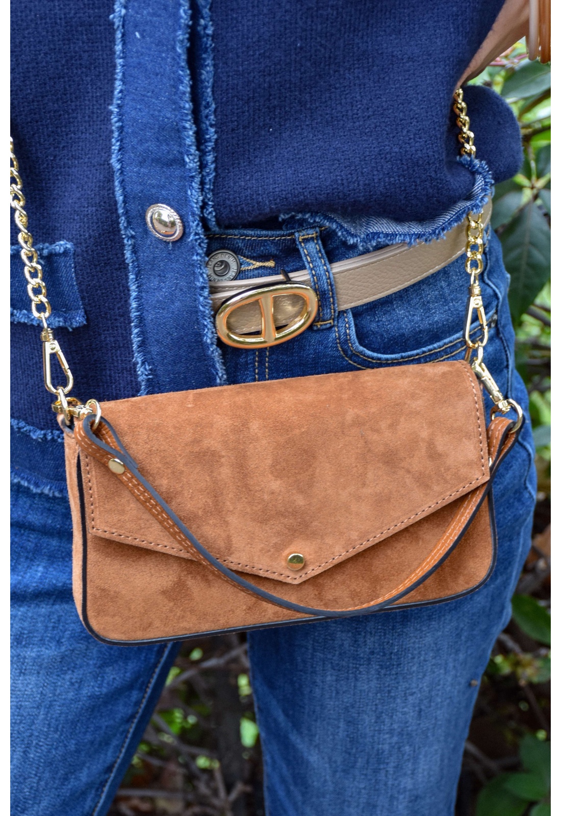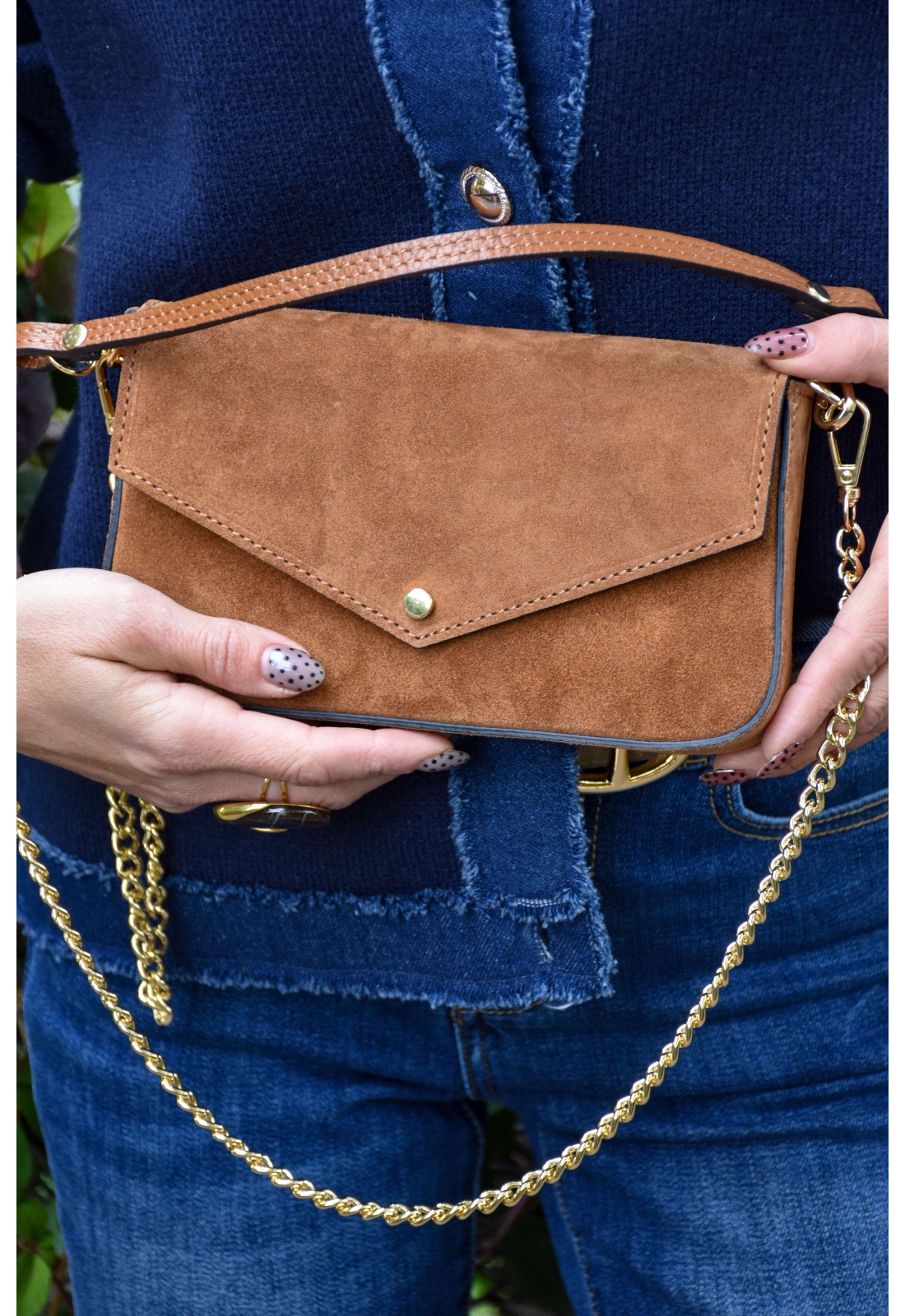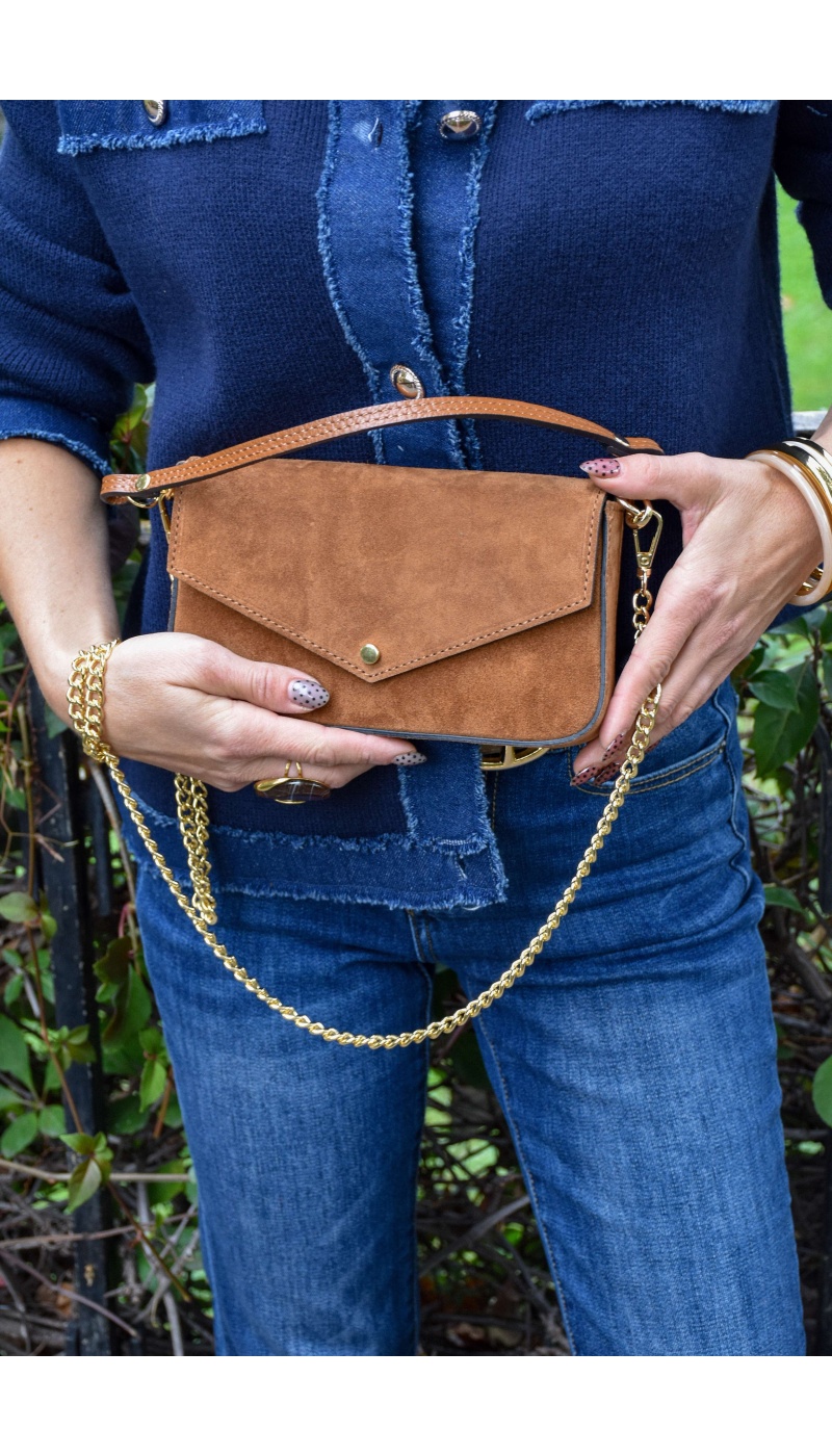 Pochette pour femmes.De couleur cognac.En daim.Bouclerie dorée.Petite anse amovible.Bandoulière en chaine amovible.Doublure intérieure noire avec une poche plaquée.Se ferme par un bouton aimanté.Composition :100% Cuir.Fabriqué en Italie.