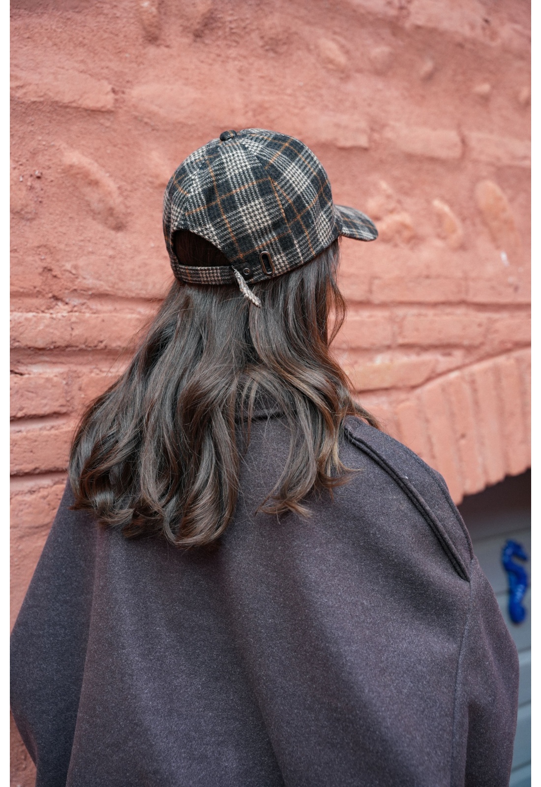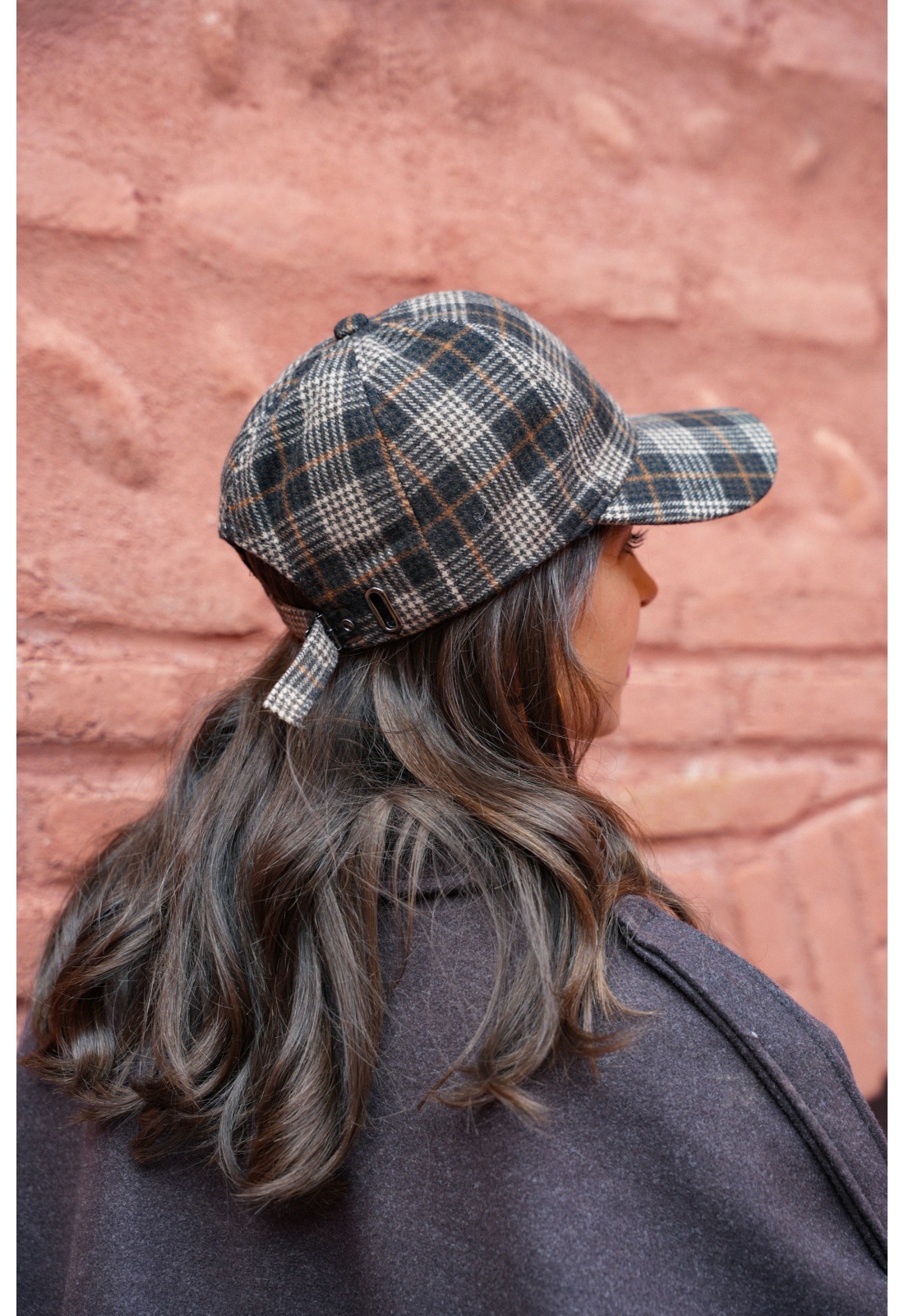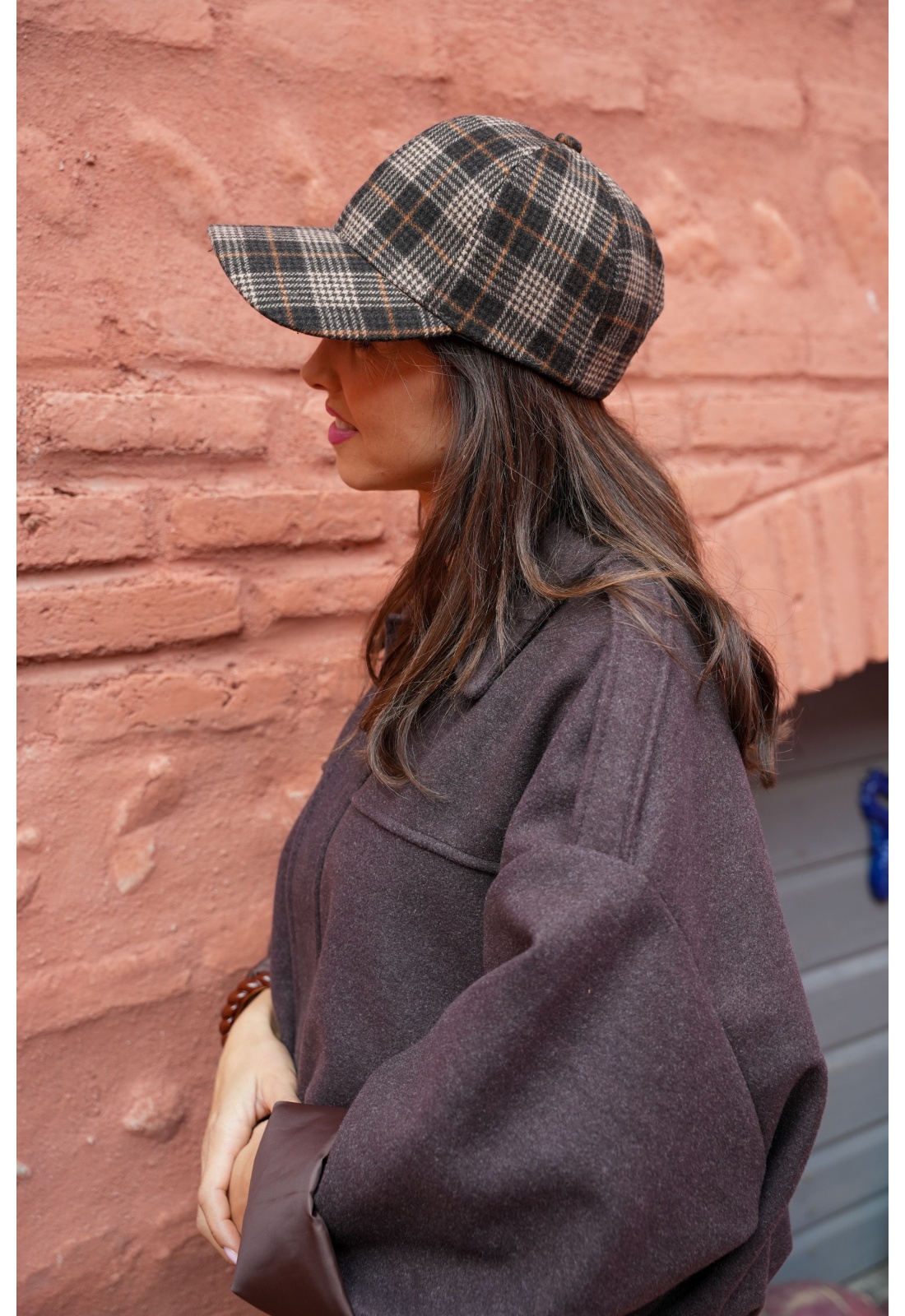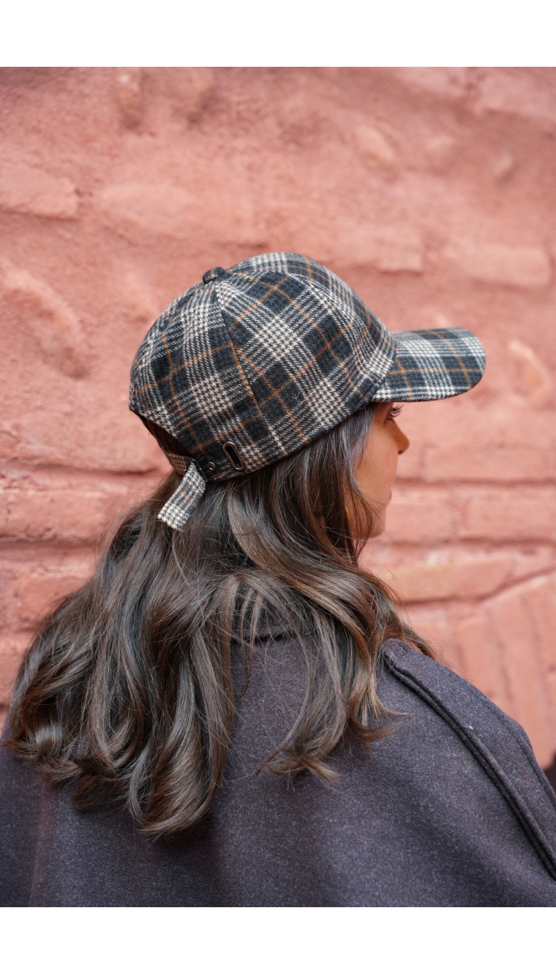Casquette pour femmes.De couleur marron.A carreaux.En laine.Réglable à l'arrière.Composition :50% Polyester.50% Laine.