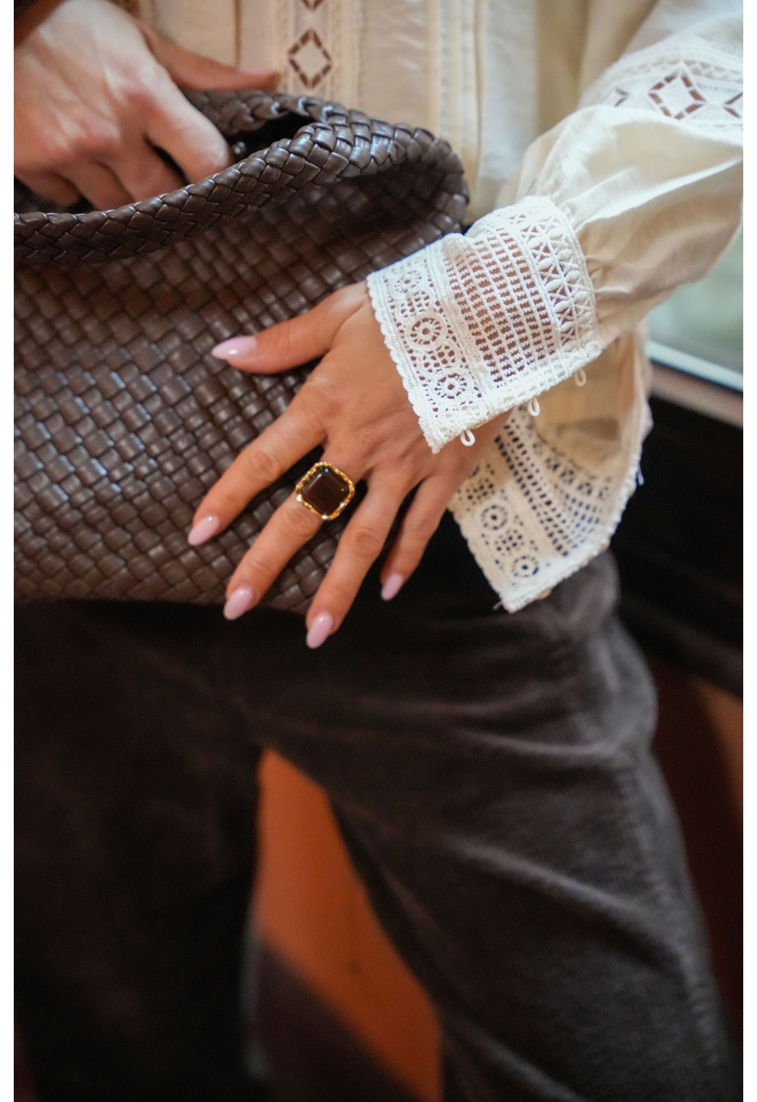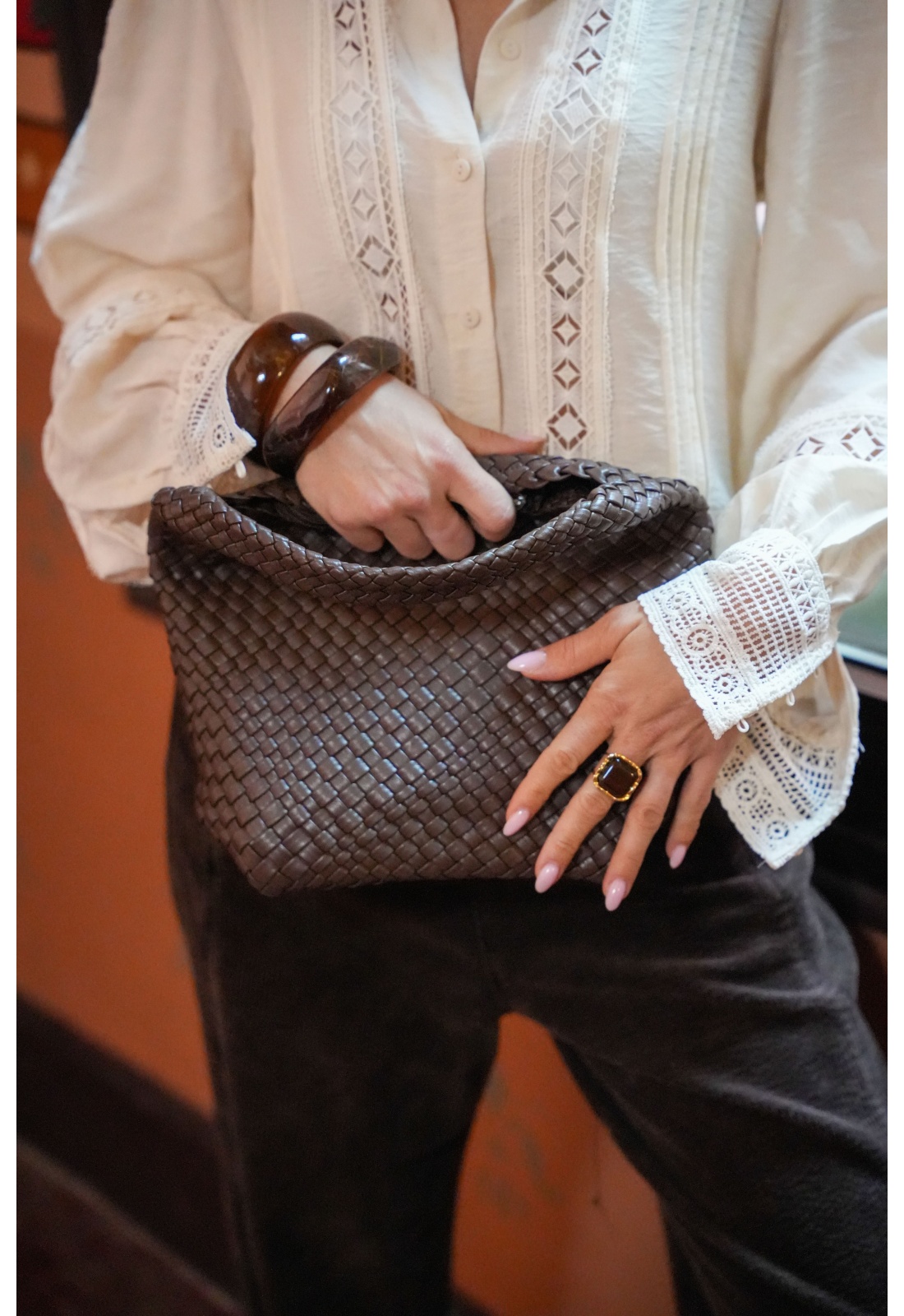 Sac pour femmes.De couleur chocolat.En simili.Tressé.Forme de seau.Avec une anse.Avec pochette zippée.Bandoulière amovible et réglable.Se ferme par zip.