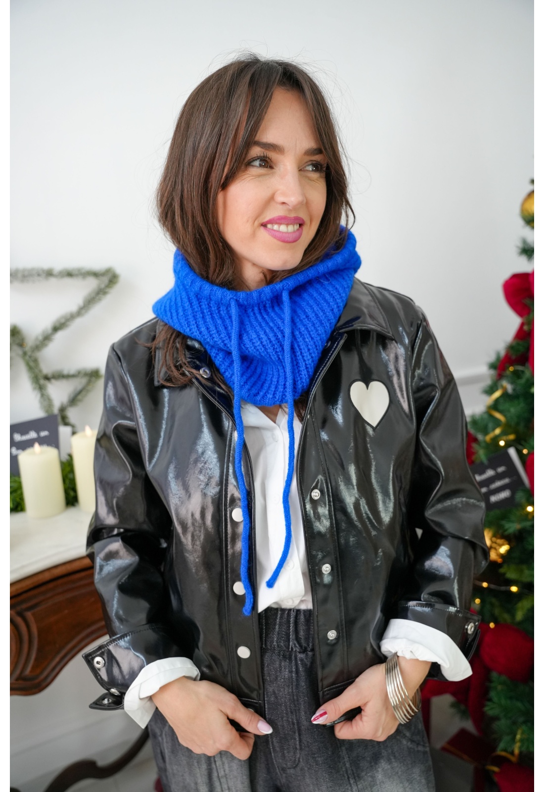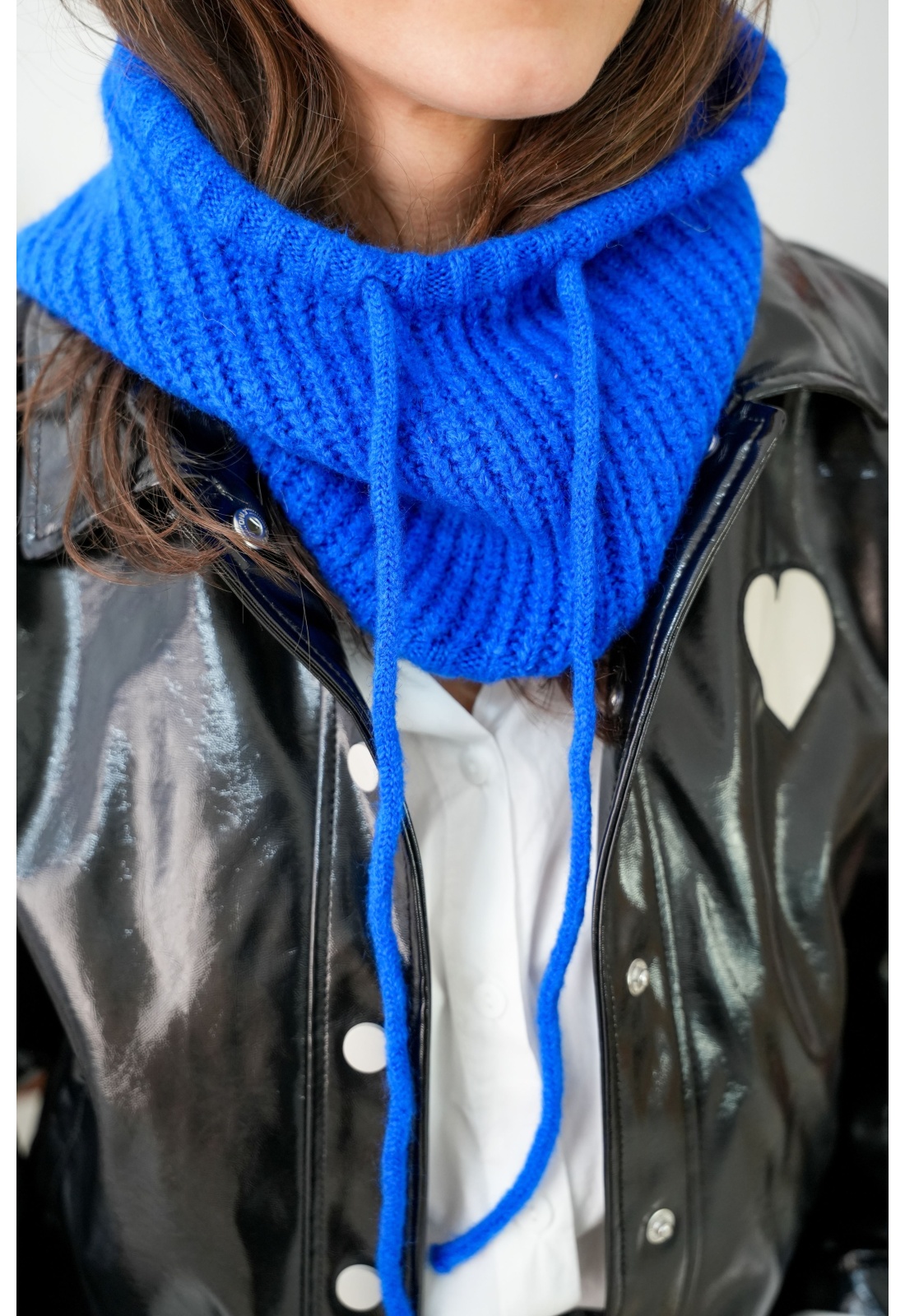 Cagoule pour femmes.De couleur bleu roi.En maille côtelée.Avec 2 lacets.Matière douce.Ne gratte pas.Composition :29% Polyamide.57% Acrylique.14% Laine.Fabriquée en Italie.Nos cagoules sont tailles uniques.
