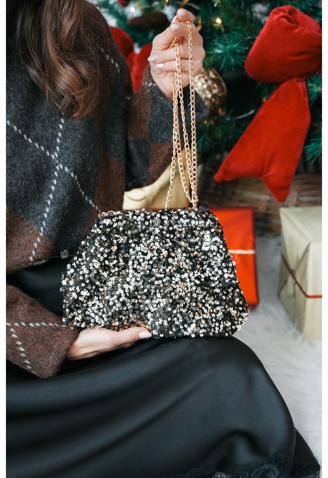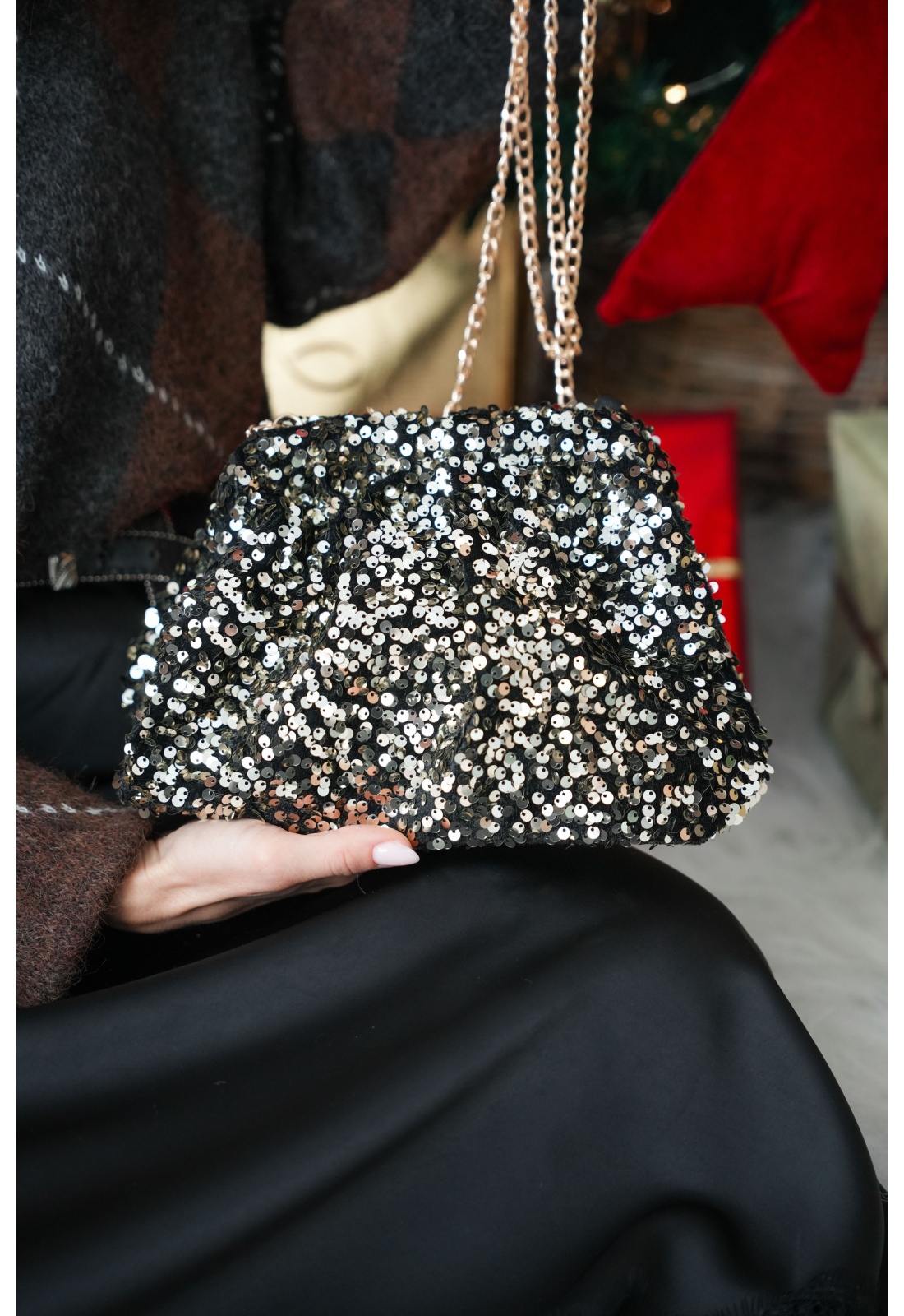 Sac pour femmes.De couleur noir, en velours.Avec sequins dorés.Type bourse.Bandoulière en chaîne dorée amovible.Doublure intérieure noire.Fermeture flex frame.Composition :100% Polyester.Dimensions :Longueur : 25cmHauteur : 15cm