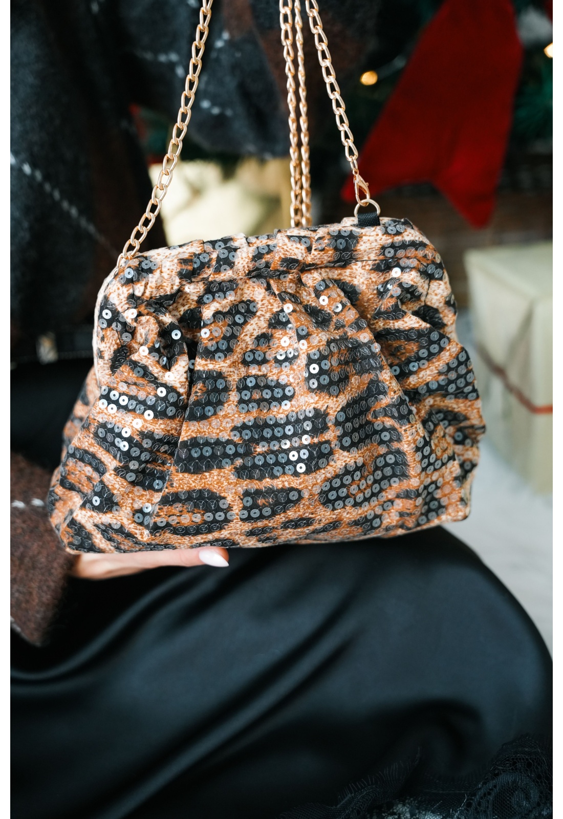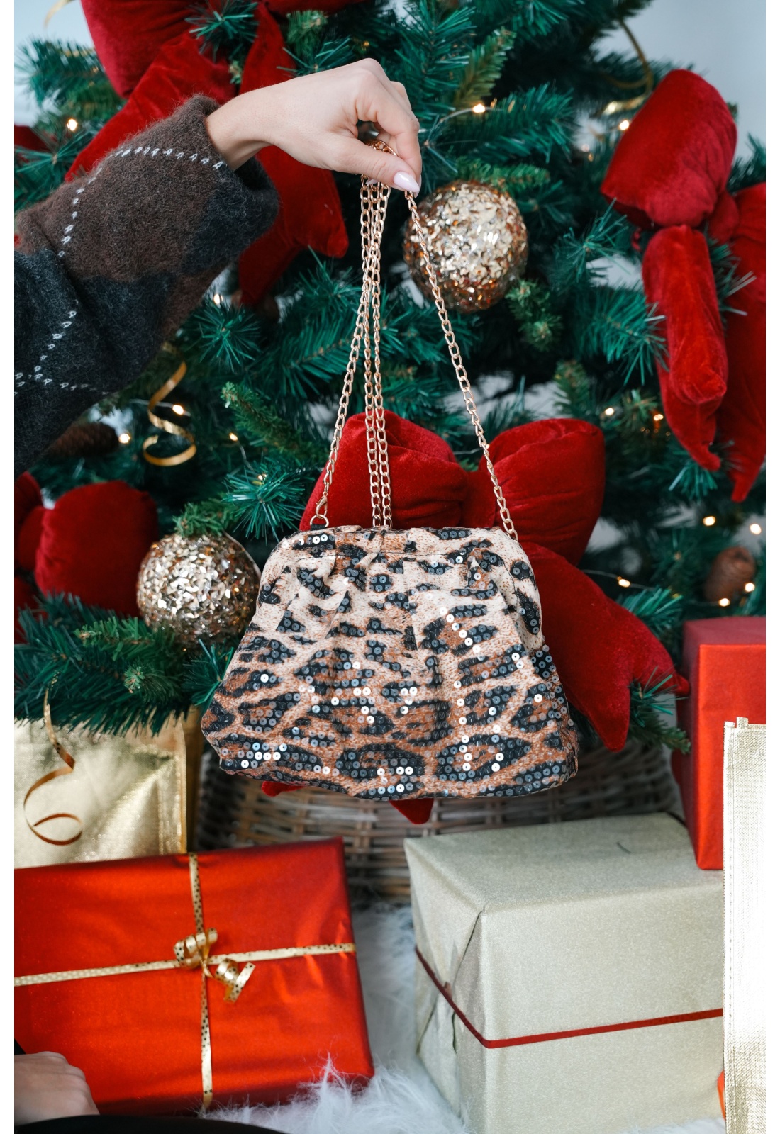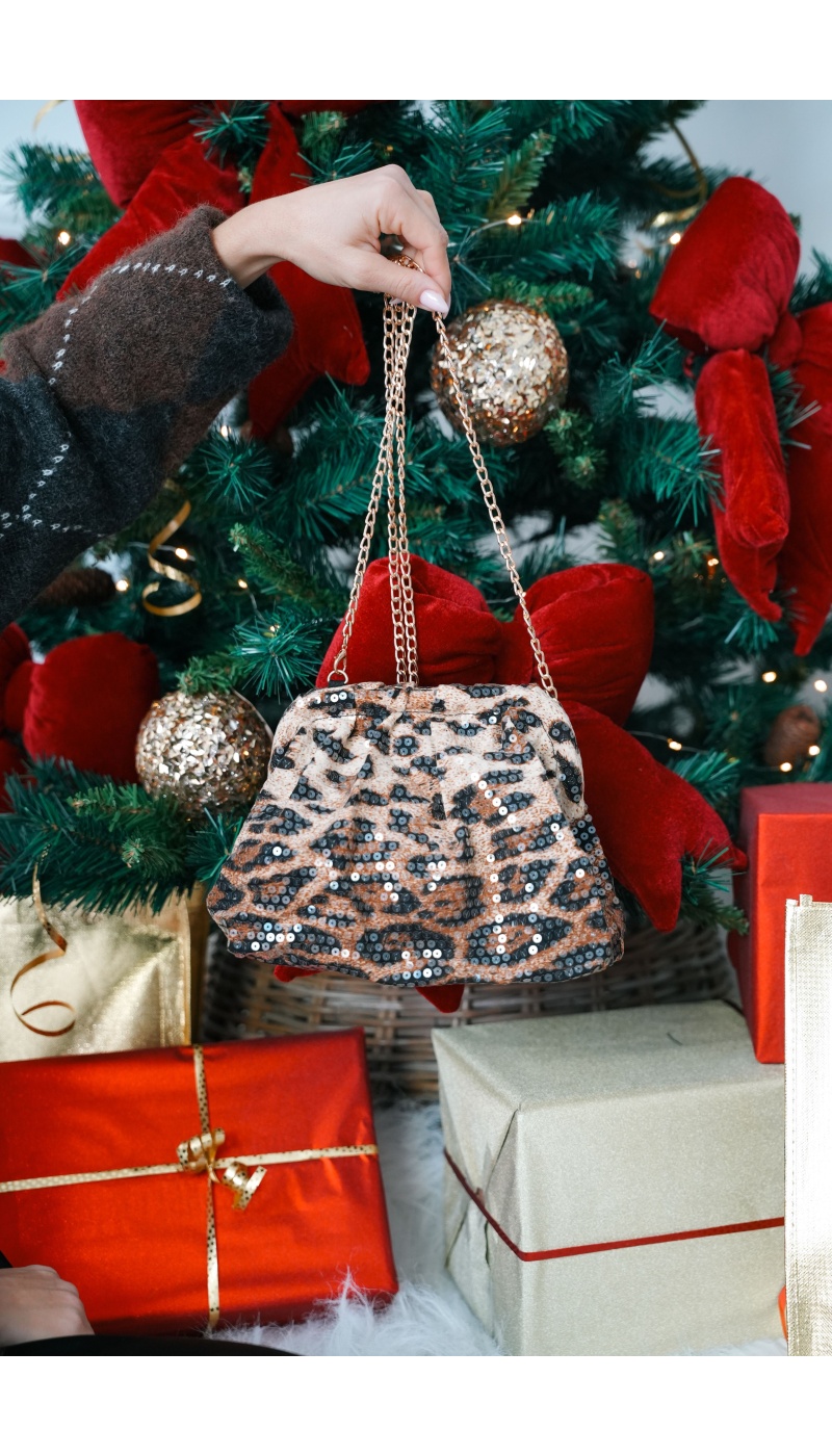 Sac pour femmes.Motif léopard.Avec sequins.Type bourse.Bandoulière en chaîne dorée amovible.Doublure intérieure noire.Fermeture flex frame.Composition :100% Polyester.Dimensions :Longueur : 25cmHauteur : 15cm