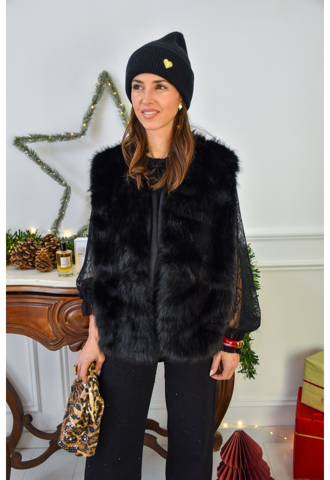 Bonnet pour femmes.De couleur noir.Broderie cœur doré.En maille.Composition :100% Acrylique.Nos bonnets sont tailles uniques.
