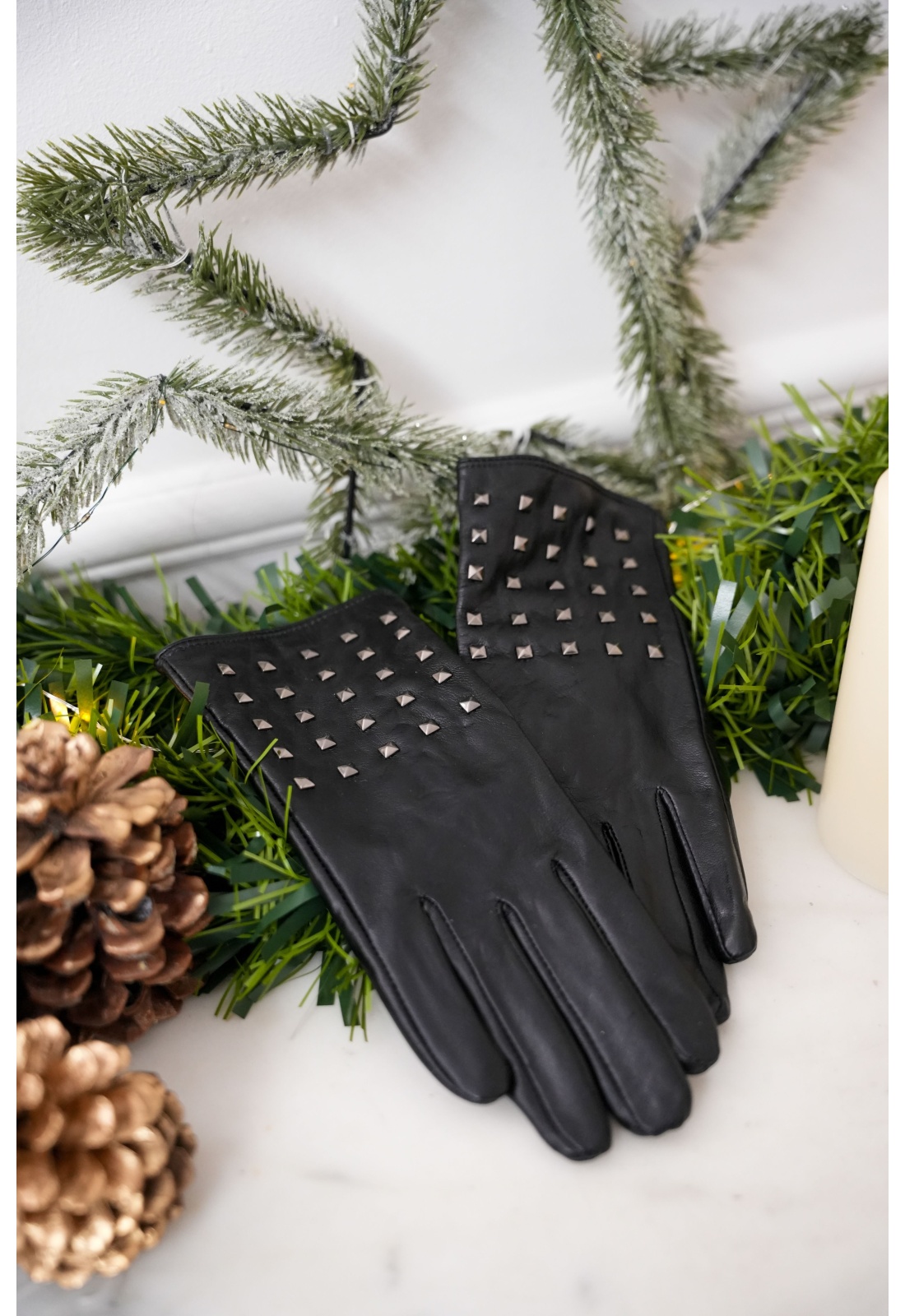 Gants pour femmes.De couleur noirs.En cuir.Intérieur en velours.Détail de clous argentés.Composition :100% Cuir.