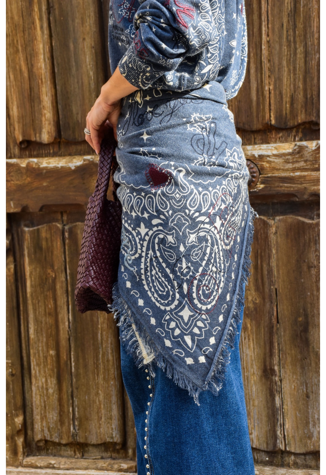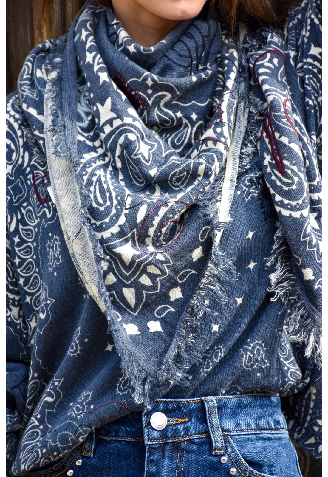 Echarpe pour femmes.De couleur marine.Imprimé bandana écru.Broderie diverse noire et bordeaux.De chez Adoré Paris.Avec franges sur les côtés.Composition :50% Acrylique.45% Nylon.5% Laine.Dimensions :110x95cm