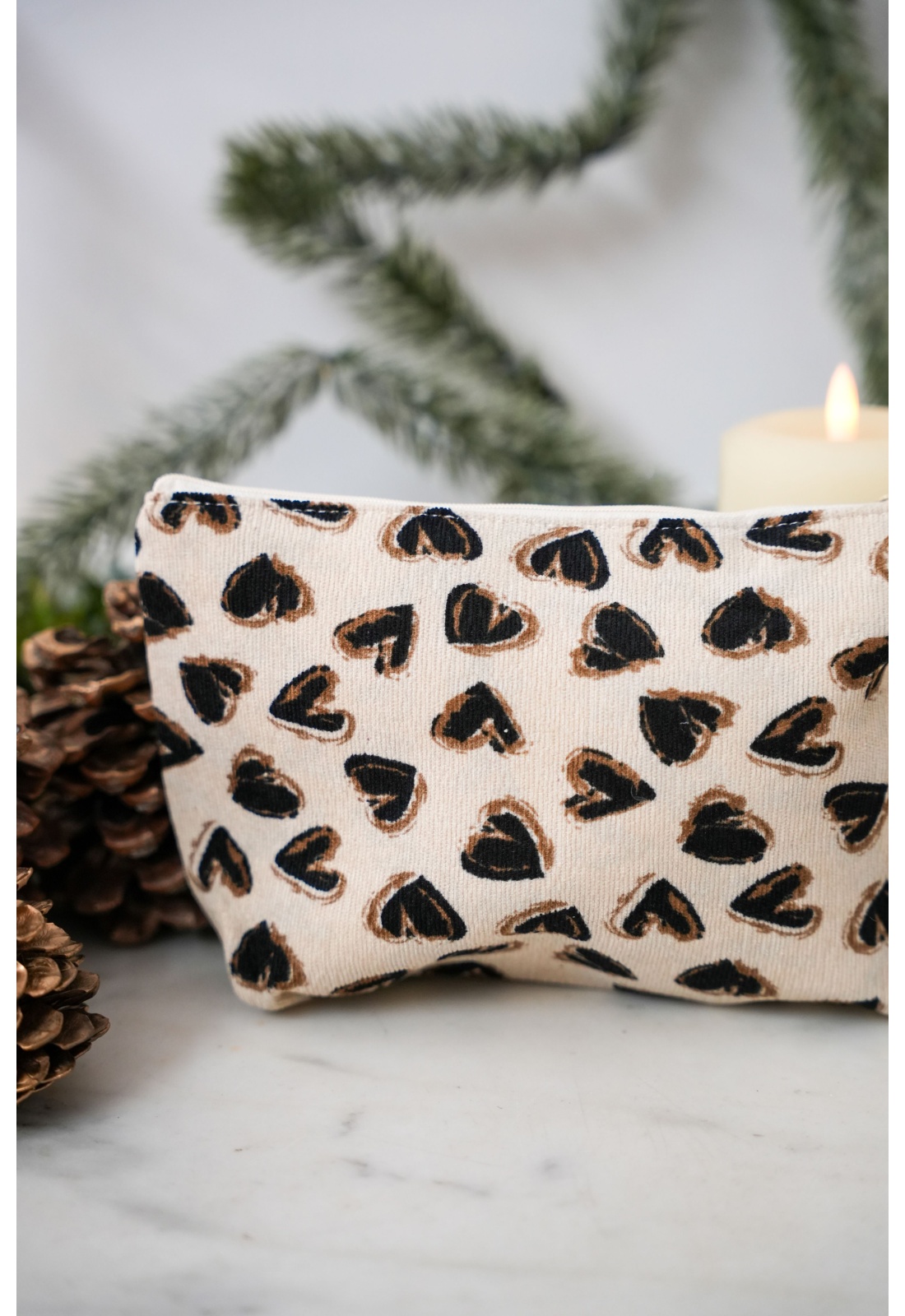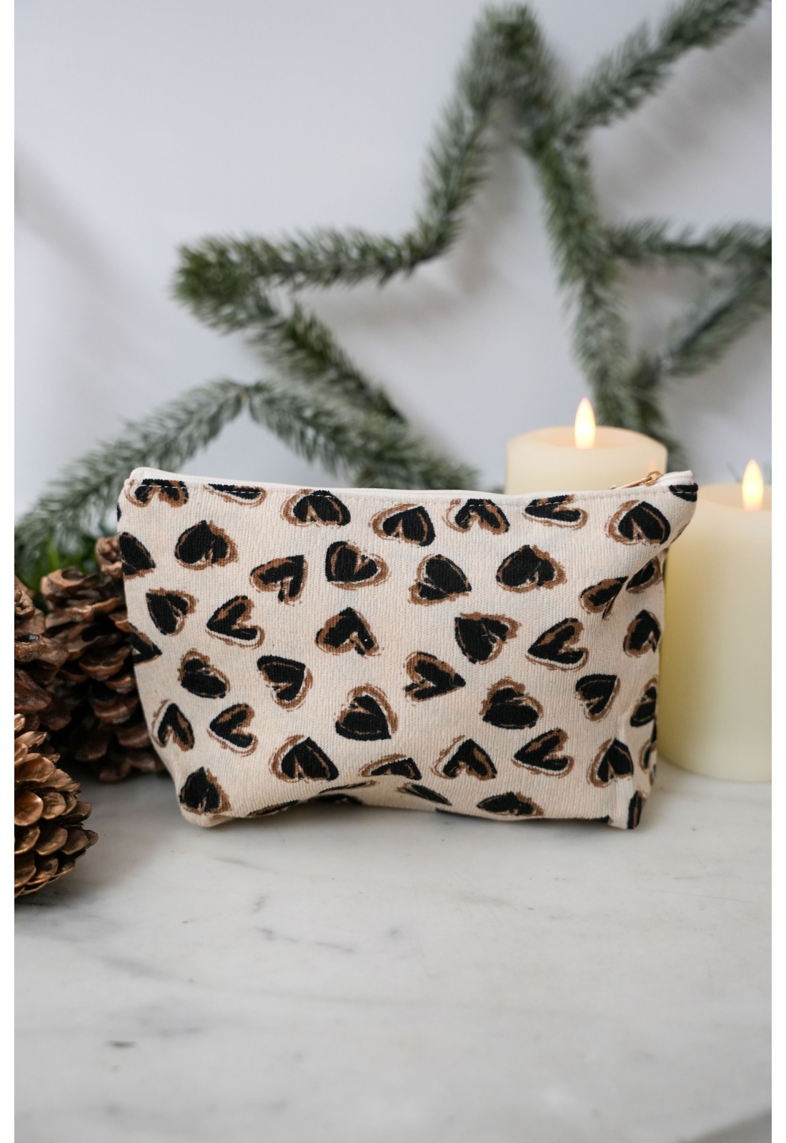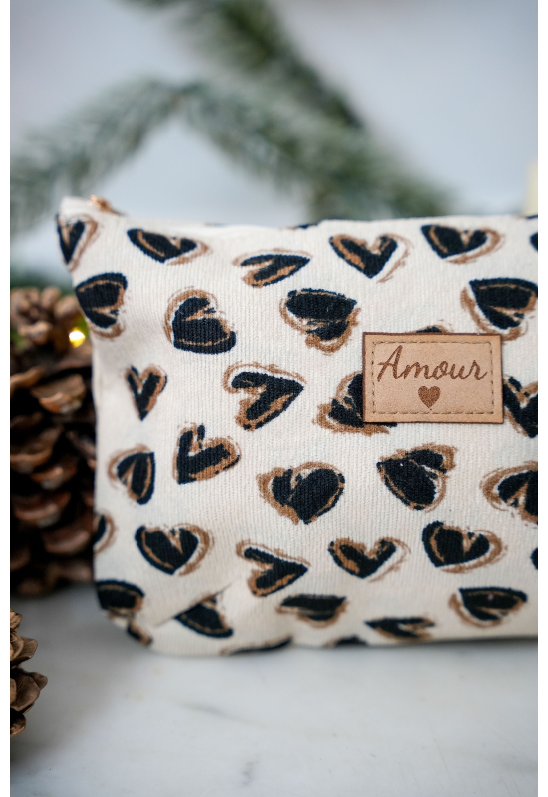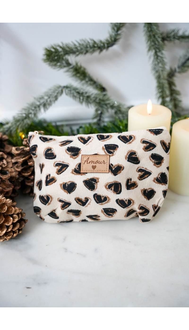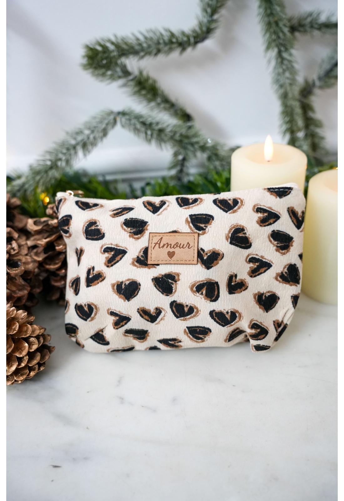 PochetteDe couleur beigeMotif coeur noir et camelEn velours côteléEmpiècement cuir " Amour"Se ferme par zip doré à pomponComposition :100% PolyesterDimension :25 x 15cm