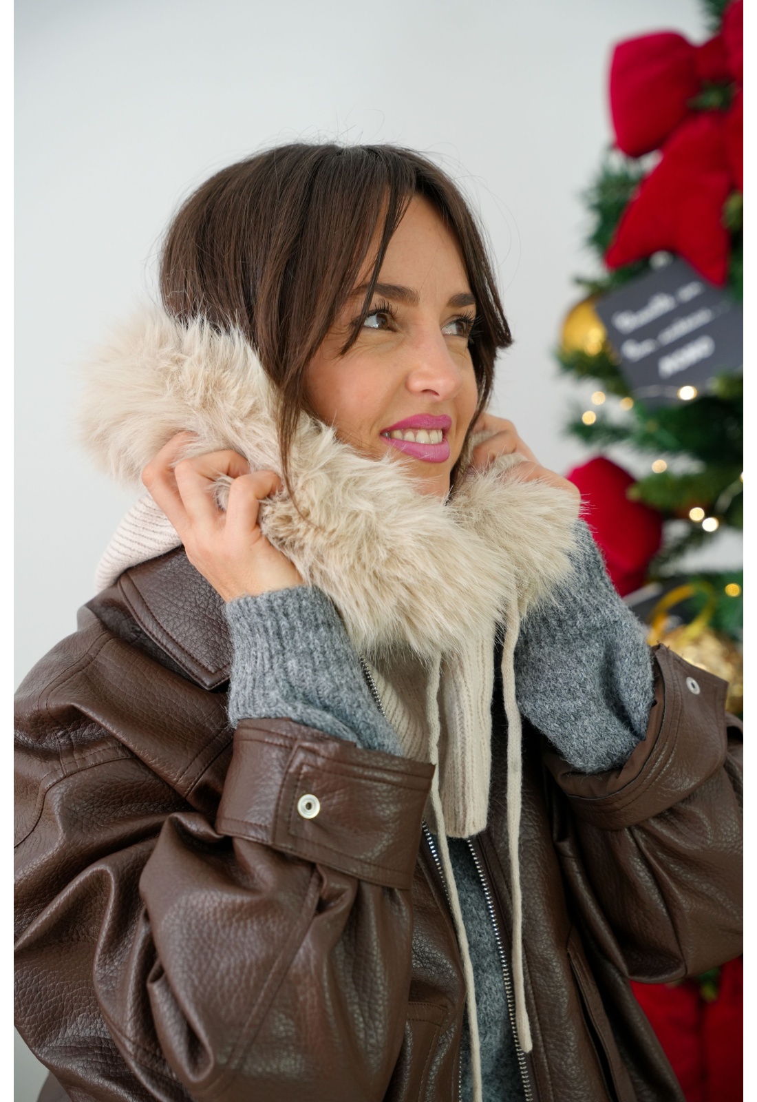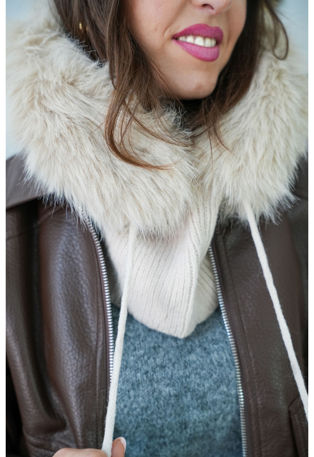 CagouleEcrueEn maille côteléeContour en fausse fourrureLien de serrageComposition :100% ViscoseNos cagoules sont tailles uniques.