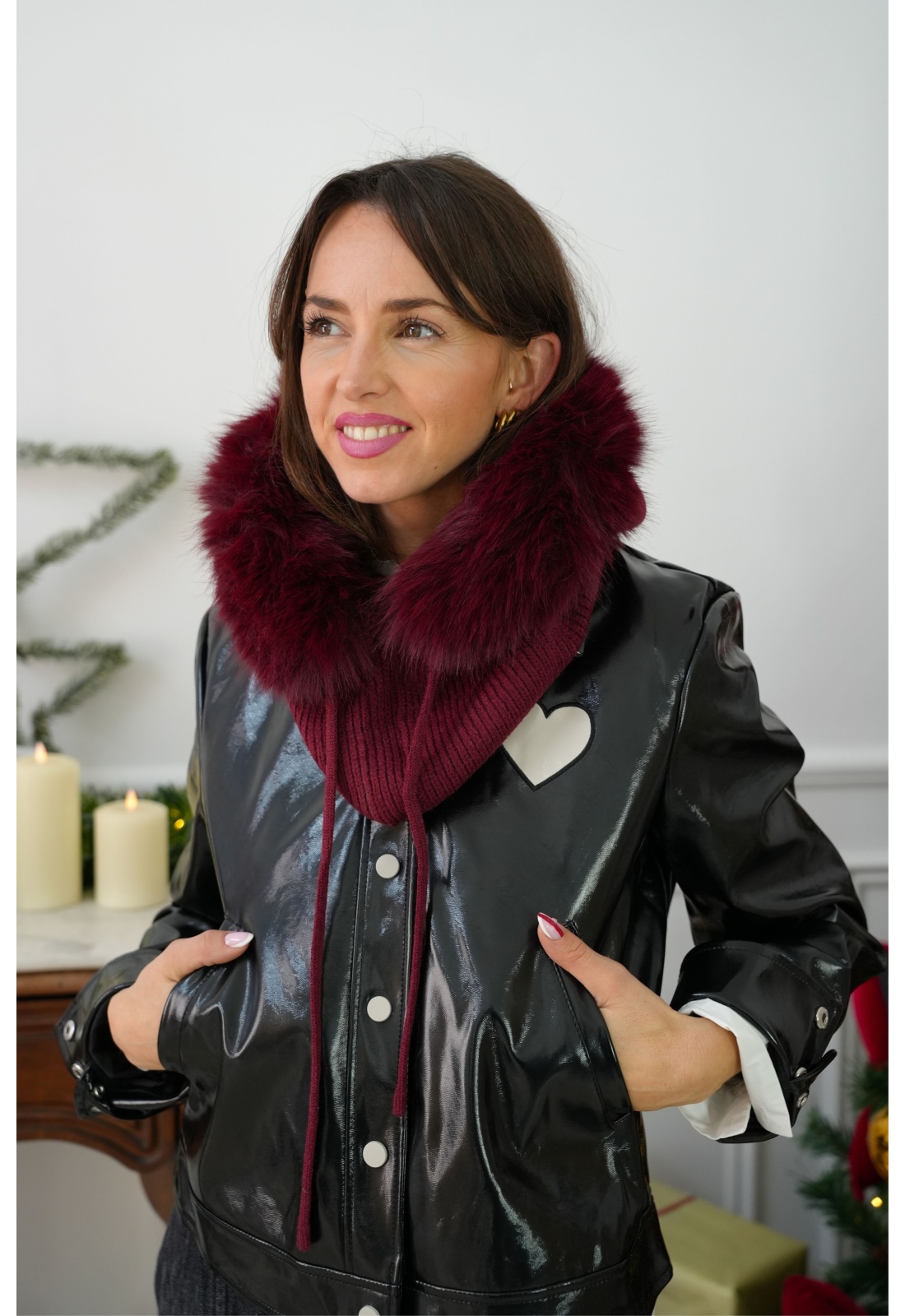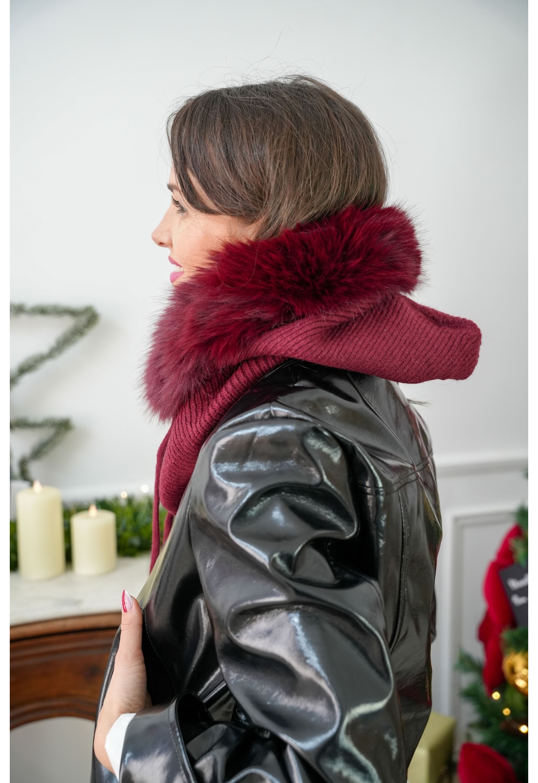 CagouleBordeauxEn maille côteléeContour en fausse fourrureLien de serrageComposition :100% ViscoseNos cagoules sont tailles uniques.