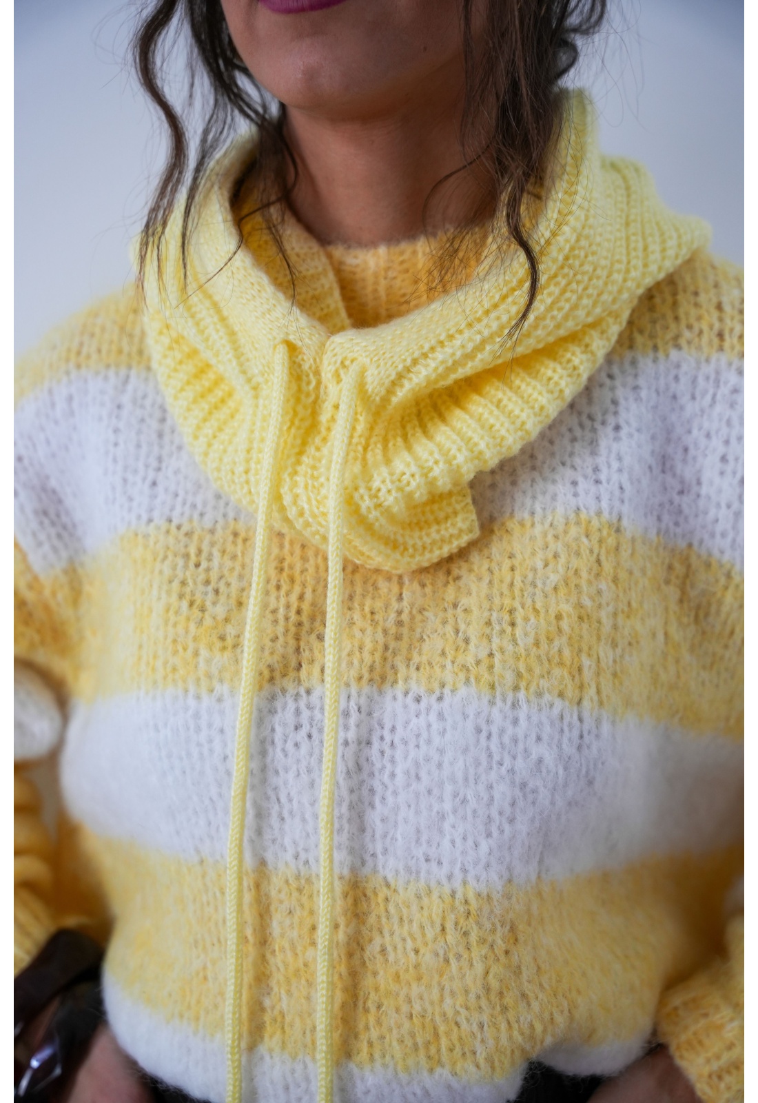 Cagoule pour femmes.De couleur jaune.En maille côtelée.Avec 2 lacets.Matière douce.Ne gratte pas.Composition :80% Acrylique.20% Nylon.Fabriquée en Italie.Nos cagoules sont tailles uniques.