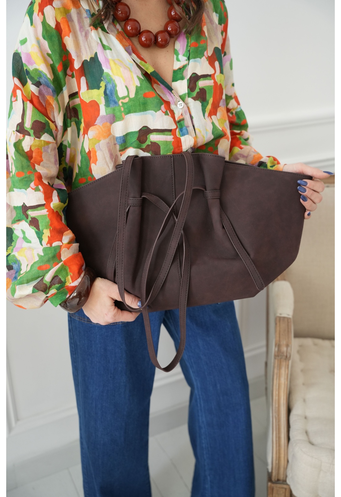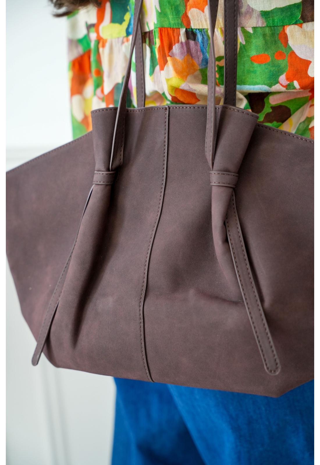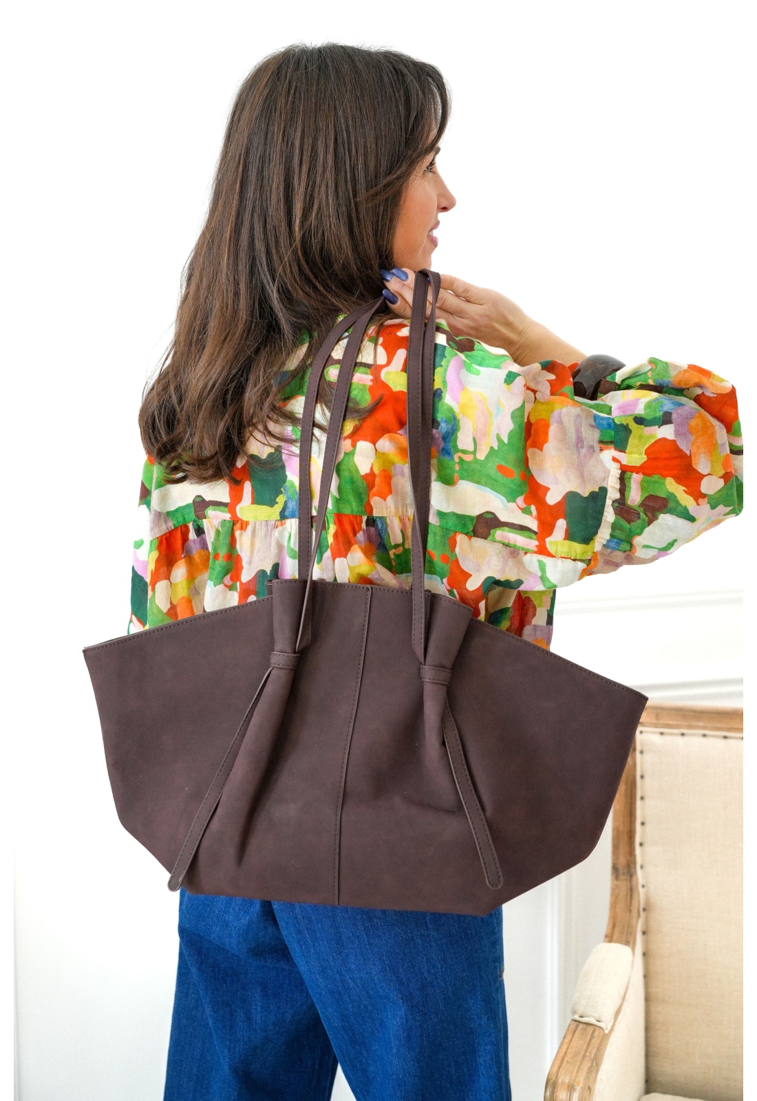 Sac pour femmes.De couleur chocolat.Type cabas.En suédine.Avec 2 grandes anses.Contenant 2 petites poches plaquées et une zippée à l'intérieur.Se ferme par fermeture éclair.Composition :100% Polyurethane Dimensions :Hauteur : 29cmLongueur : 48cm