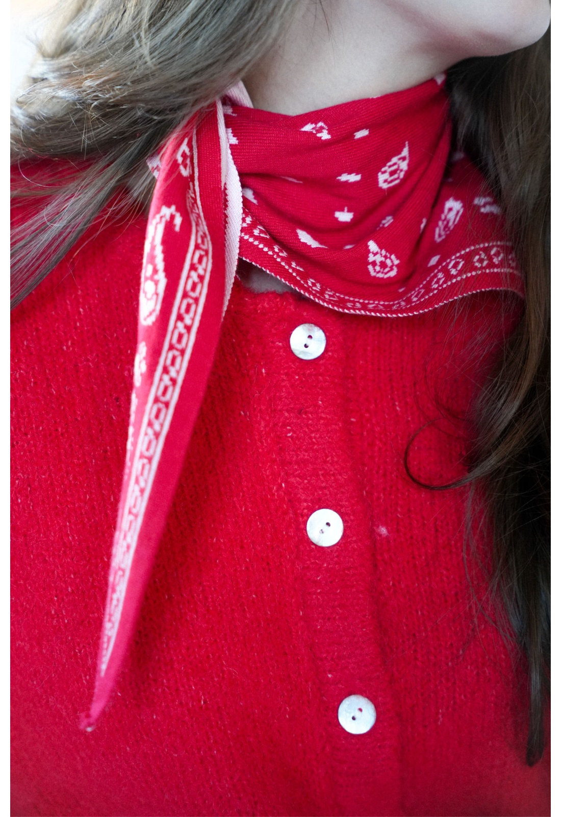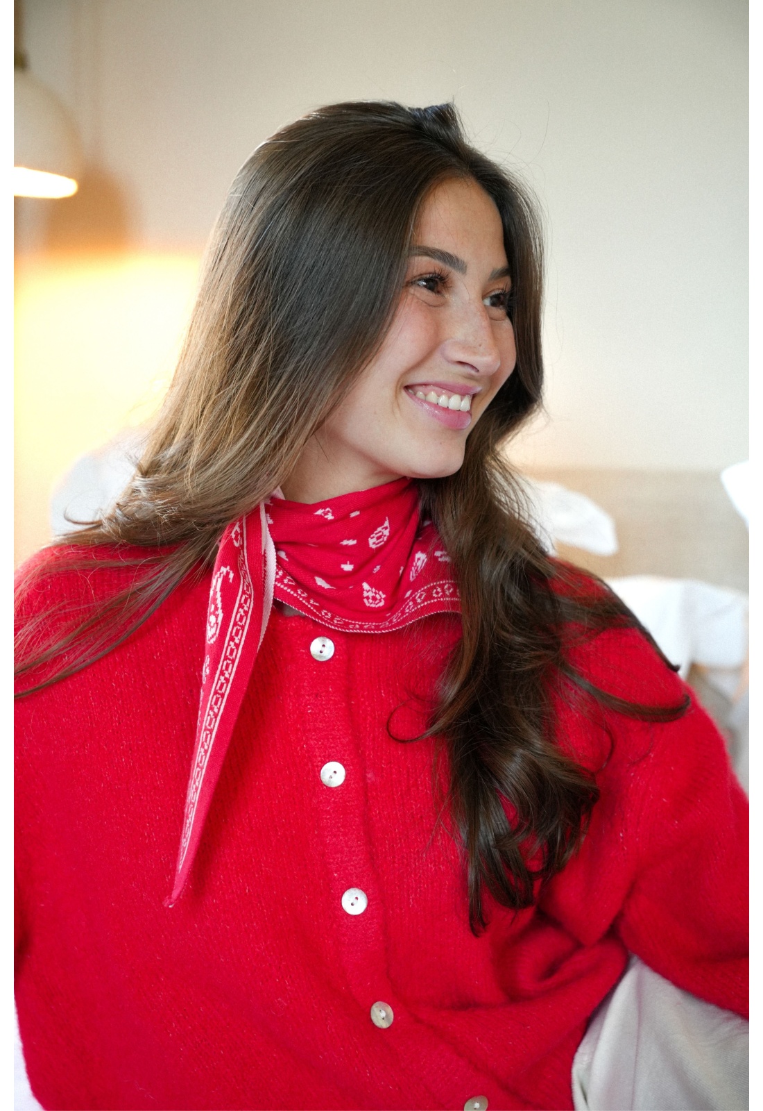 Foulard pour femmes.De couleur rouge et écru.Motif bandana.En laine.Composition :45% Viscose.27% Nylon.38% Laine.