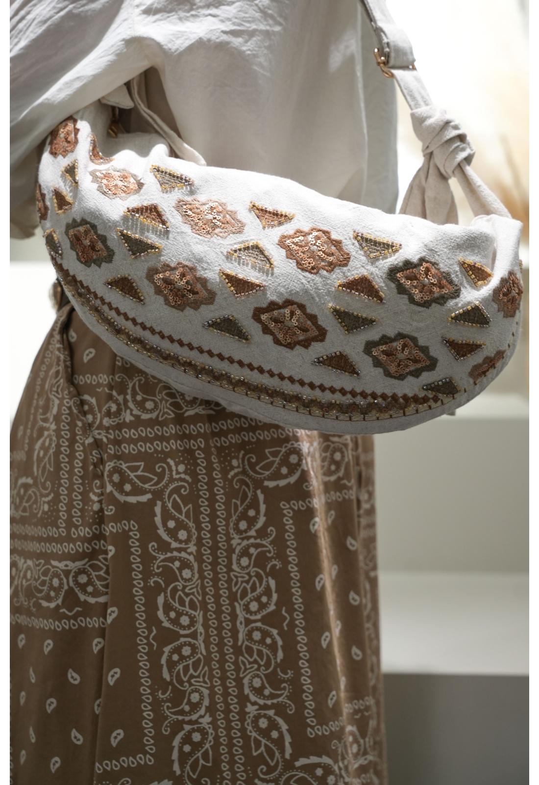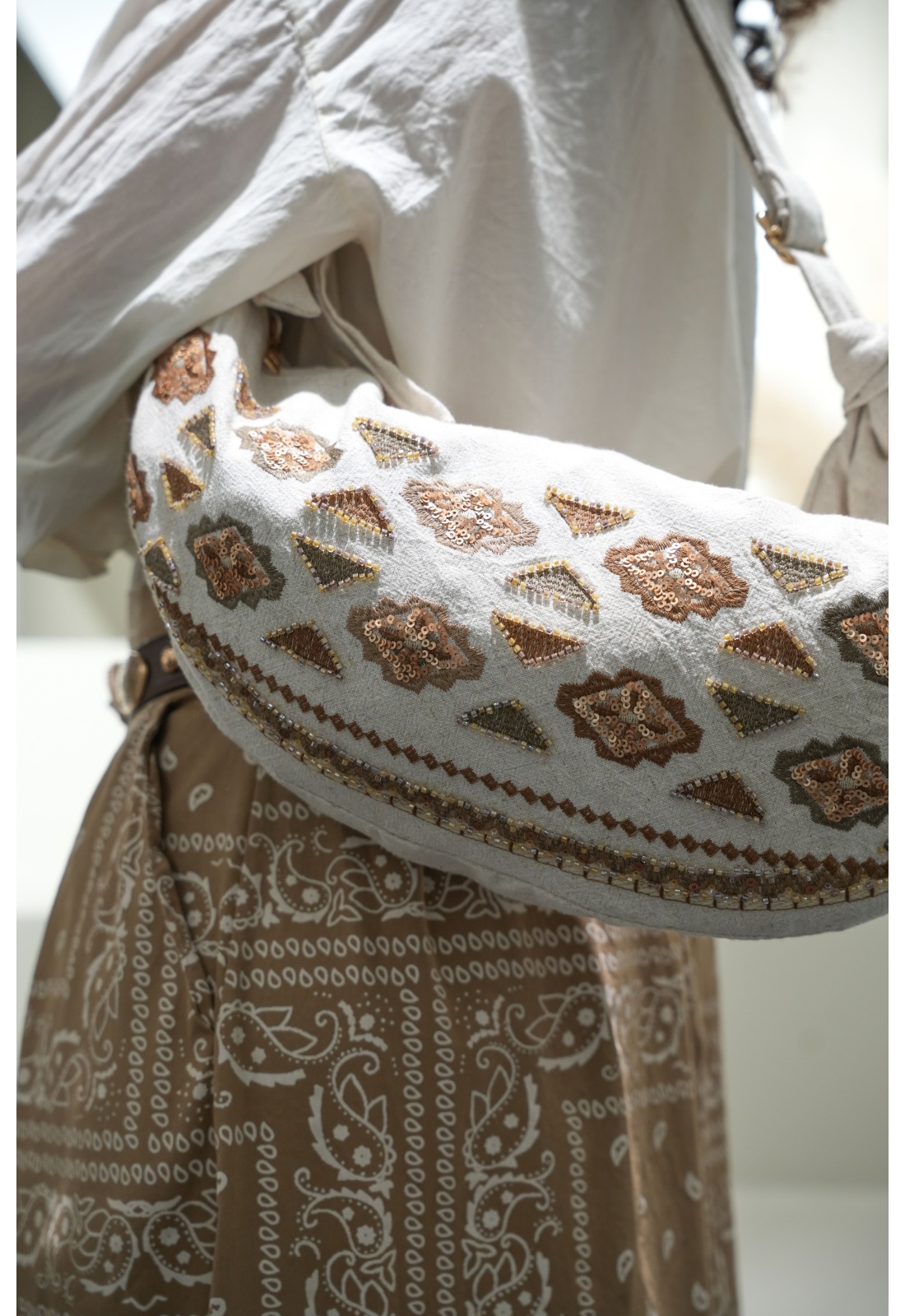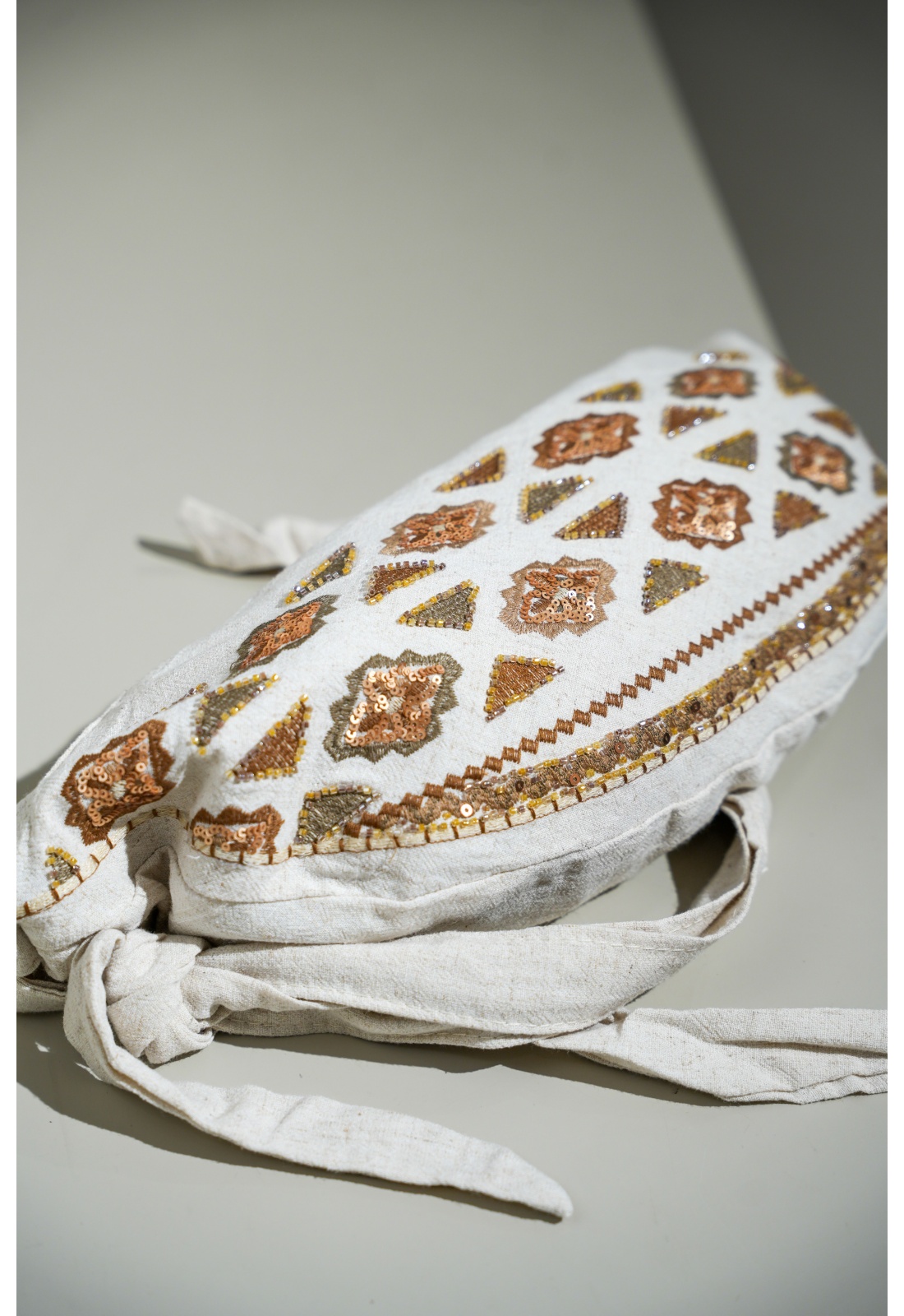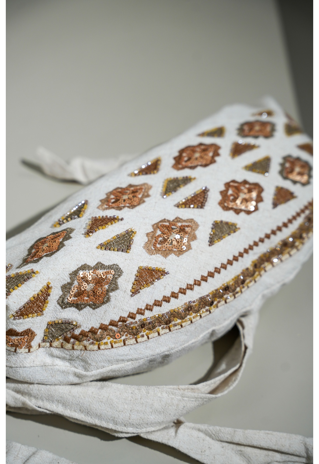 Sequins, perles et broderies.En lin beige.Zip doré.Une poche zippée à l'intérieur.Avec bandoulière réglable.Composition :100% Lin.Dimensions :Hauteur : 17cmLargeur : 28cm