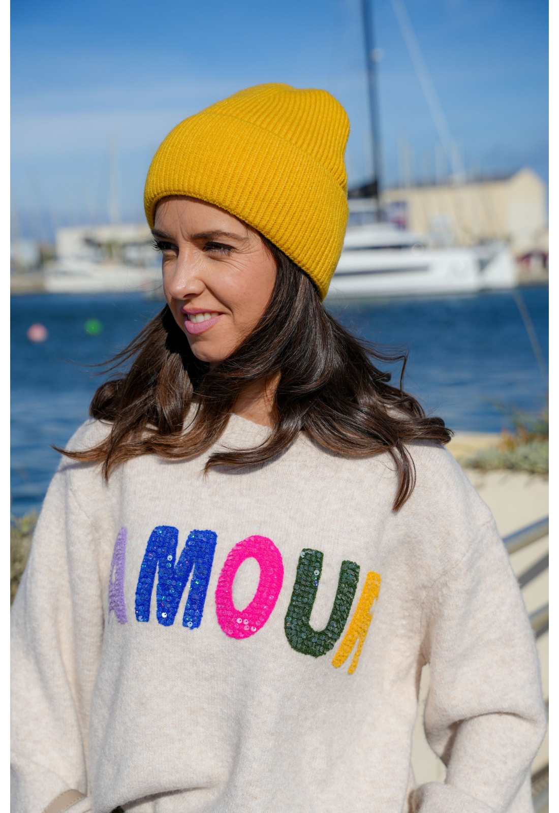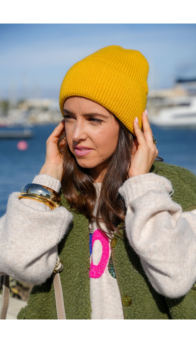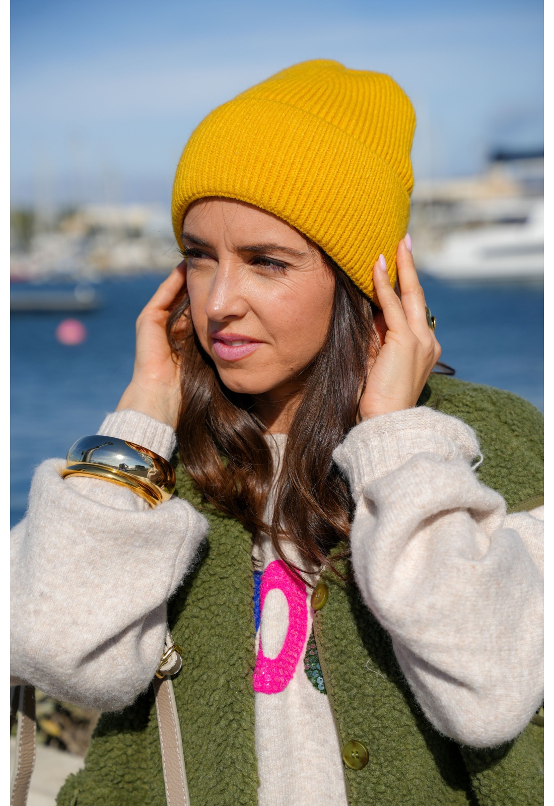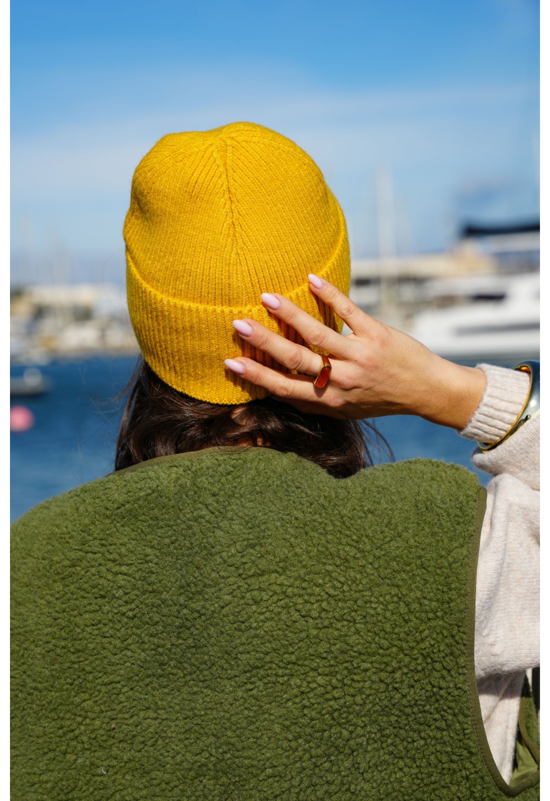 Bonnet femme jaune.Maille fine. Extensible et taille unique.
