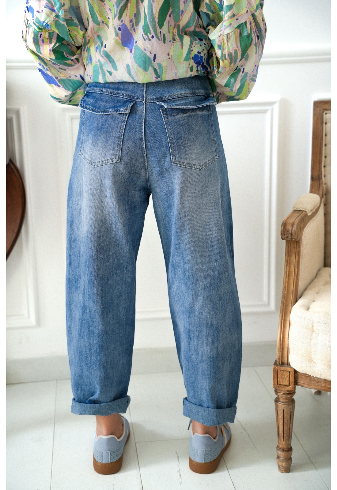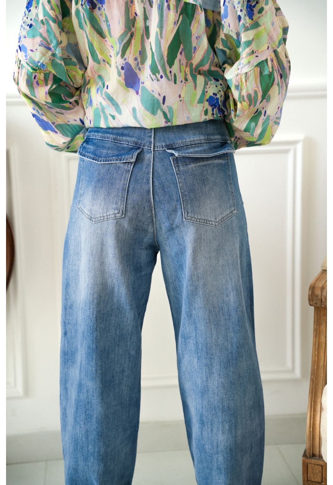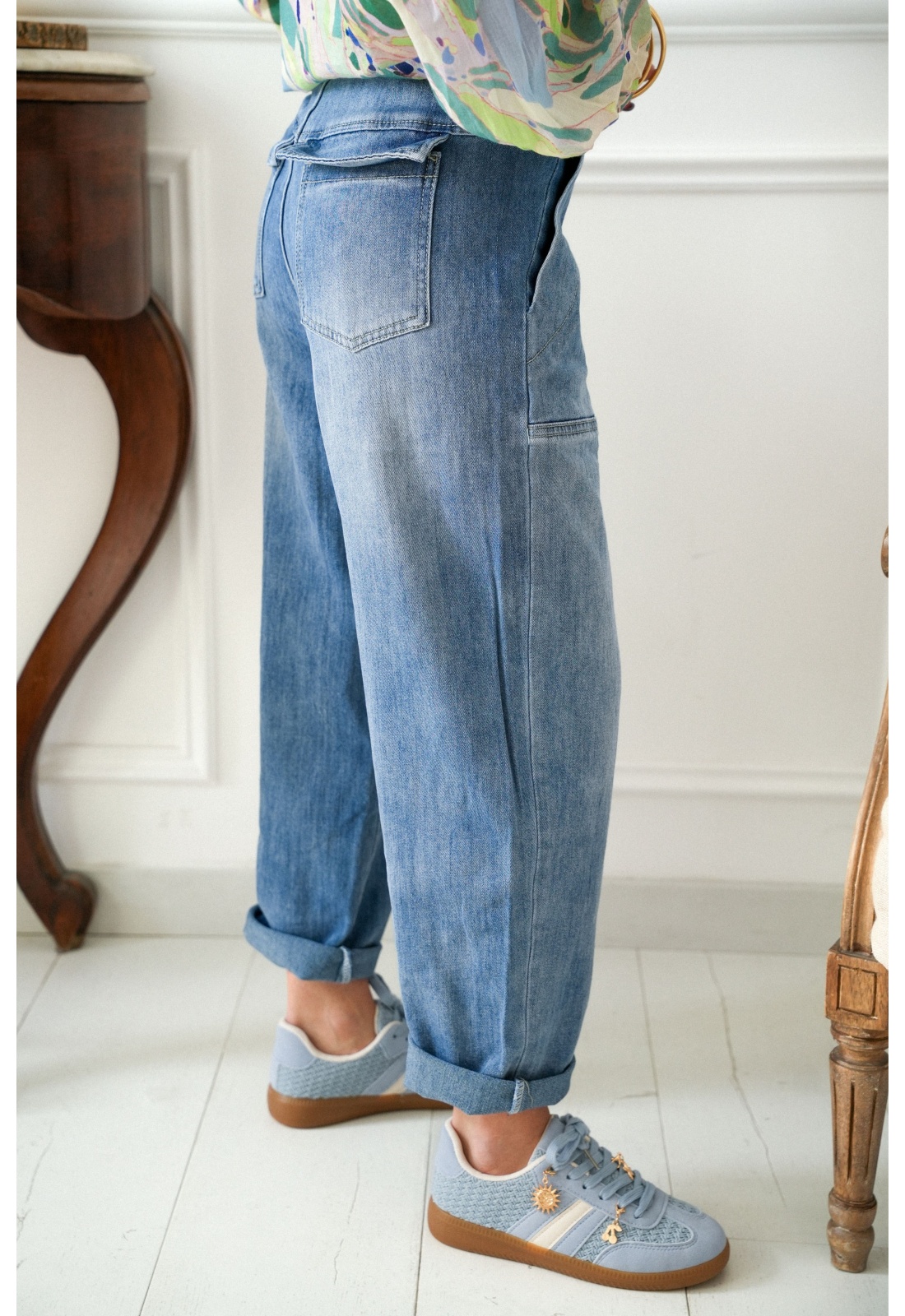 Jean pour femmes.En denim bleu.Surpiqures beige.Coupe mom.Poches arrières plaquées.Poches avants coupées.Se ferme par bouton et zip.Passants pour la ceinture.Composition :97% Coton.3% Elasthanne.La mannequin porte une taille 34 et mesure 160cm.