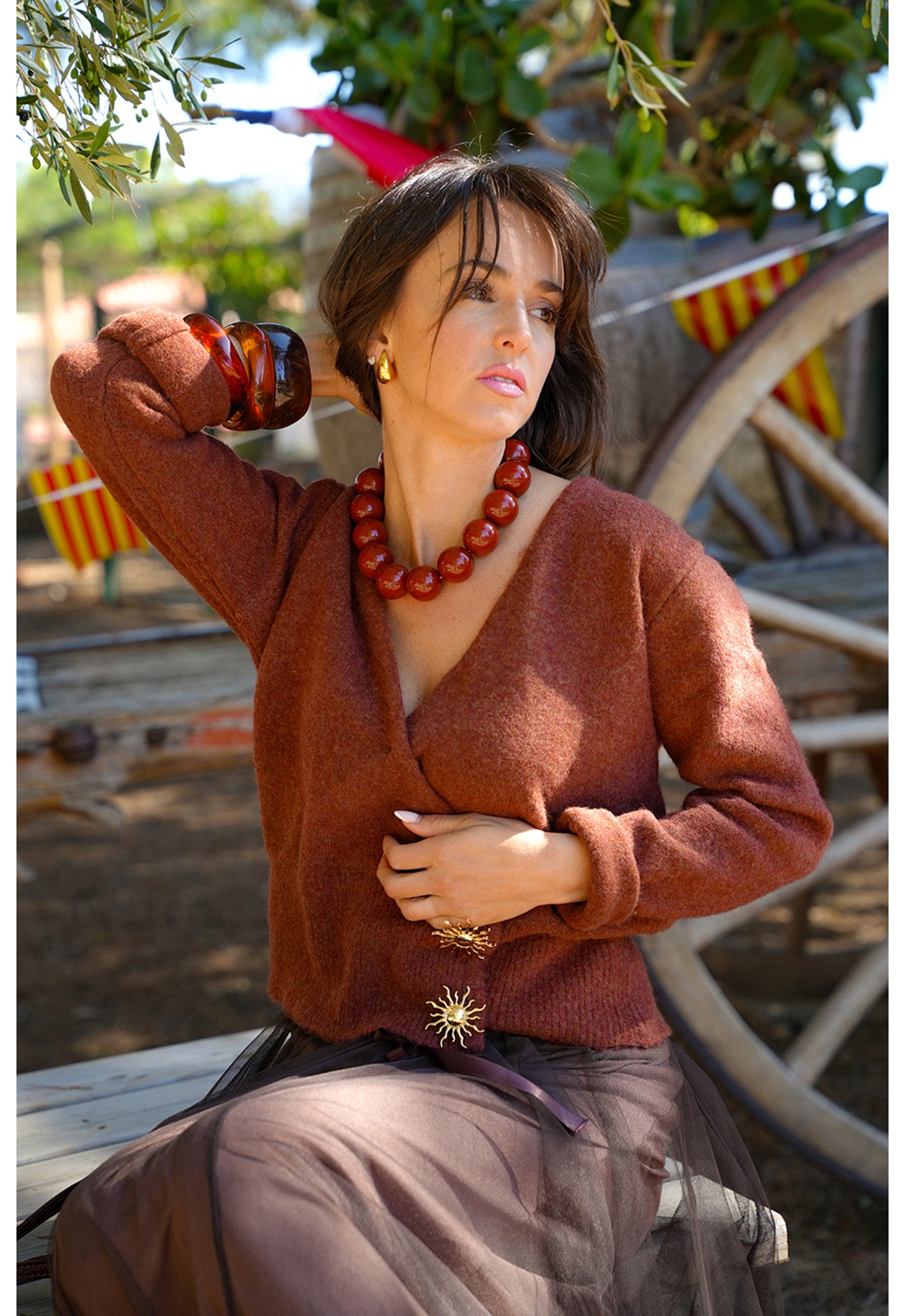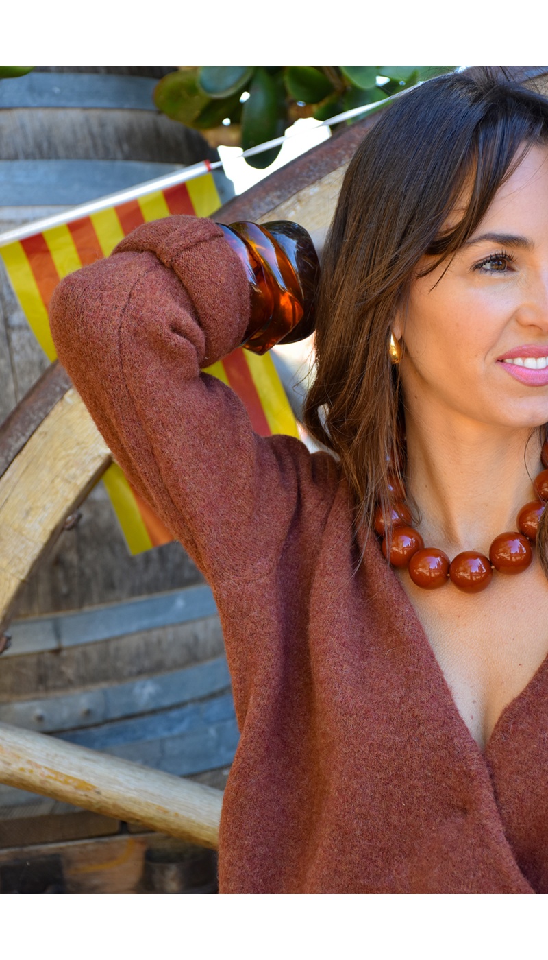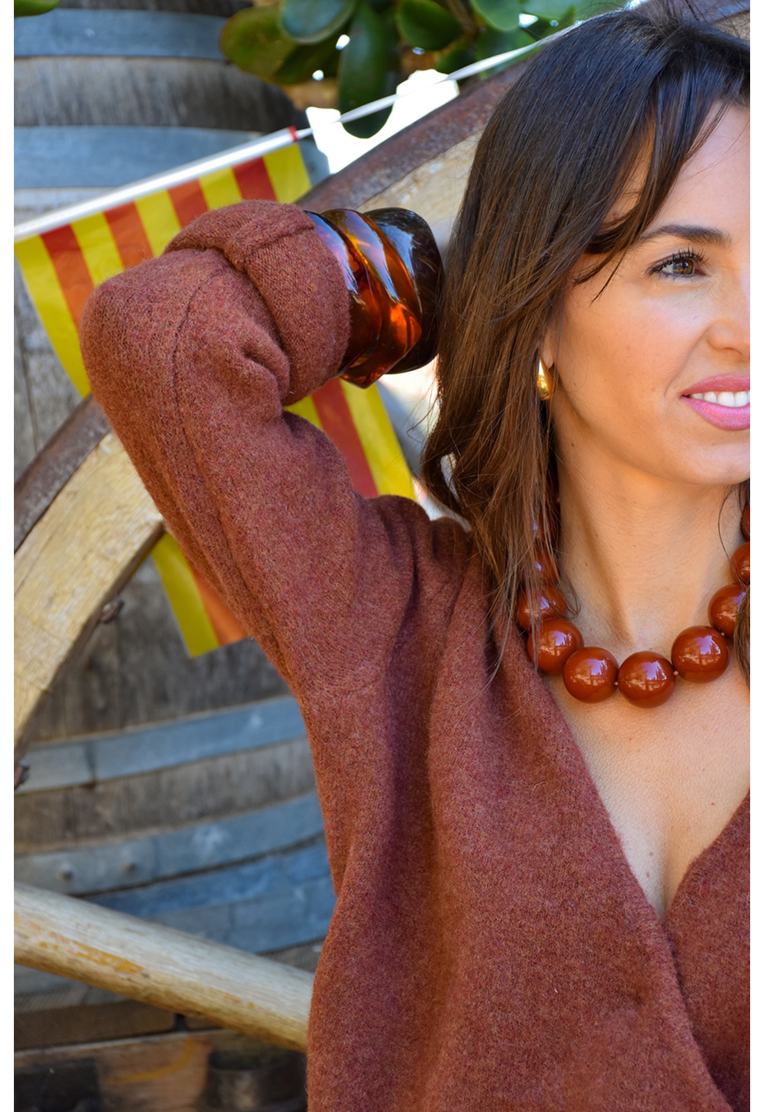 Collier pour femmes.De couleur rouille.En grosses perles.Fermoir doré.Réglable sur plusieurs niveaux.