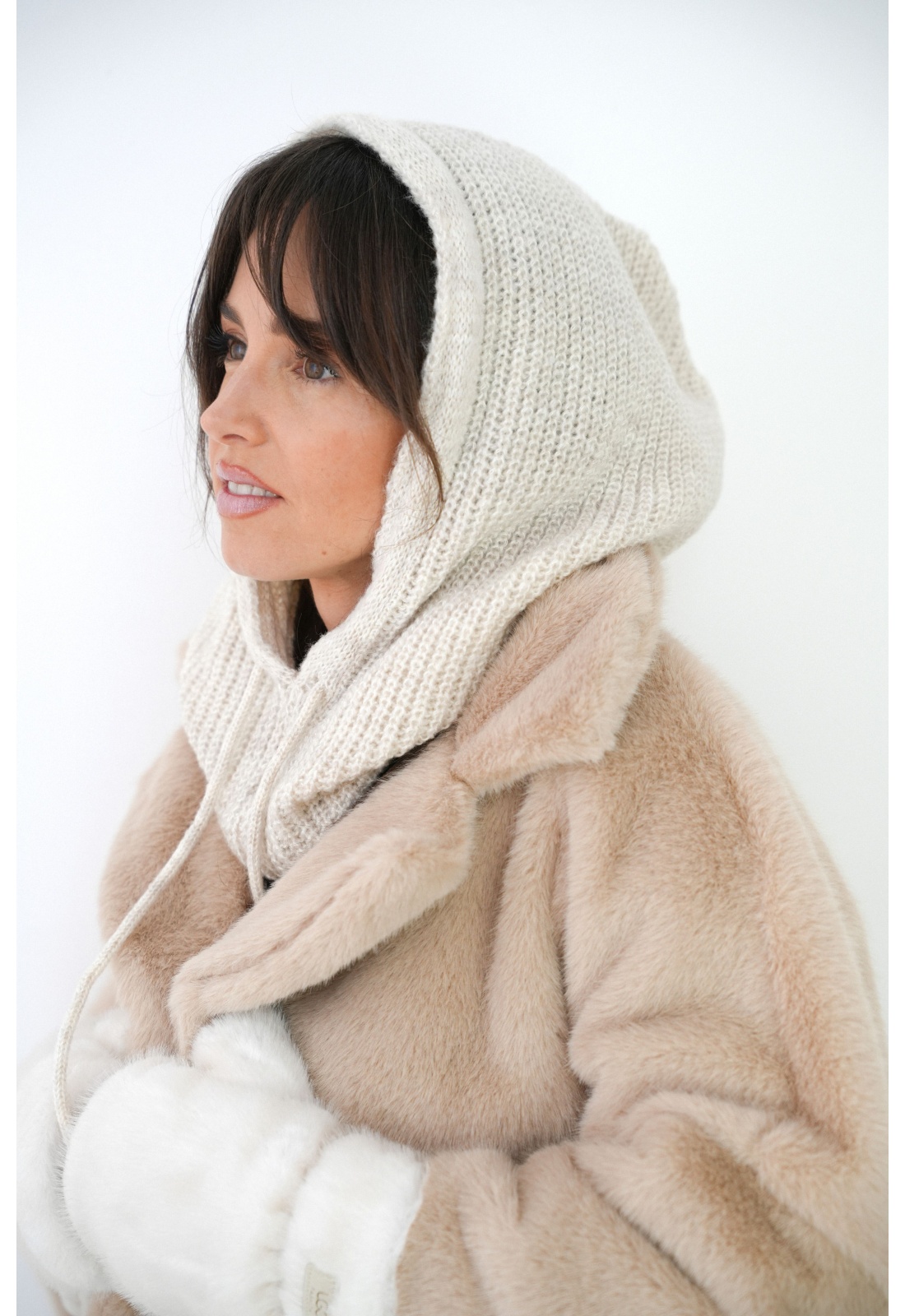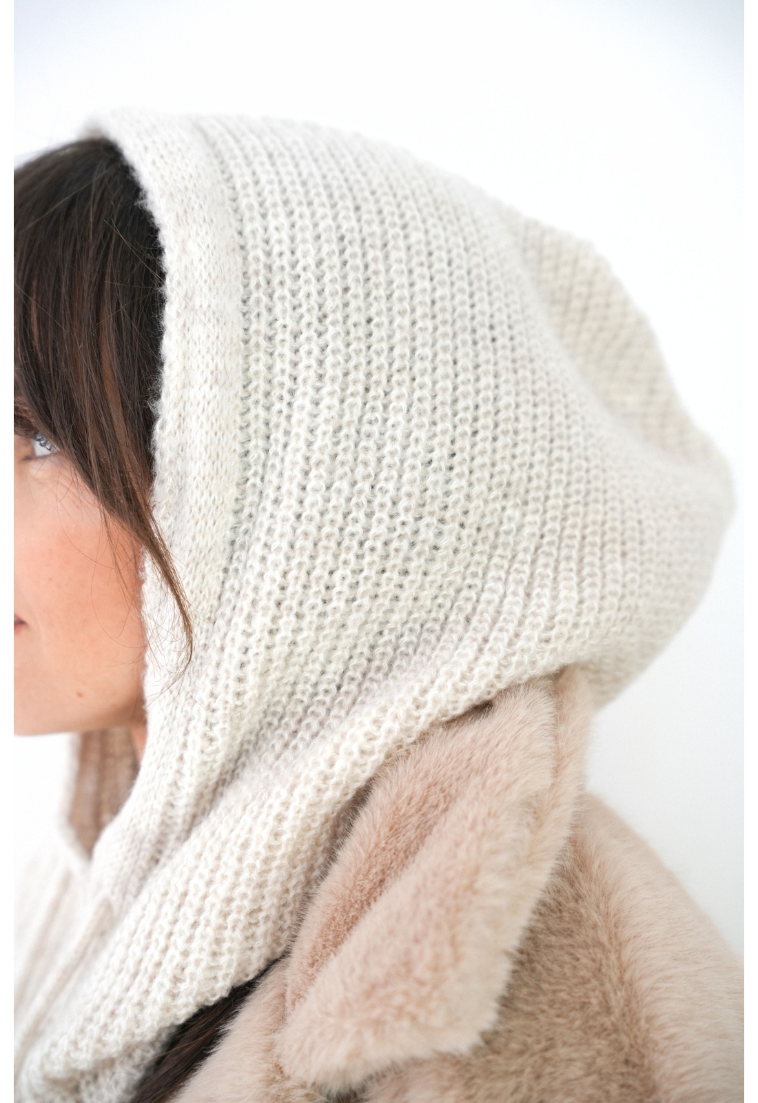 Cagoule pour femmes.De couleur écru.En maille côtelée.Avec 2 lacets.Matière douce.Ne gratte pas.Composition :80% Acrylique.20% Nylon.Fabriquée en Italie.Nos cagoules sont tailles uniques.