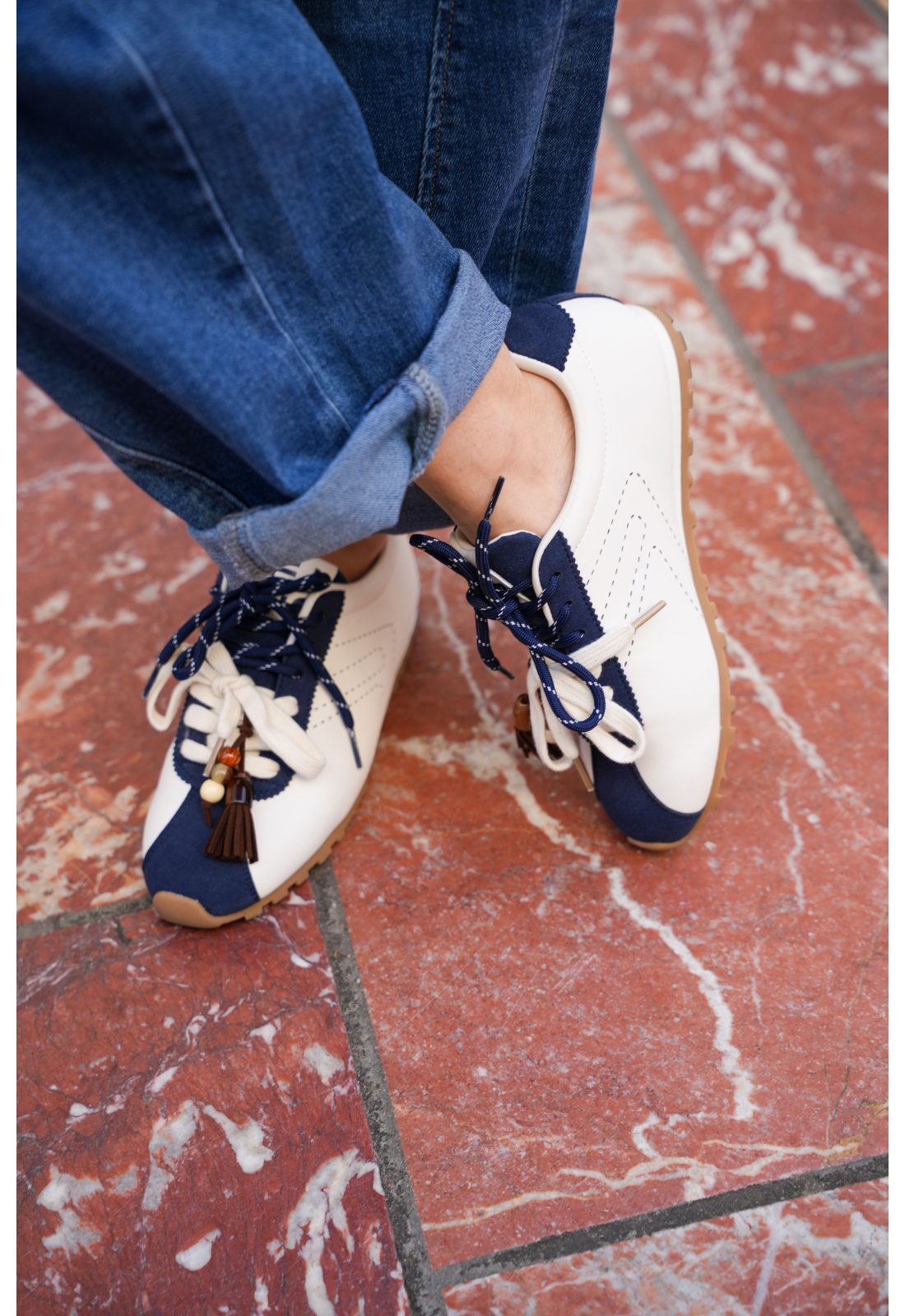 Baskets pour femmes.De couleur blanche et marine.Paire de lacets marine et blanche avec bijoux.Modèle bas.Il est conseillé de prendre votre taille habituelle. Existe en d'autres coloris sur demande.