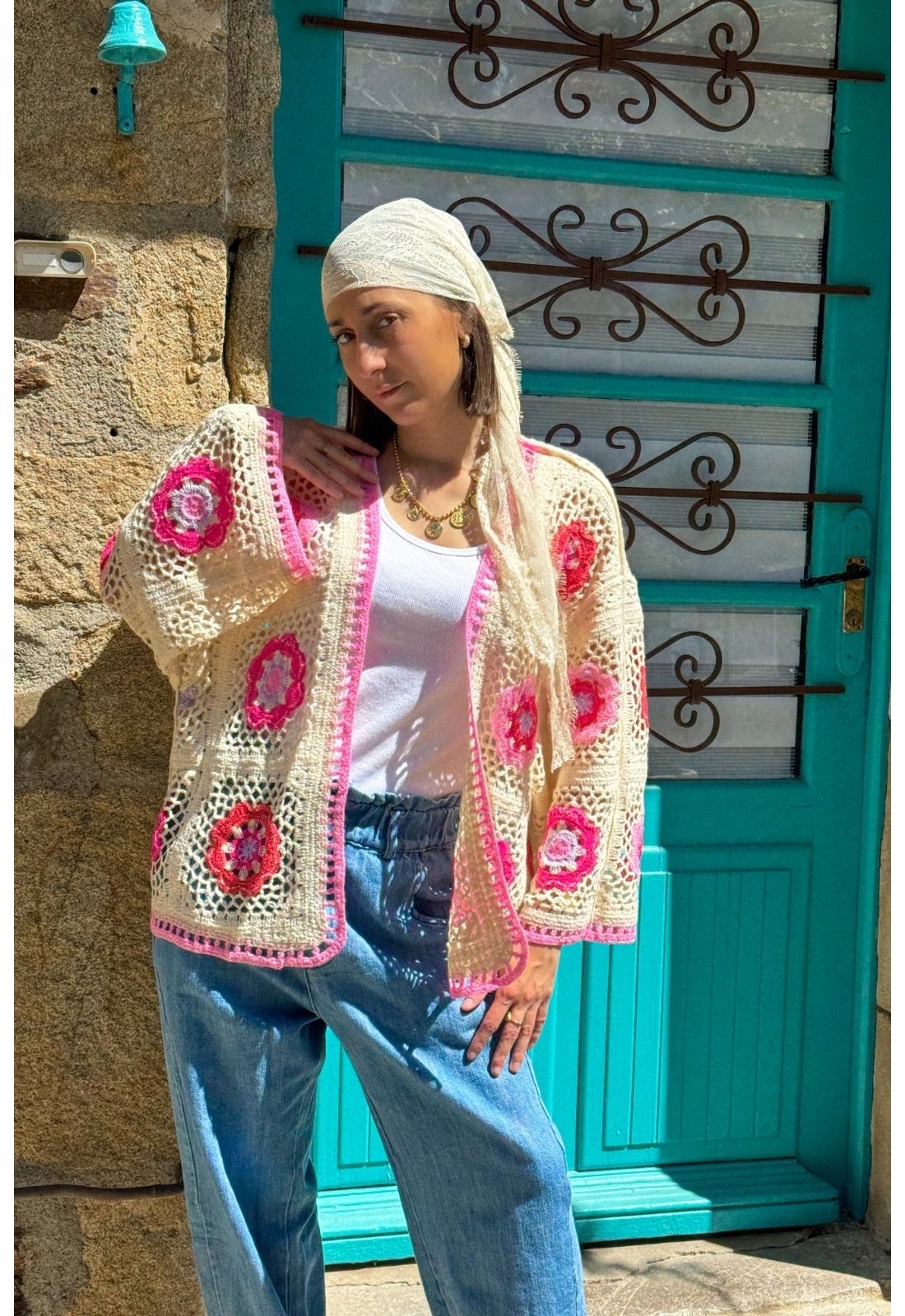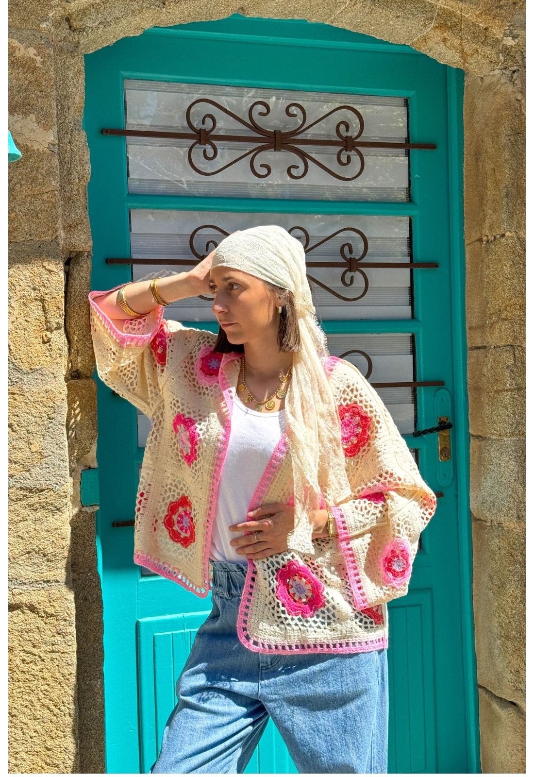 Gilet Crochet Fleurs Roses PINA