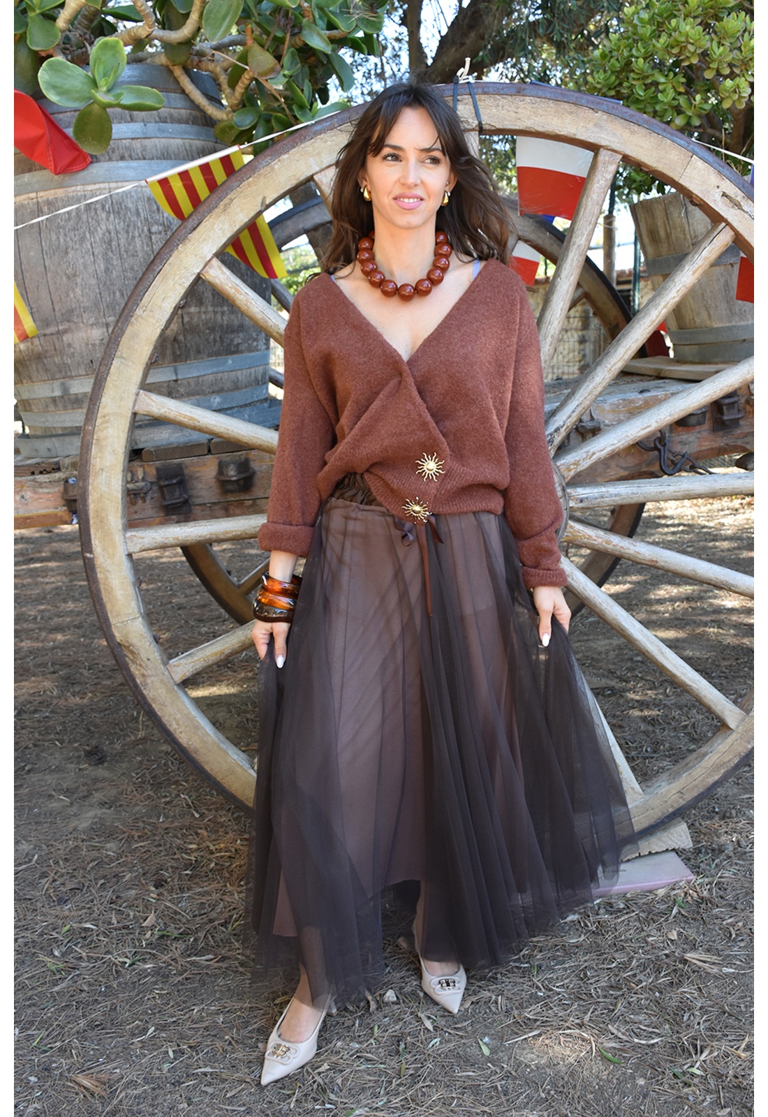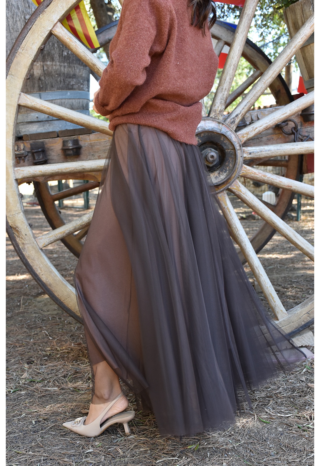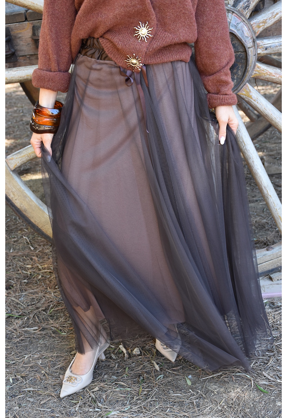 Jupe pour femmes.De couleur chocolat.En tulle.Longue, évasée et volumineuse.Elastique à la taille satiné avec lien.Avec doublure longue.Composition :100% Polyester.Fabriquée en Italie.La mannequin porte une taille unique et mesure 160cm.