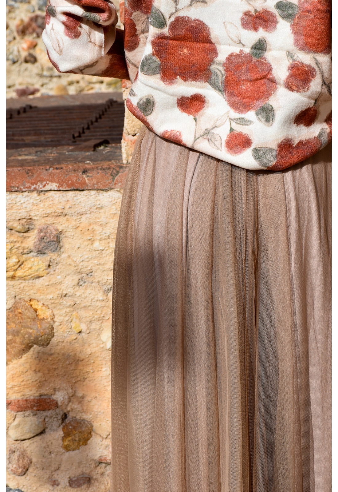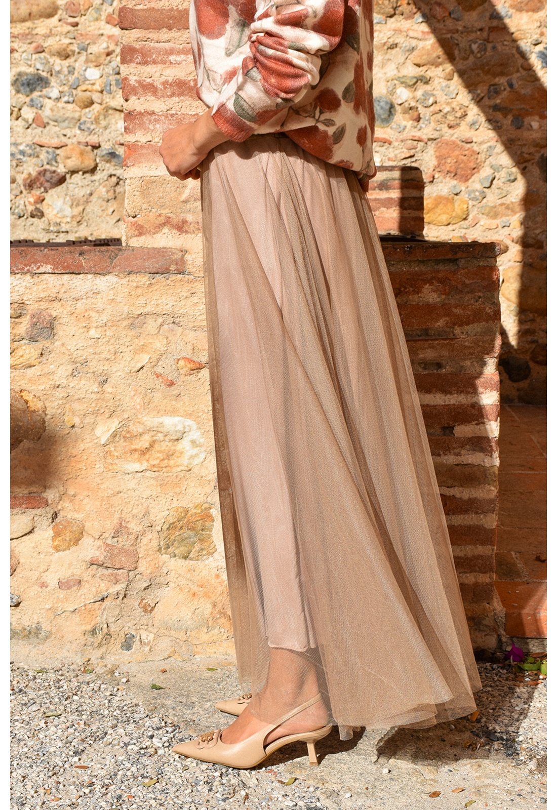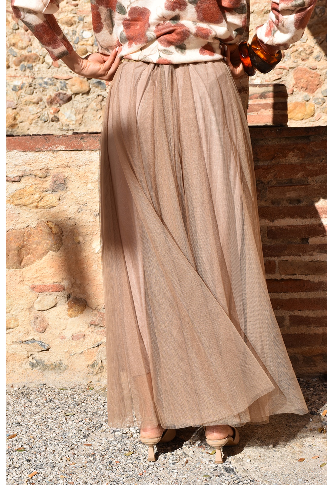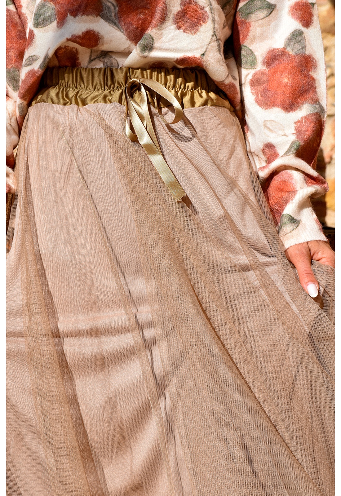 Jupe pour femmes.De couleur beige.En tulle.Longue, évasée et volumineuse.Elastique à la taille satiné avec lien.Avec doublure longue.Composition :100% Polyester.Fabriquée en Italie.La mannequin porte une taille unique et mesure 160cm.