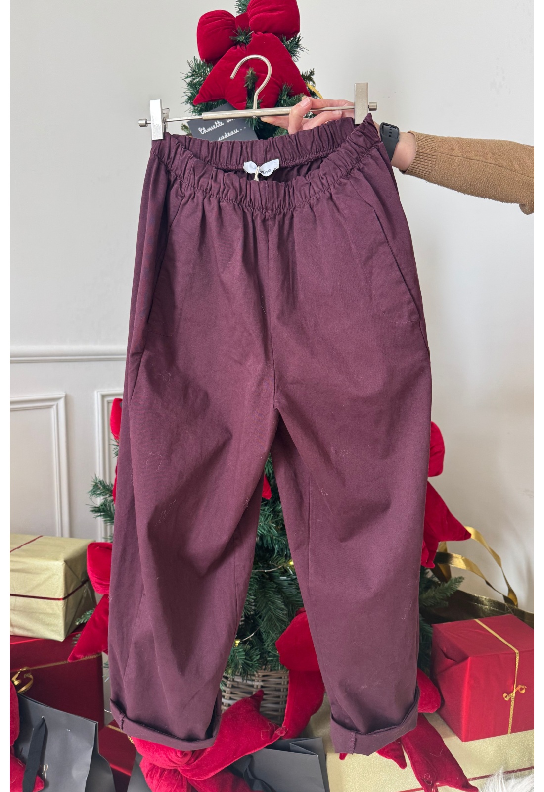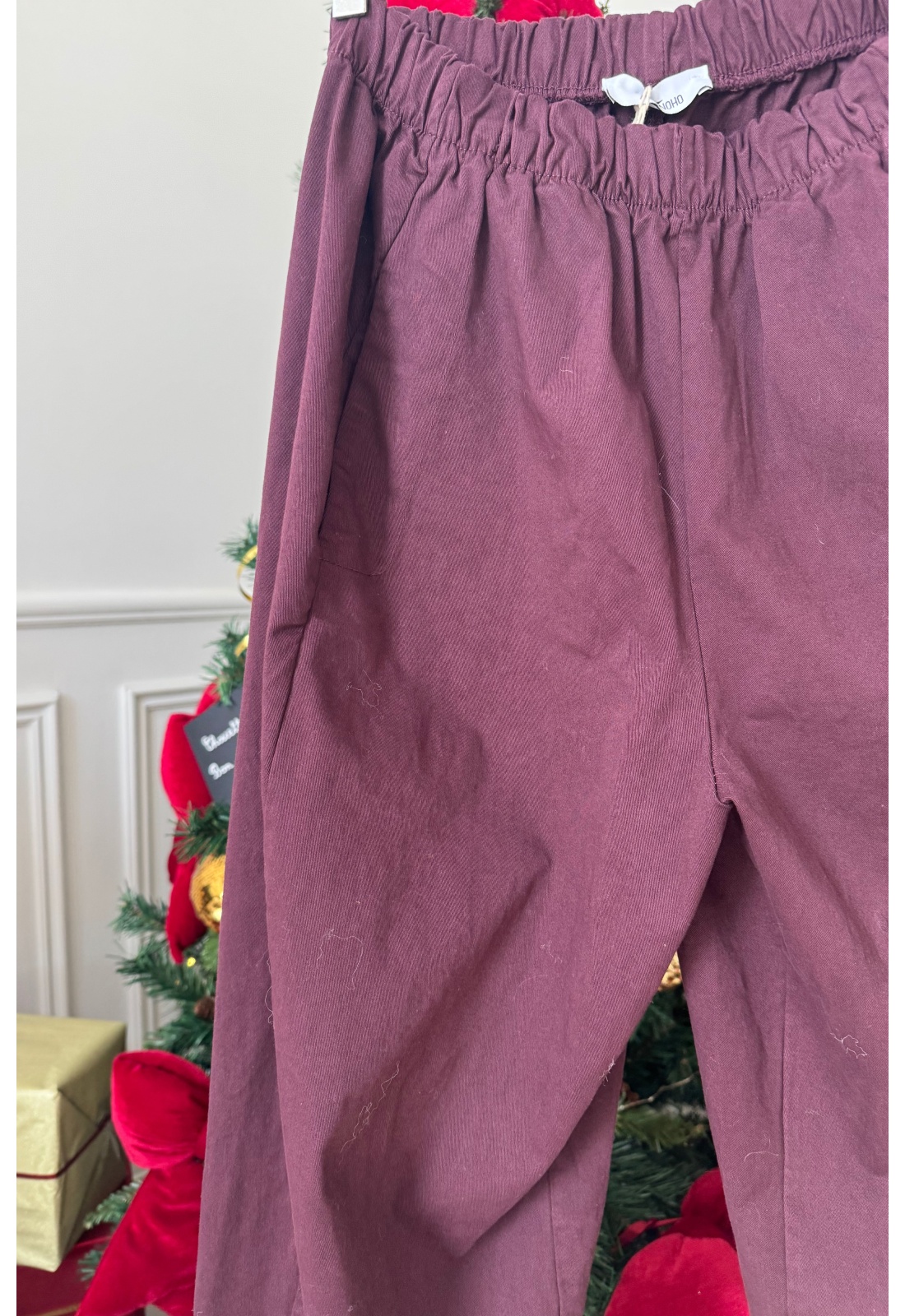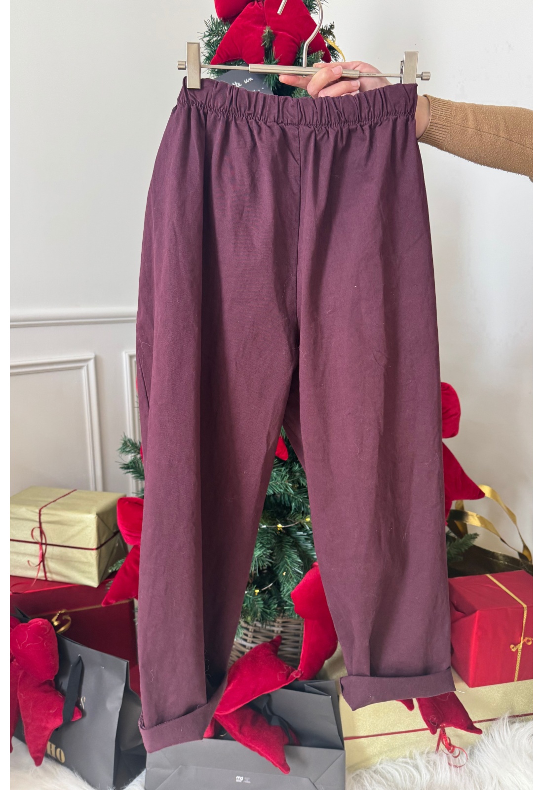 Pantalon pour femmes.De couleur bordeaux.Poches coupées.Elastique à la taille.Coupe droite et ample.Composition :95% Coton.5% Elasthanne.Fabriqué en Italie.Ce pantalon peut convenir d'une taille 34 à un 42.