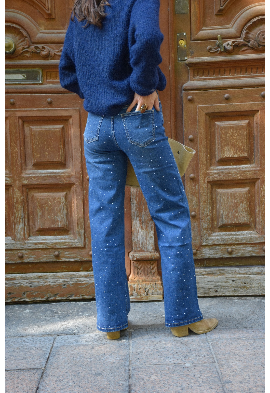 Jean denimStrass sur son ensembleFermeture à boutons et éclairePoches avant, poches arrière, poches pour monnaieTaille haute avec passantsCoupe droite