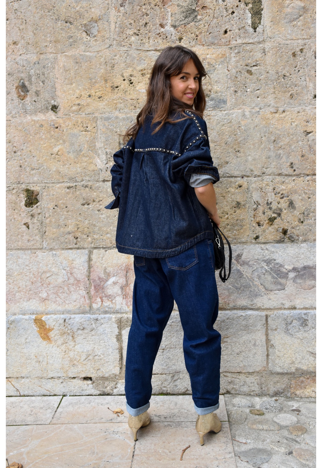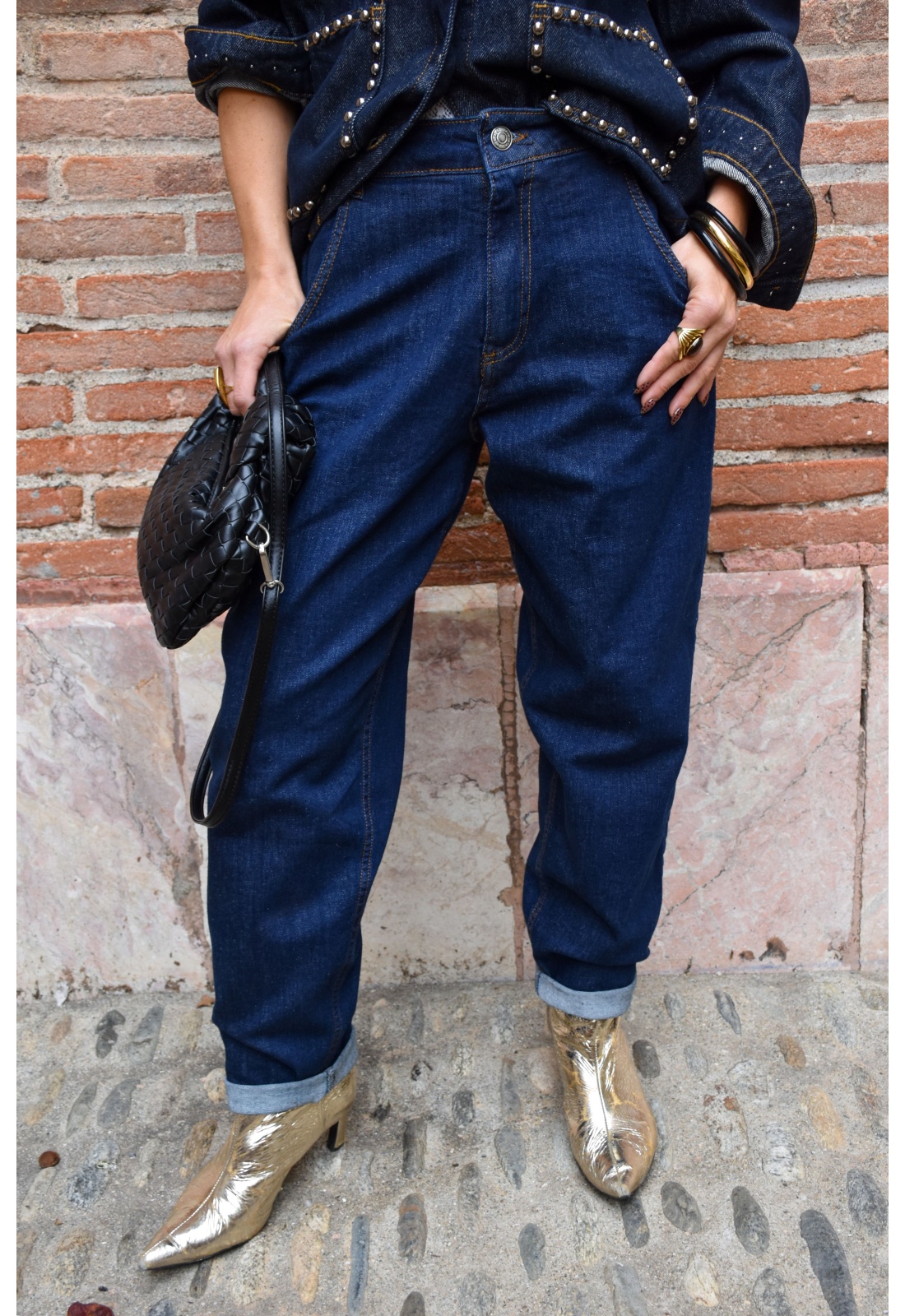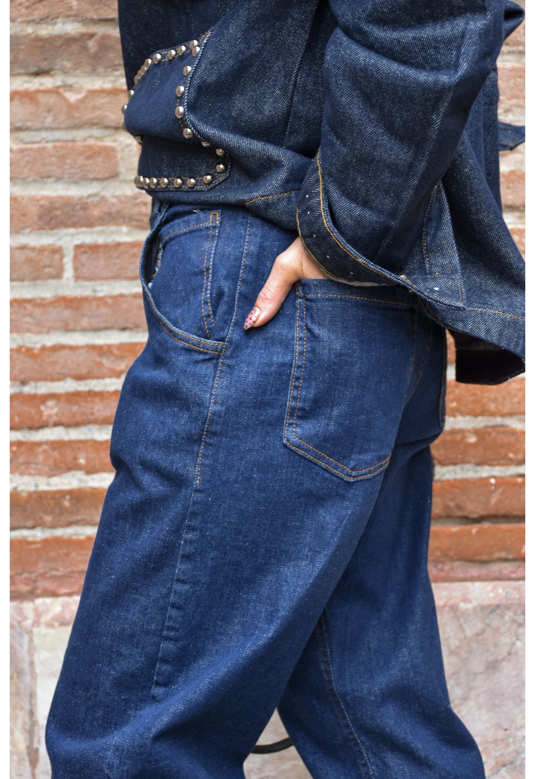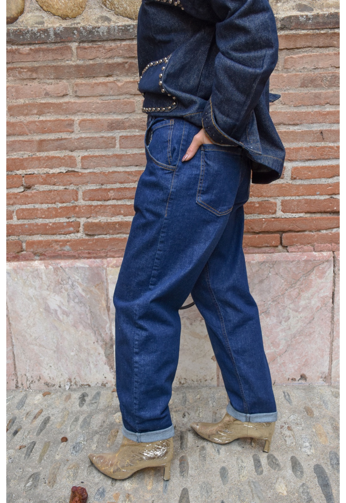 Jean brutFermeture à boutons et éclairePoches avant, poches arrière, poches pour monnaieTaille haute élastiqué avec passantsCoupe large