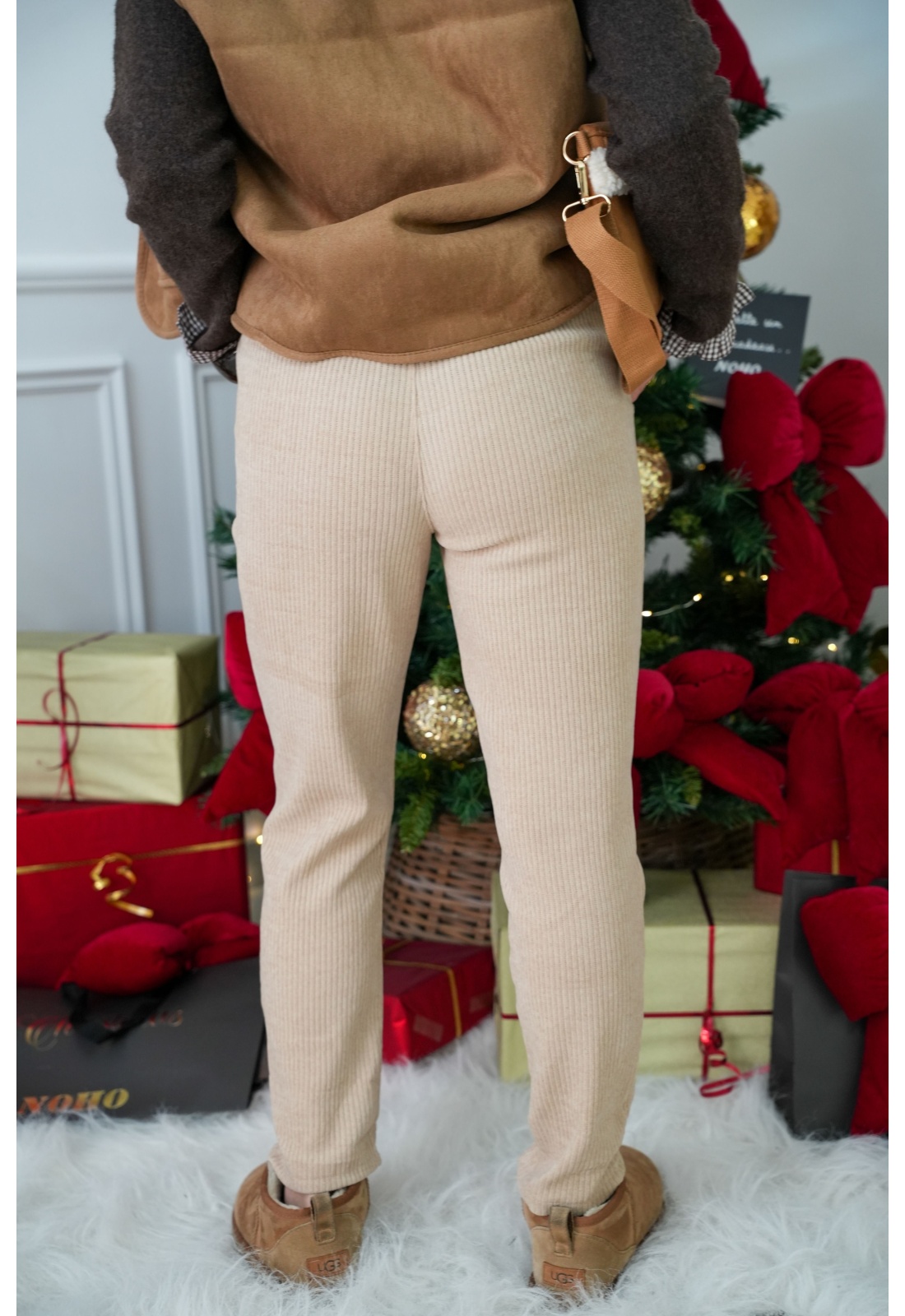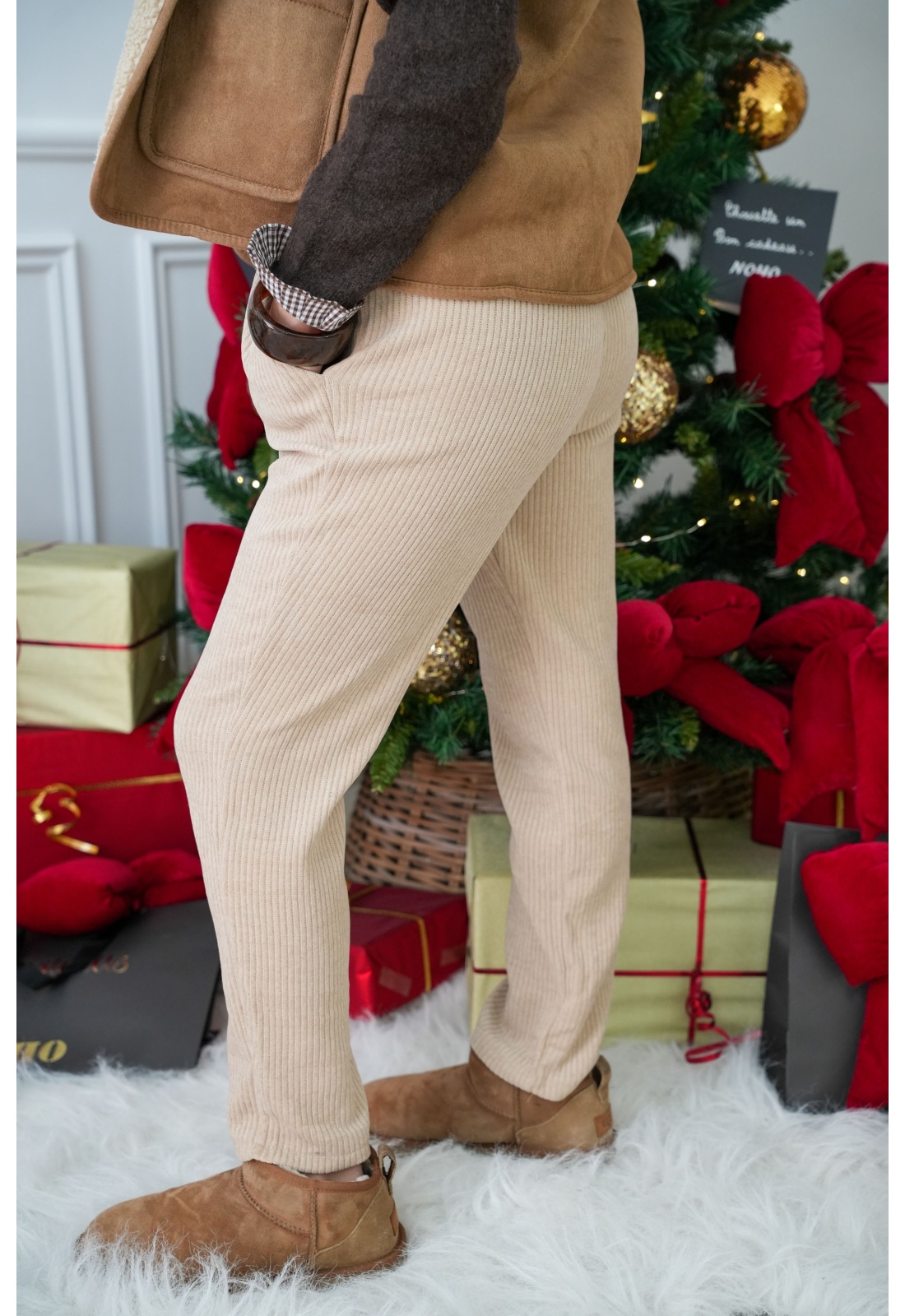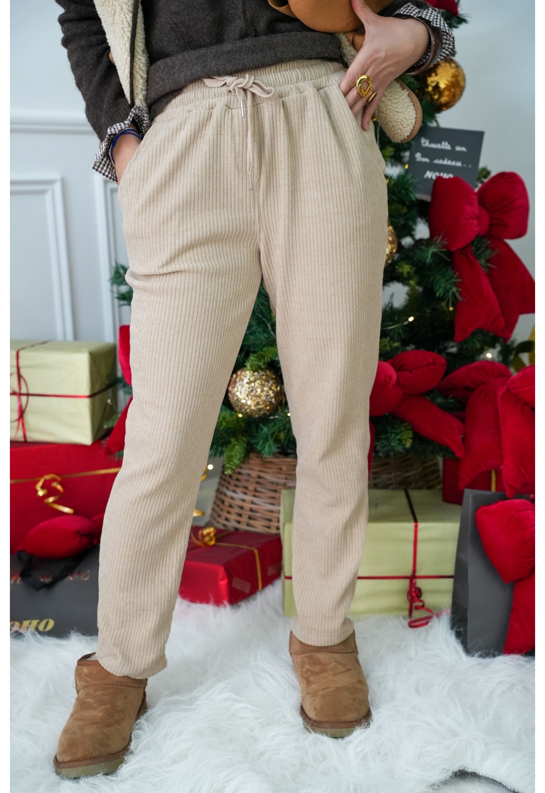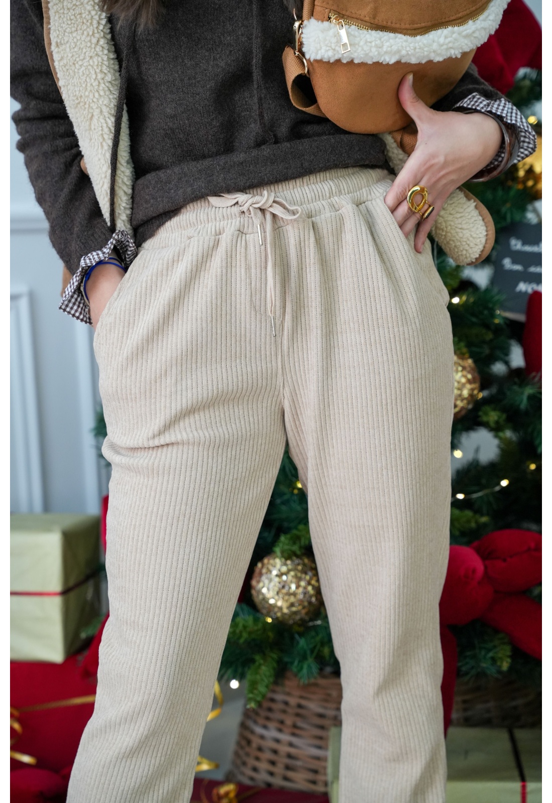 Pantalon pour femmesDe couleur beigeEn velours côteléCoupe cigaretteTaille élastiquée à lienAvec 2 poches coupéesMatière légèrement élastiqueComposition :95% Polyester.5% Elasthanne.Le mannequin porte une taille S et mesure 163cm.