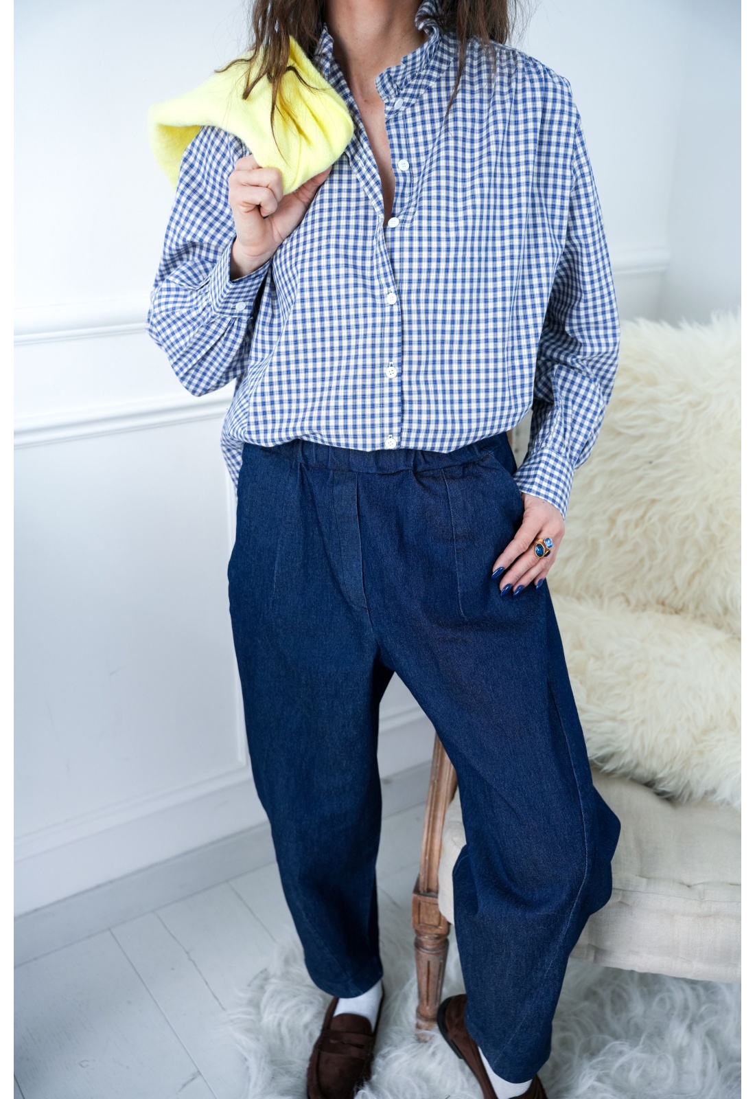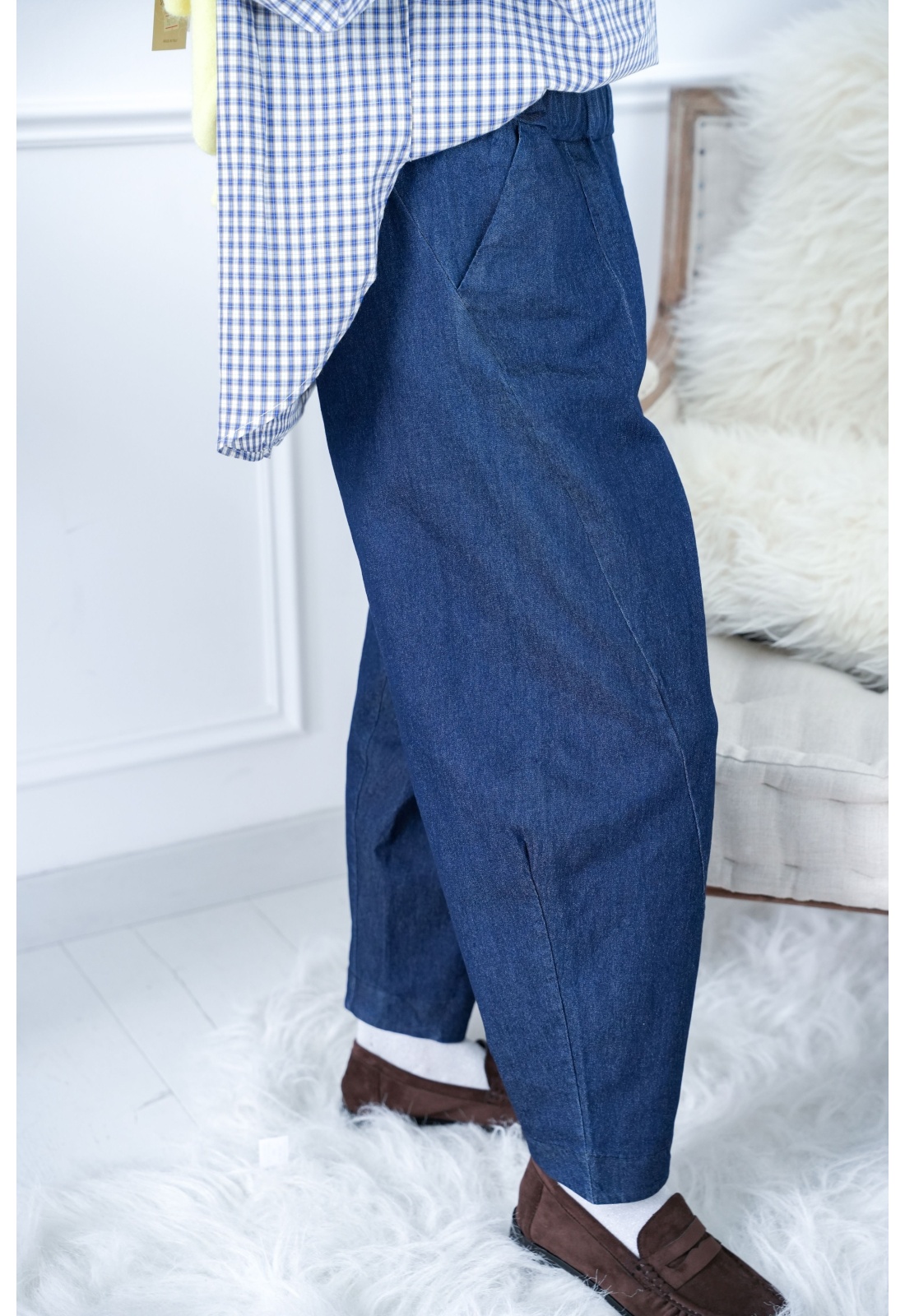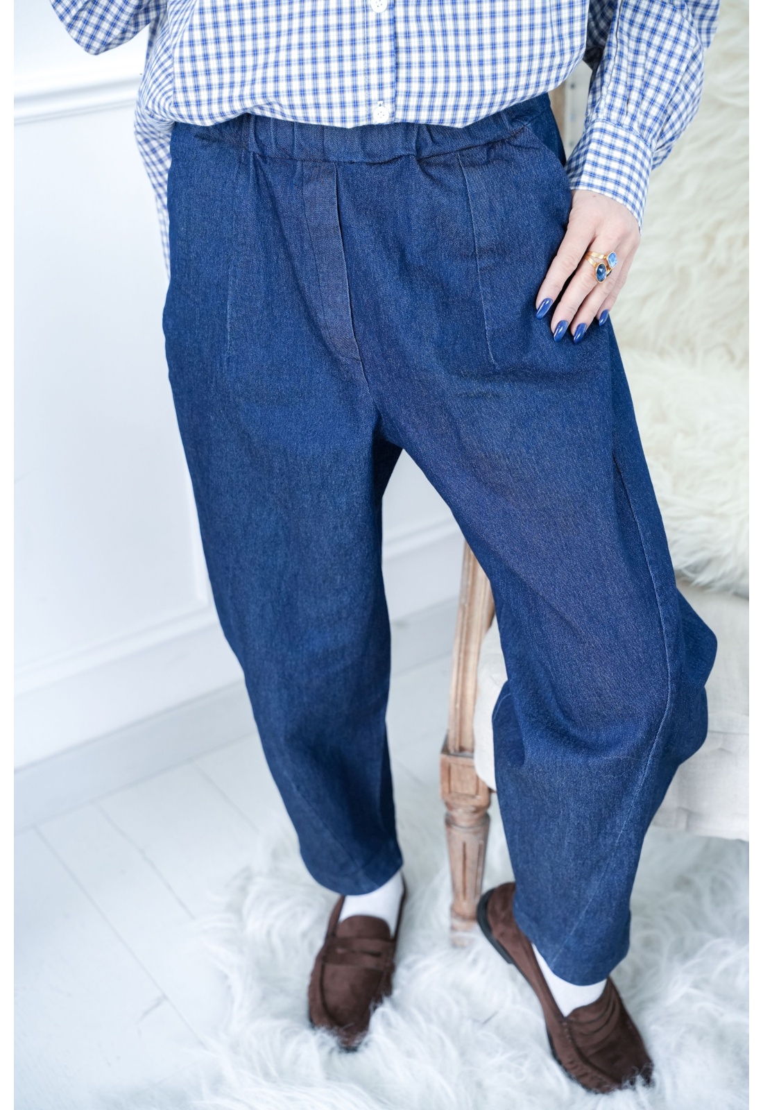 Jean pour femmes.De couleur brut.Coupe ballon.Taille élastique.Poches coupées à l'avant.Composition :70% Coton.27% Polyester.3% Elasthanne.Fabriqué en Italie.La mannequin porte une taille M et mesure 160cm.