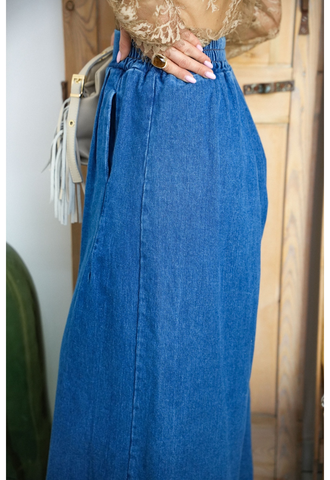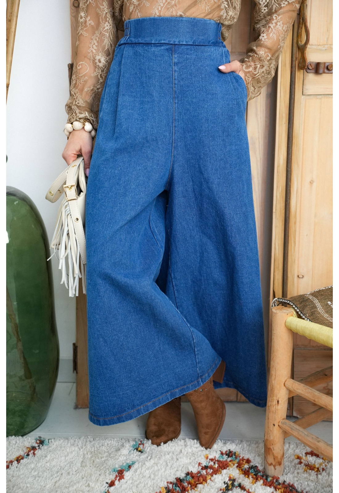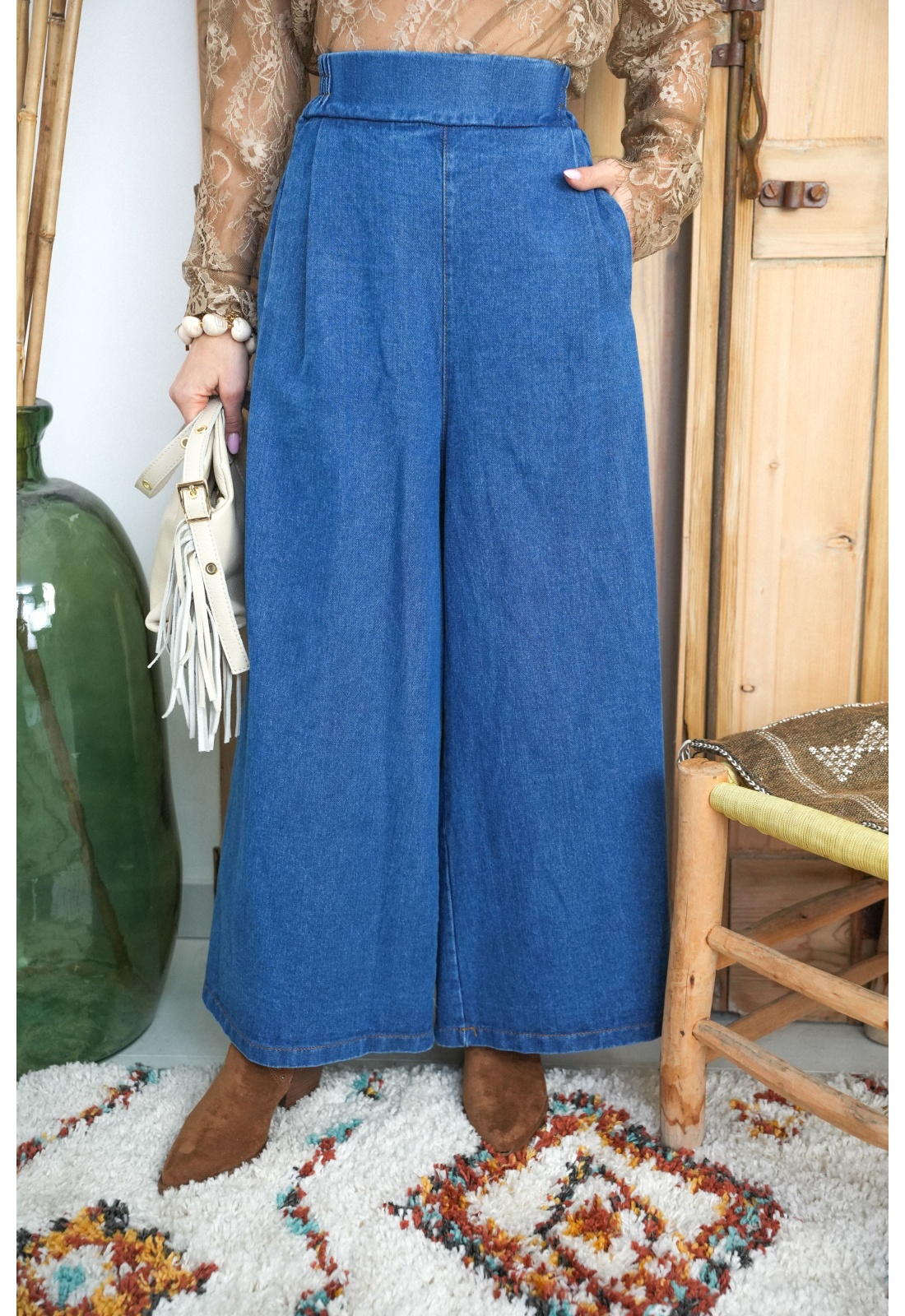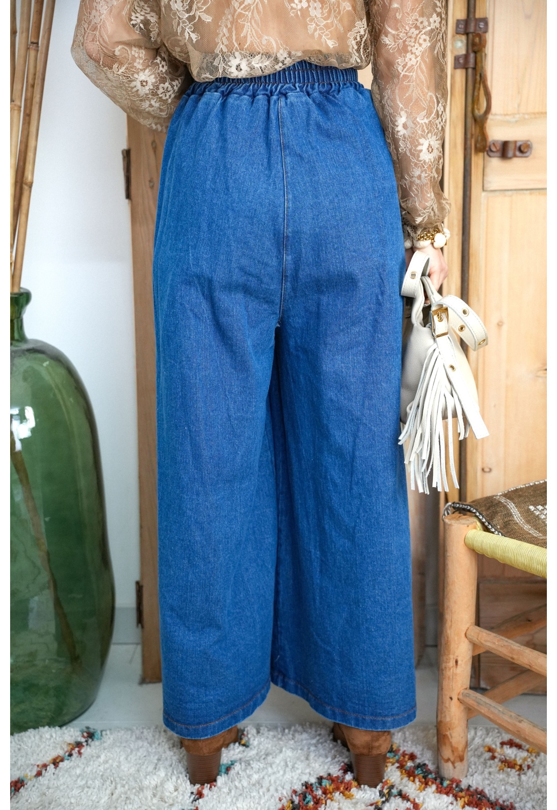 Jean pour femmes.De couleur bleu.Surpiqures camel.De marque Johanna Paris.Coupe très ample.Taille élastiquée.2 poches de jean à l'avant.Composition :100% Coton.Fabriqué en Italie.La mannequin porte une taille S et mesure 160cm.