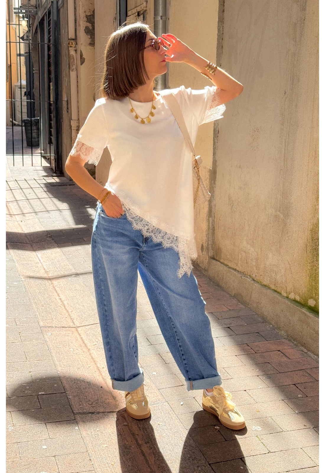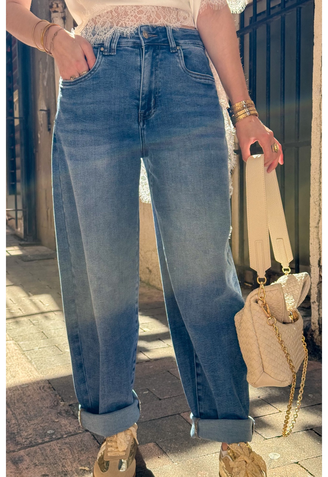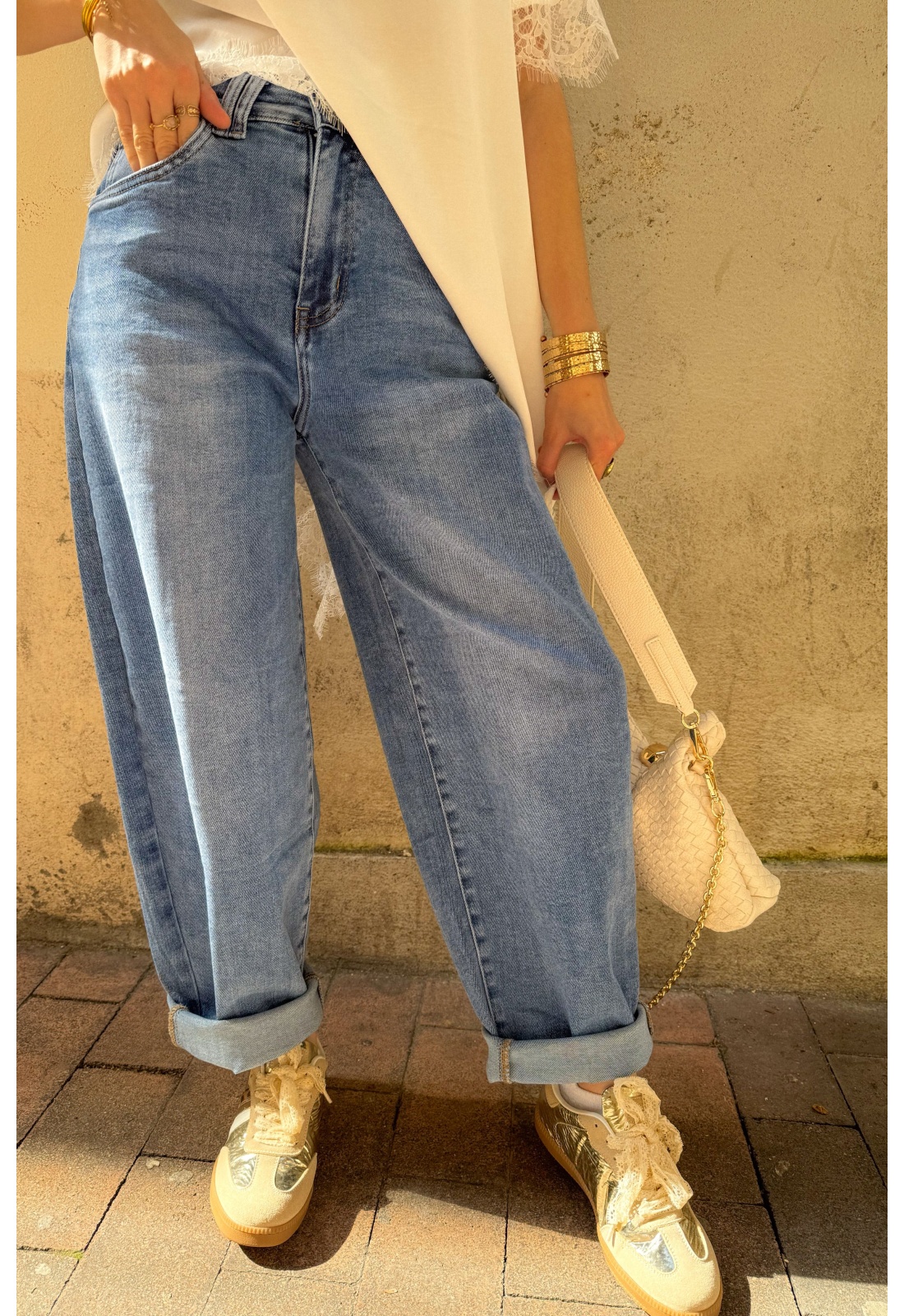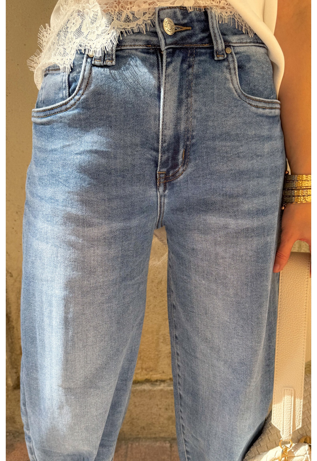 Jean bleu pour femme.Légèrement barrel.Deux poches plaquées arrières.Cinq passants pour ceinture.Composition : 68% de coton.27% Polyester.3% Viscose2% d'élasthanne.Le mannequin porte une taille XS et mesure 160cm.