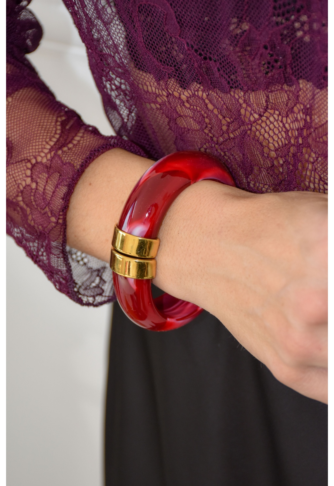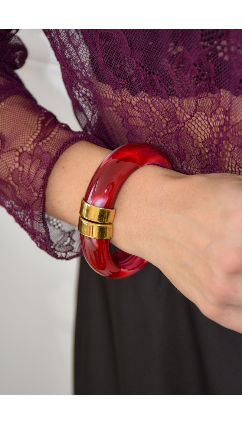 Jonc pour femmes.De couleur bordeaux.Effet marbré.En résine.Détail doré.Fermoir à bascule.