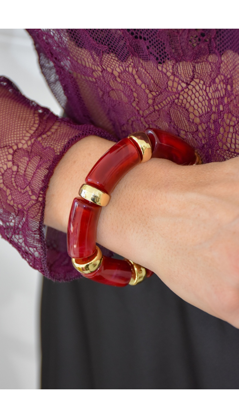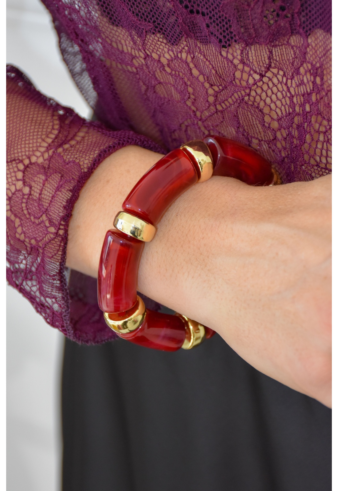 Bracelet pour femmes.De couleur bordeaux.Effet marbré.En perle tube.Avec perles dorées.Elastique.