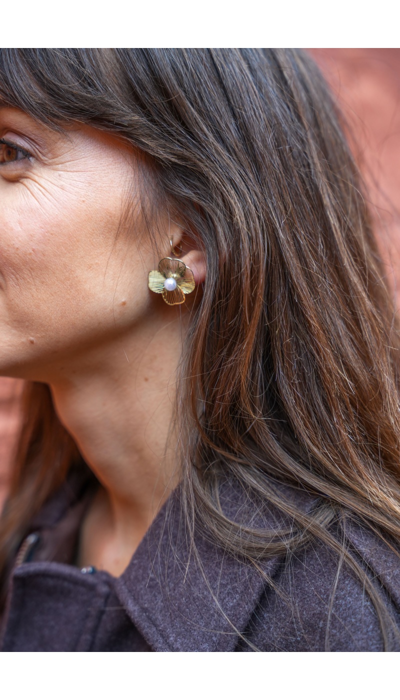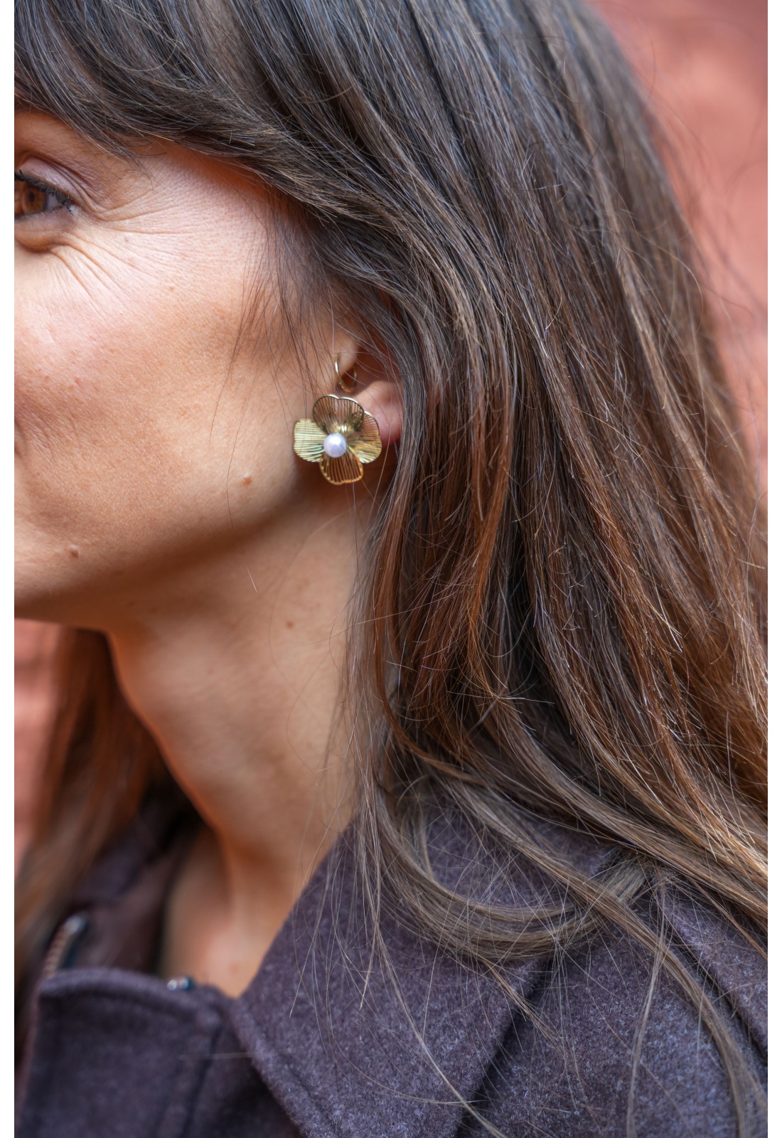 Boucles d'oreilles pour femmes.De couleur dorées.En forme de fleurs.Centre avec une perle nacrée.Composition :100% Acier Inoxydable.