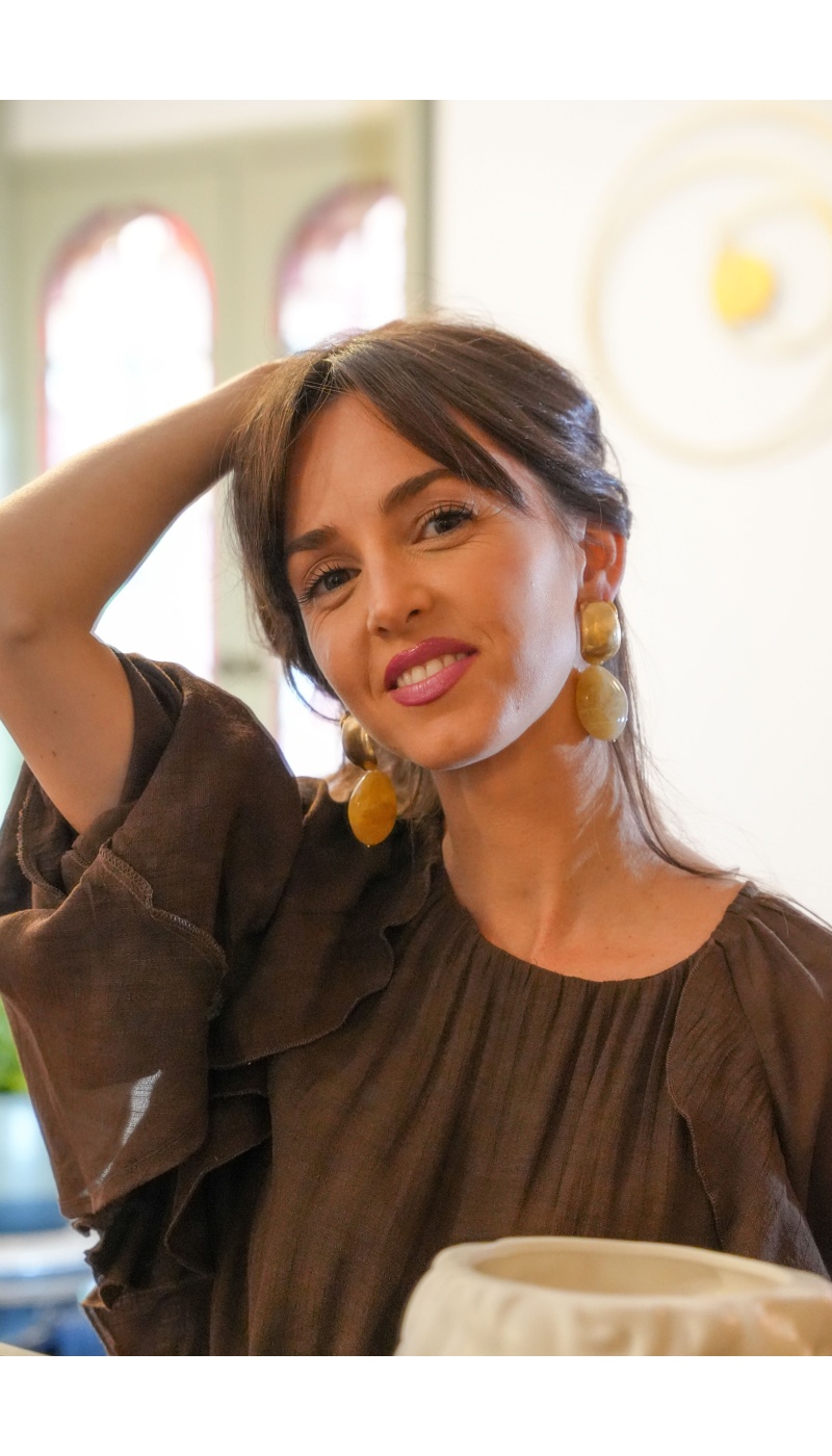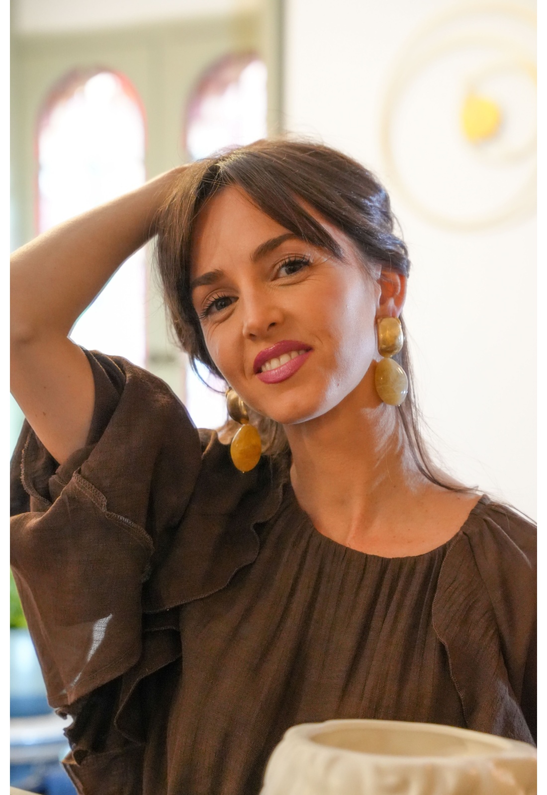 Boucles d'oreilles pour femmes.De couleur dorées.Avec pierres marbrées beige.Pendantes.Composition :100% Acier Inoxydable.